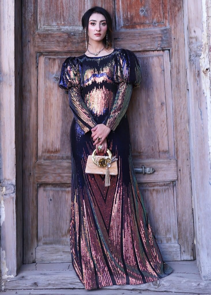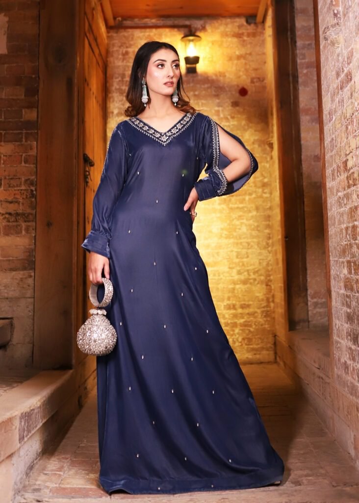 Rich and luxurious fabrics, including silk, chiffon, and velvet, brought to life with unparalleled craftsmanship and attention to detail.
