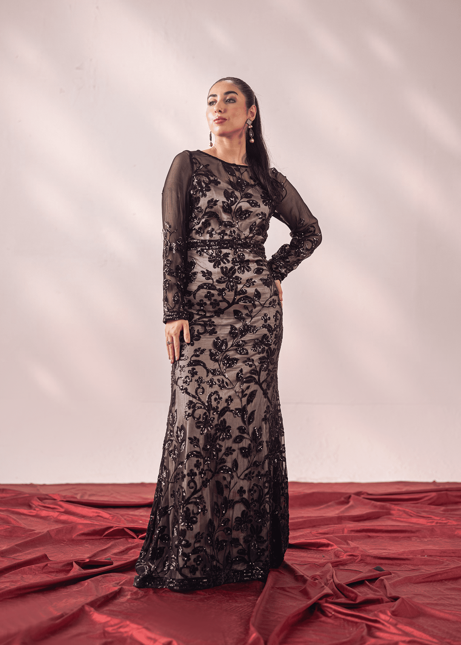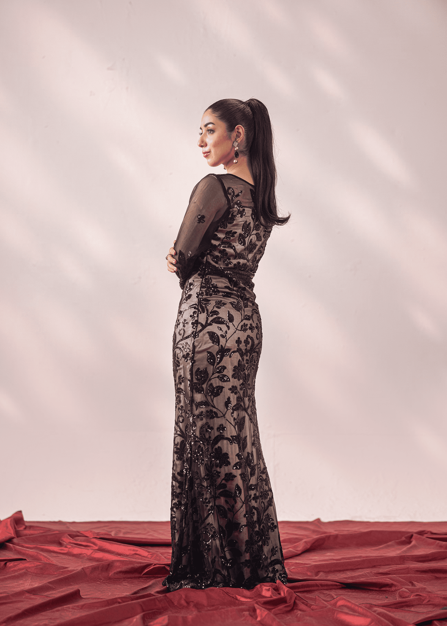 A one-piece gown in black and beige, crafted from silk and chiffon. The sheer overlay is adorned with floral patterns, creating a striking play of contrast and festive sophistication.