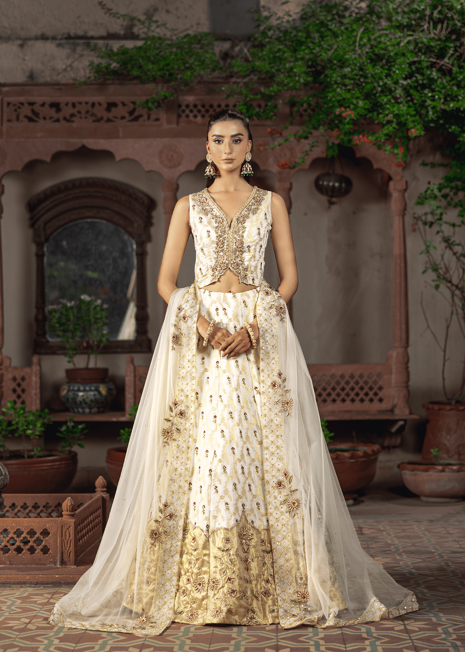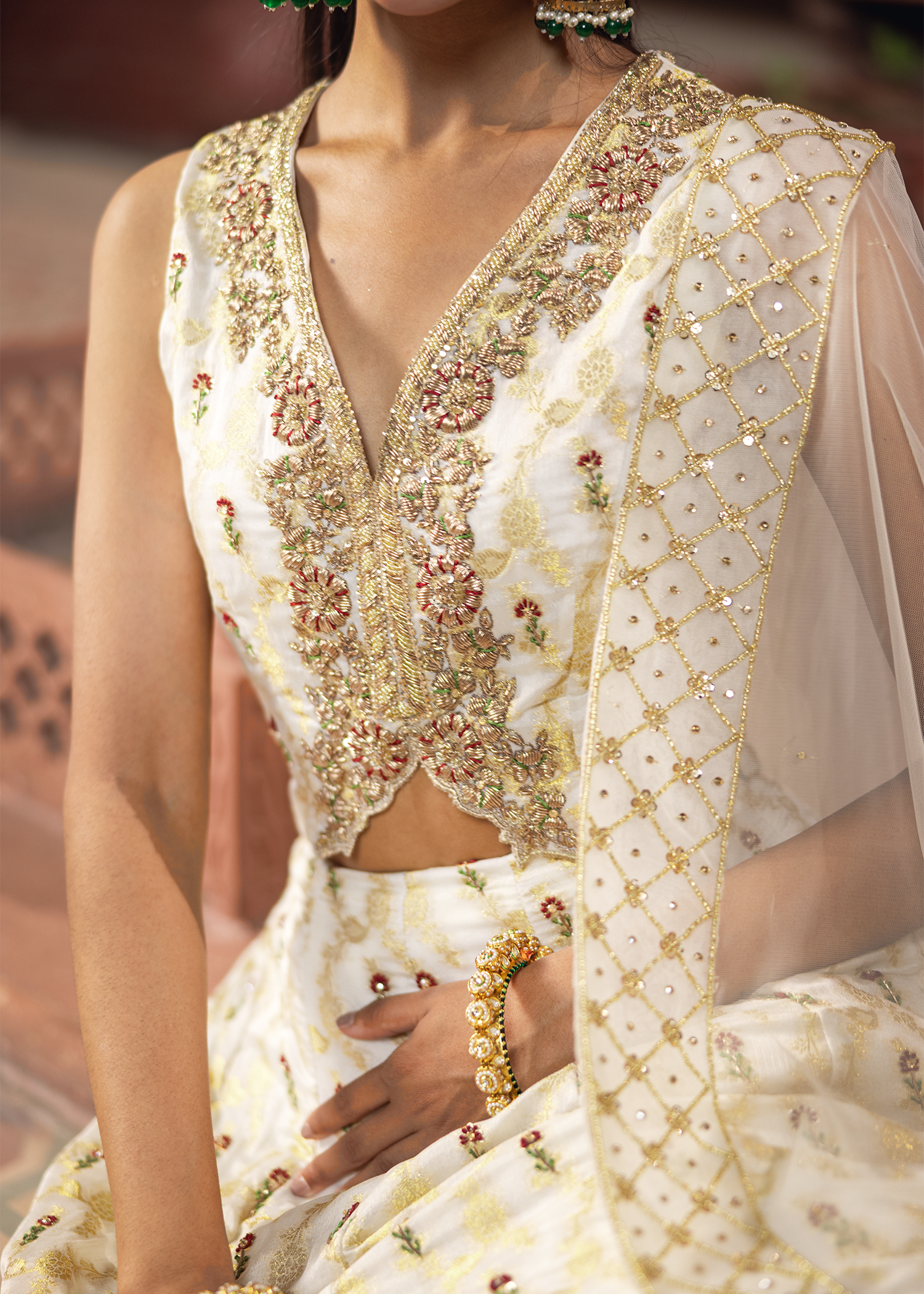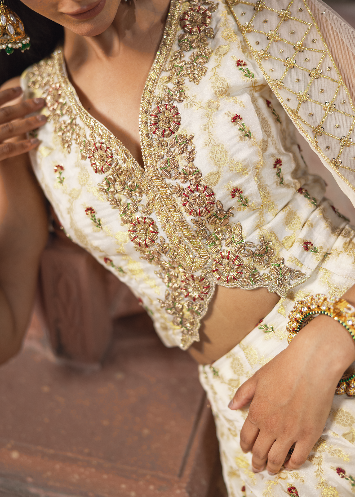 A graceful dreamy white-gold jamawar lehenga set, exquisitely detailed with zardozi artistry. Featuring resham, dapka, beads, sequins, and Swarovski embellishments, the design blends luminous texture with refined craftsmanship, creating a timeless statement.