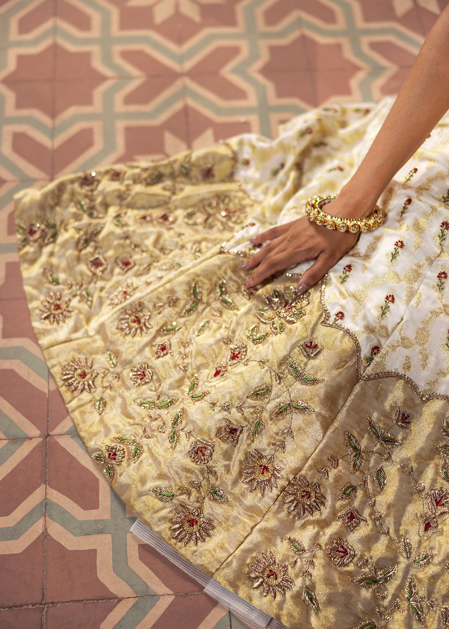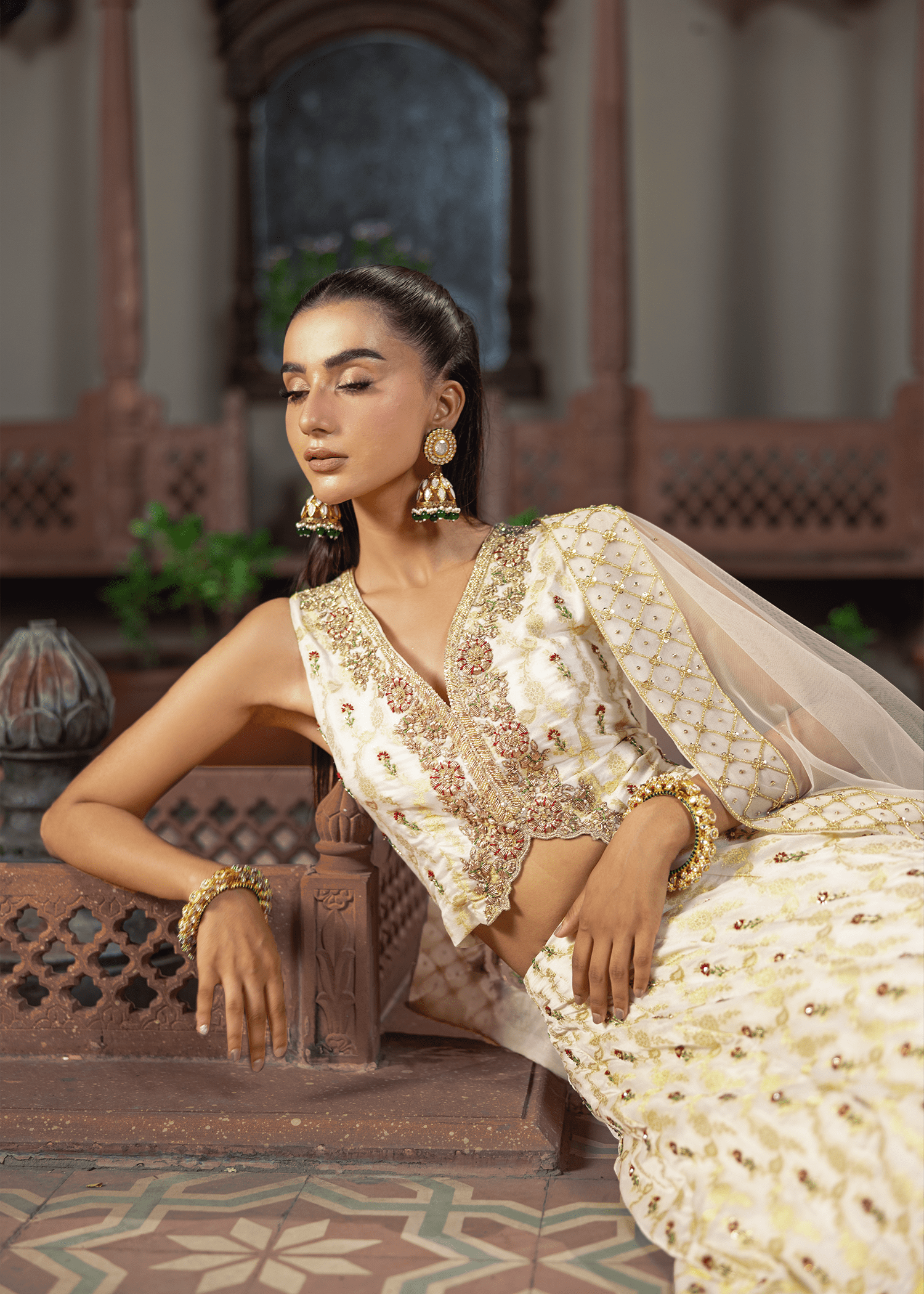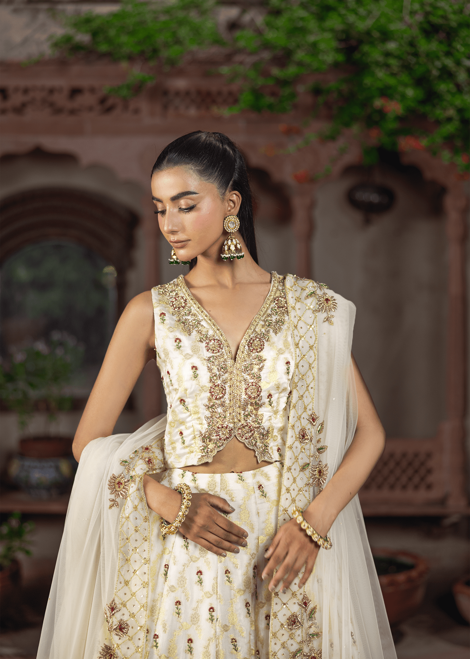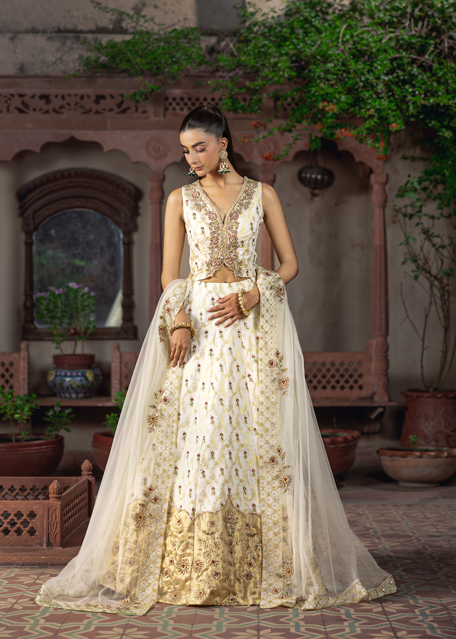 A graceful dreamy white-gold jamawar lehenga set, exquisitely detailed with zardozi artistry. Featuring resham, dapka, beads, sequins, and Swarovski embellishments, the design blends luminous texture with refined craftsmanship, creating a timeless statement.