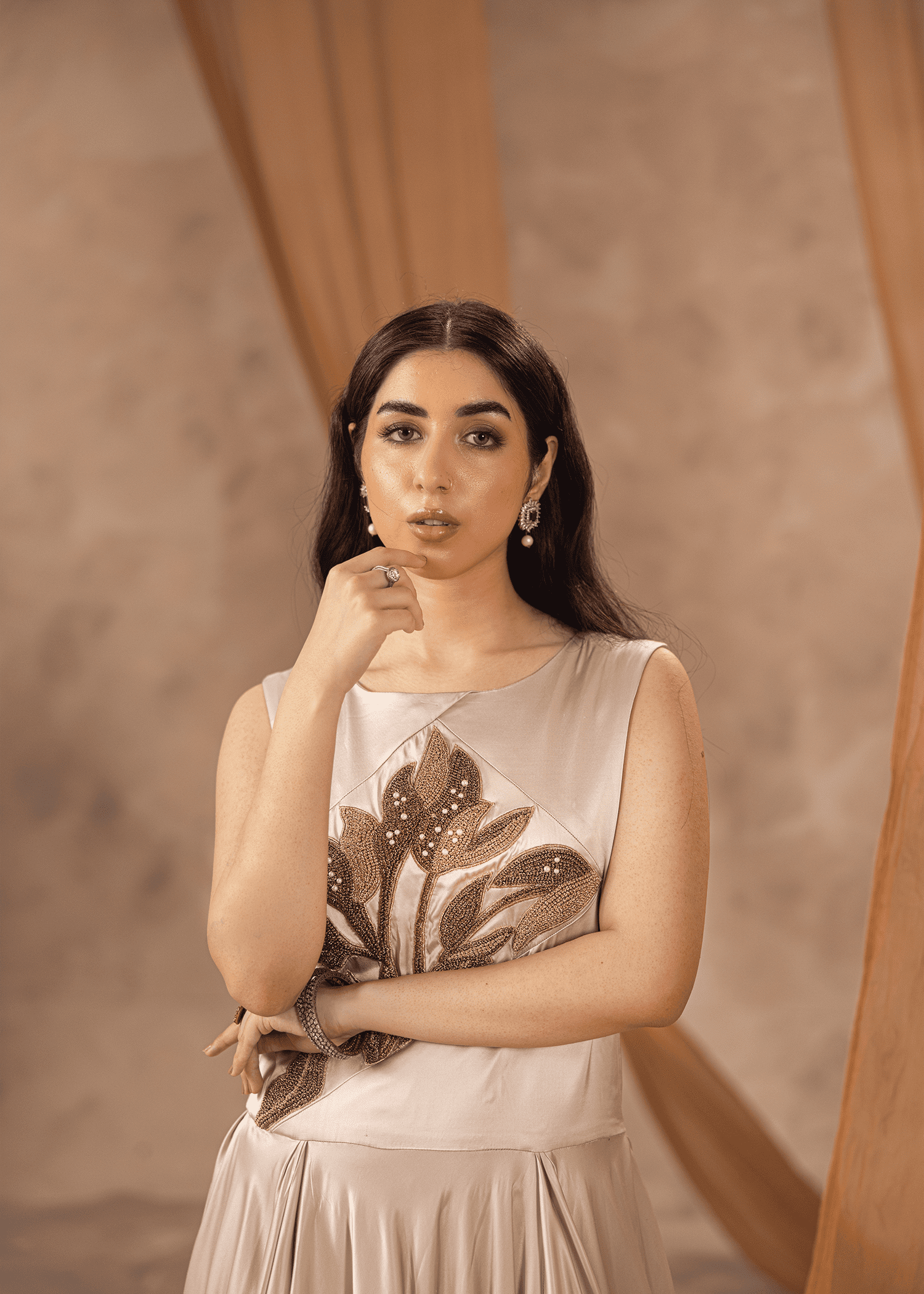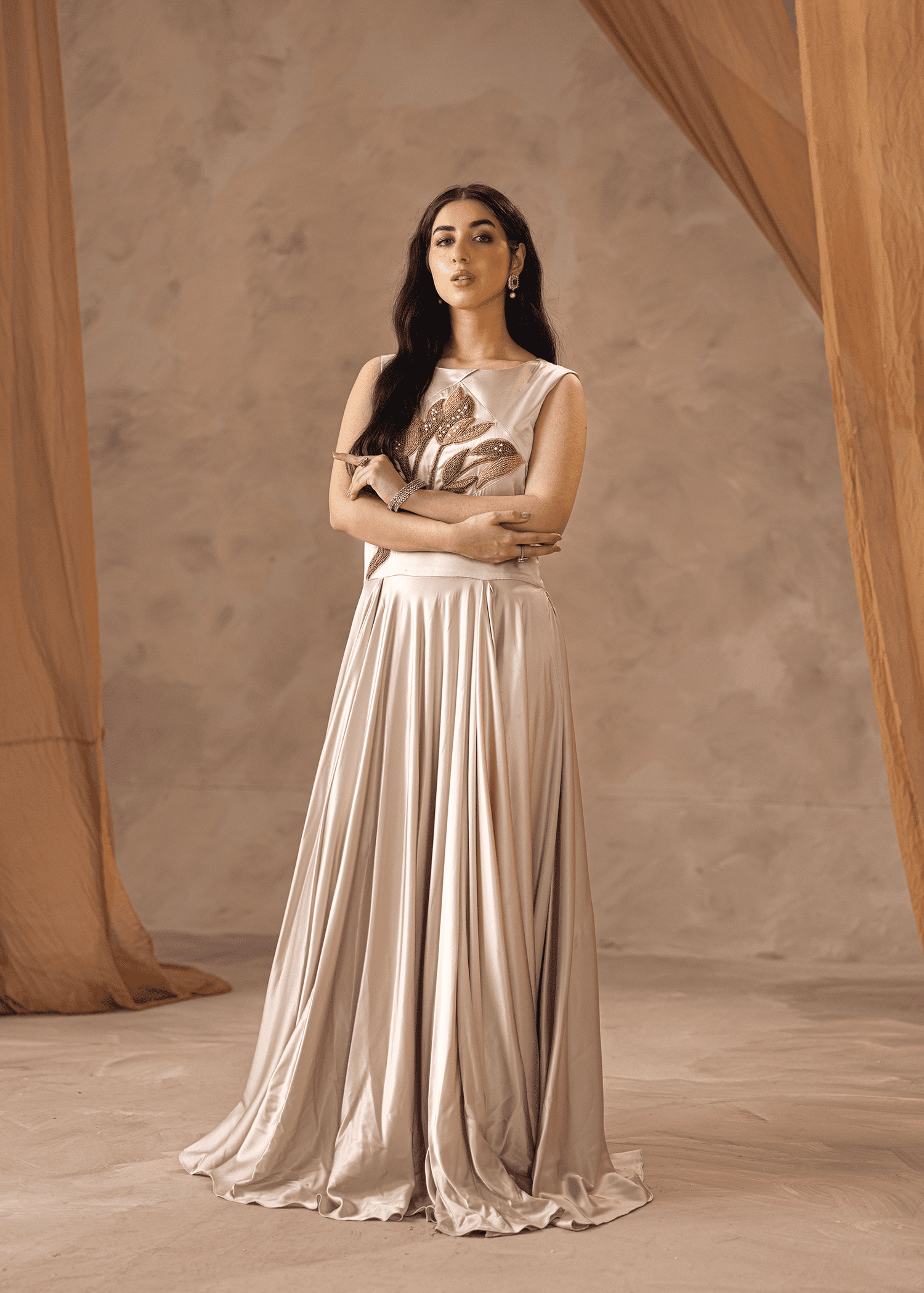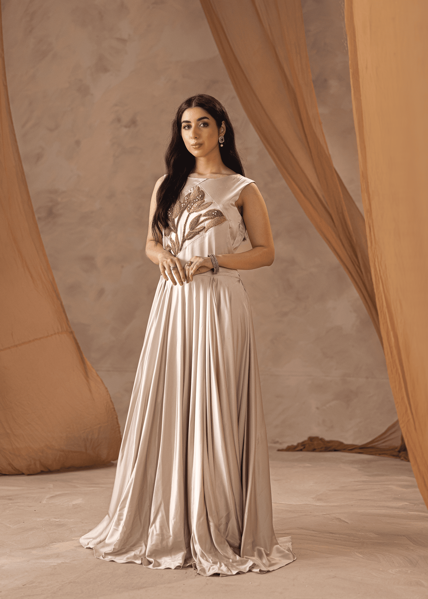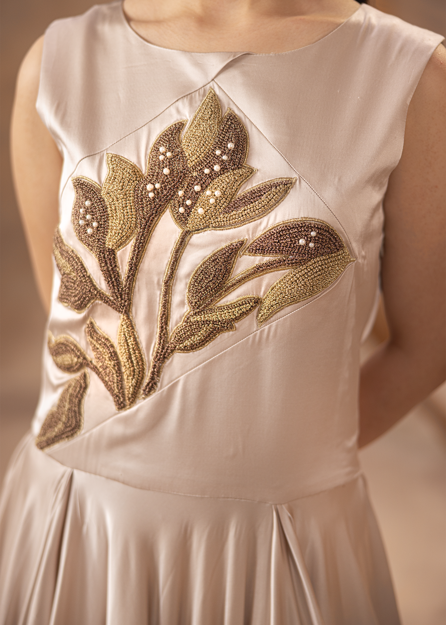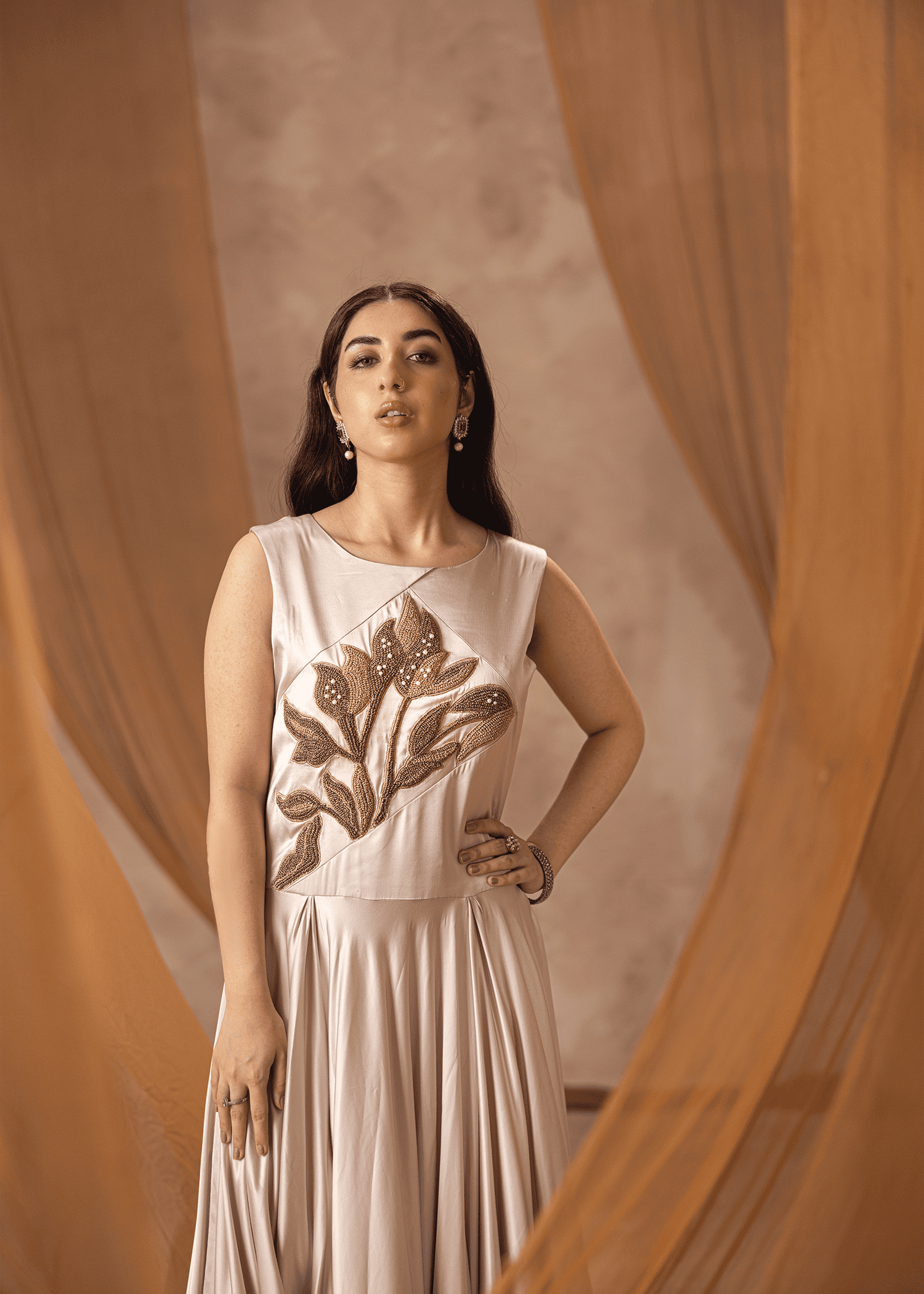 A one-piece gown in bare beige silk, hand-embroidered with fine tila thread. The bodice features intricate French knots, creating a textured elegance against the flowing skirt.