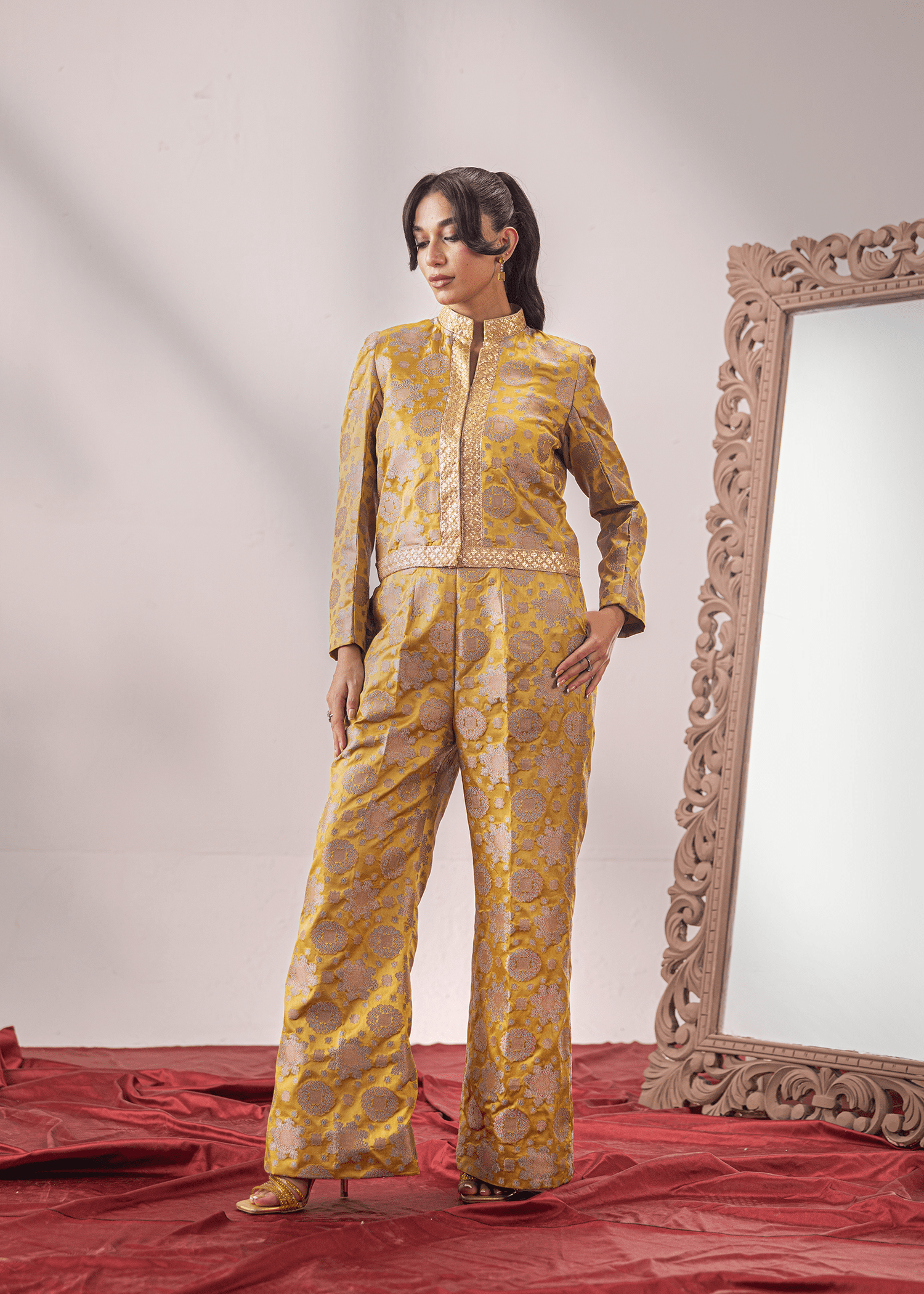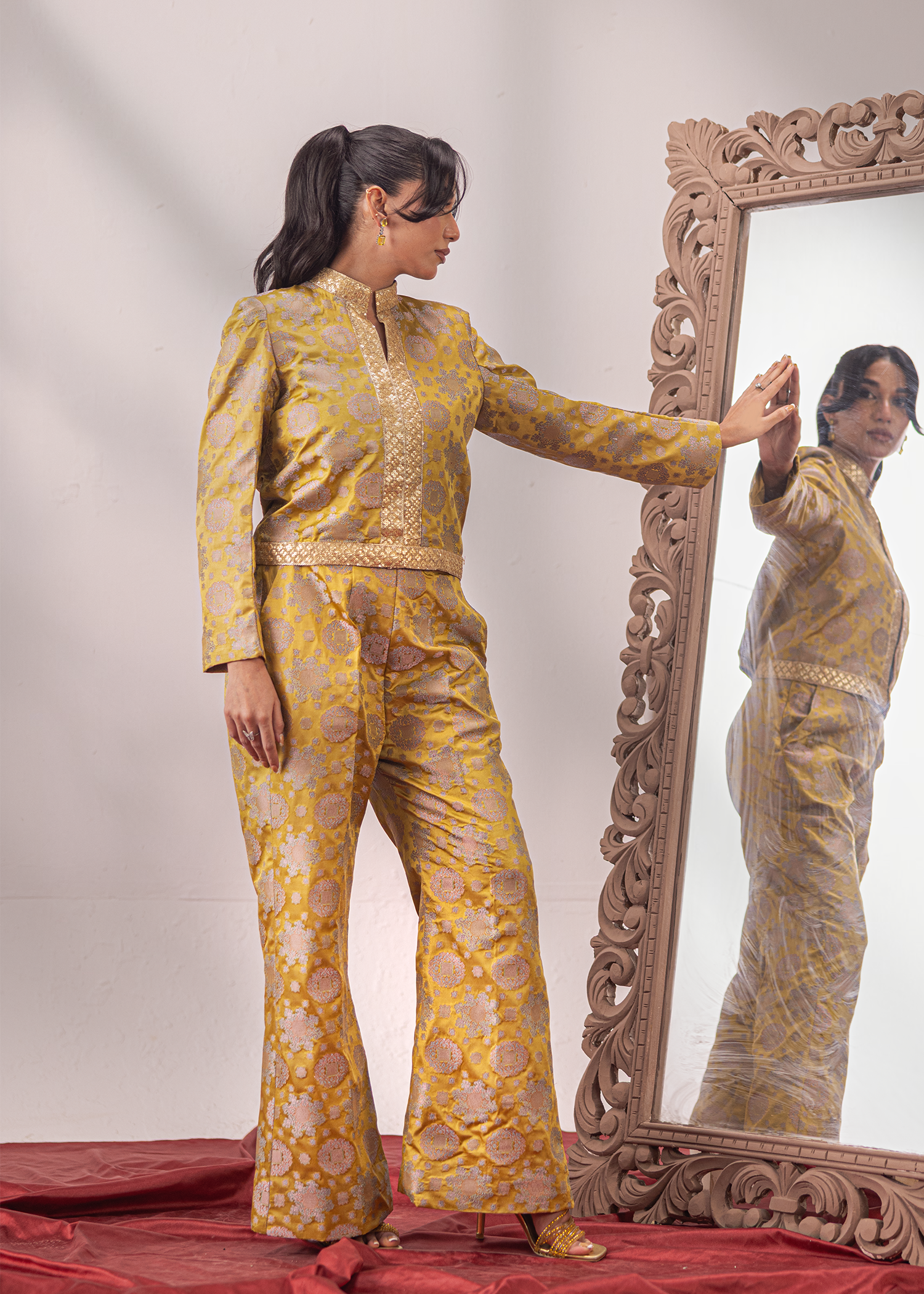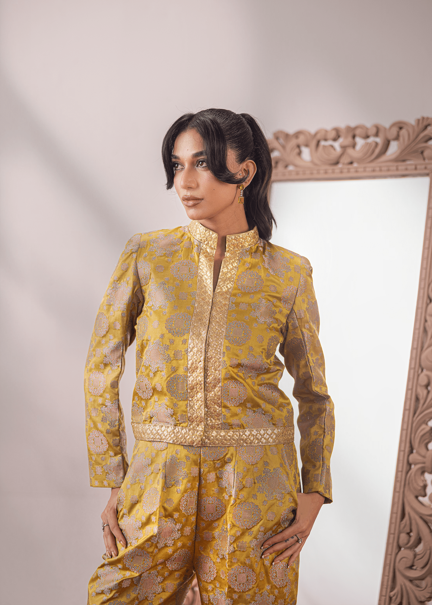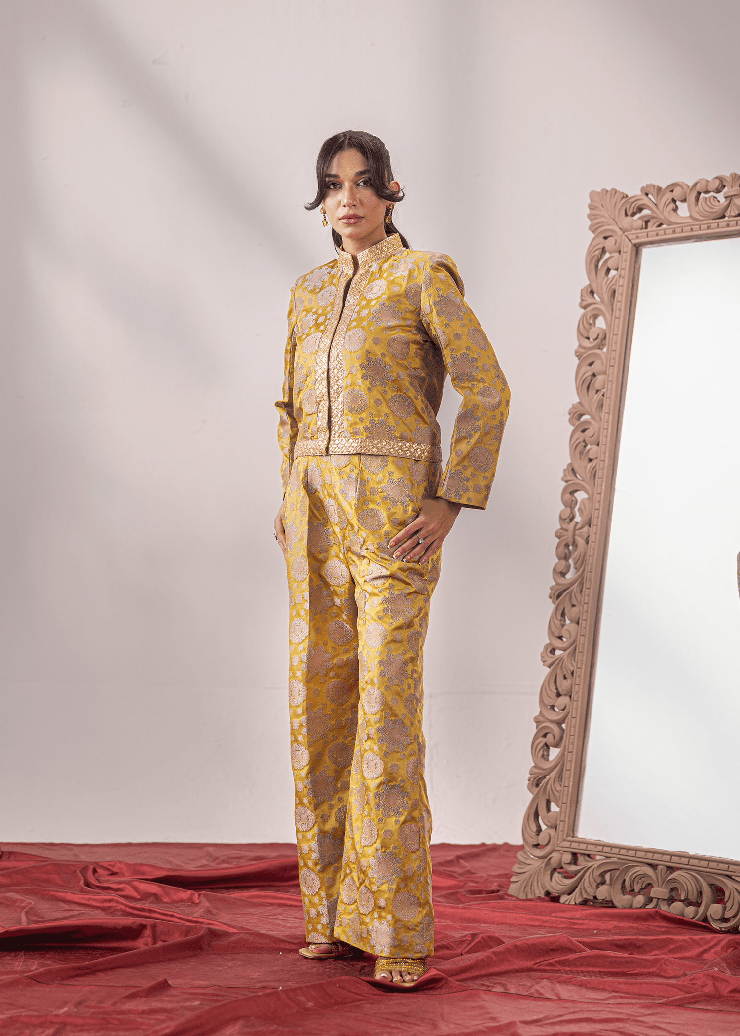 An exquisite two-piece in pea-soup green Banaras, crafted with meticulous attention to detail. The tailored blouse is adorned with delicate lace accents, adding a refined touch to the rich woven fabric. Paired with matching trousers, this ensemble blends timeless tradition with a contemporary silhouette, making it a statement piece for any elegant occasion.