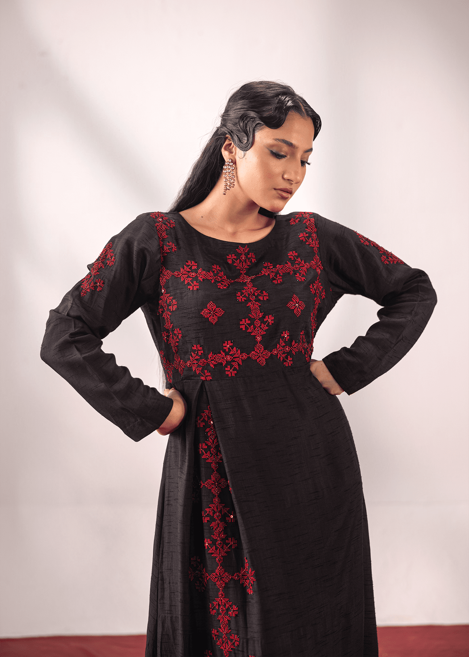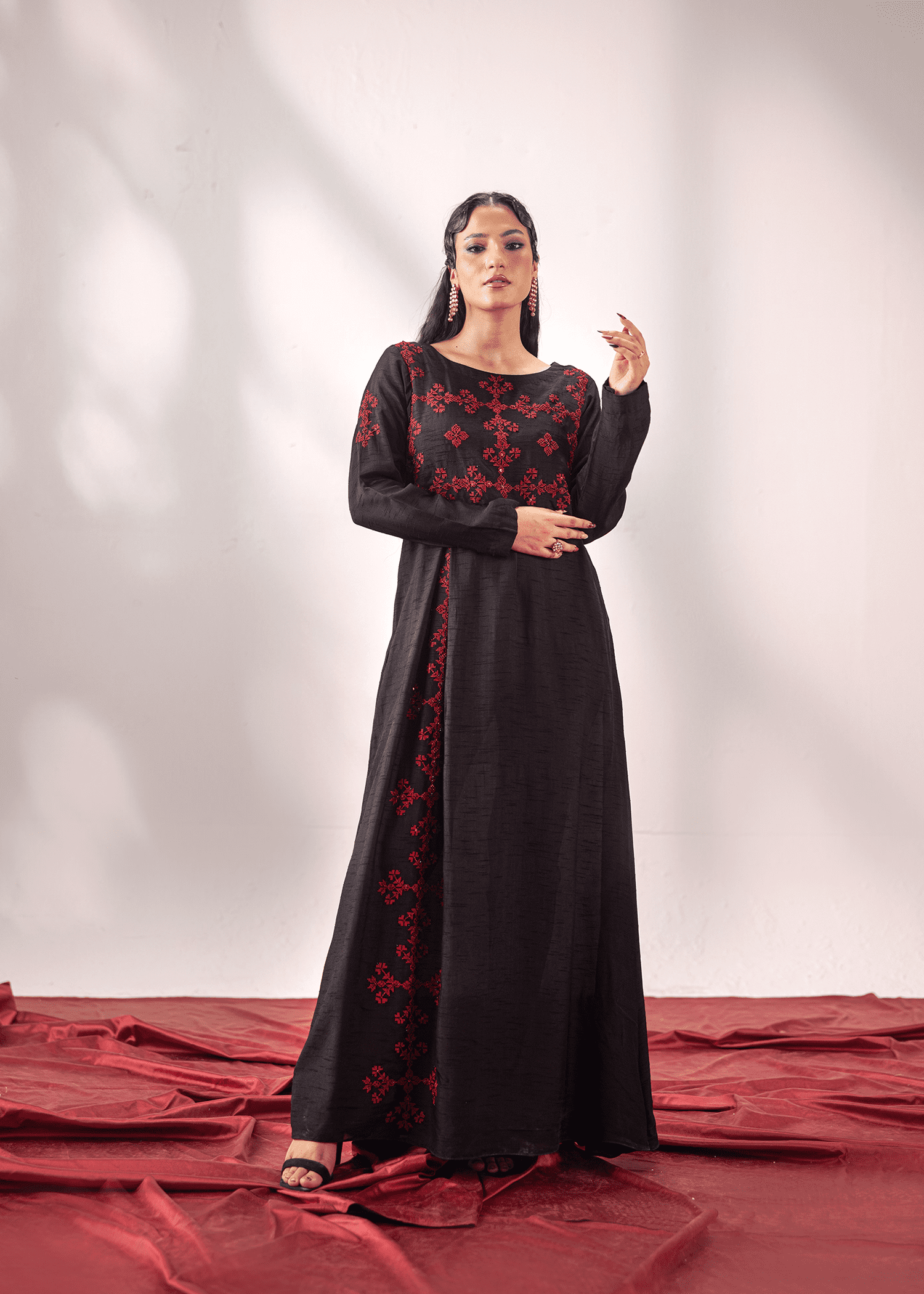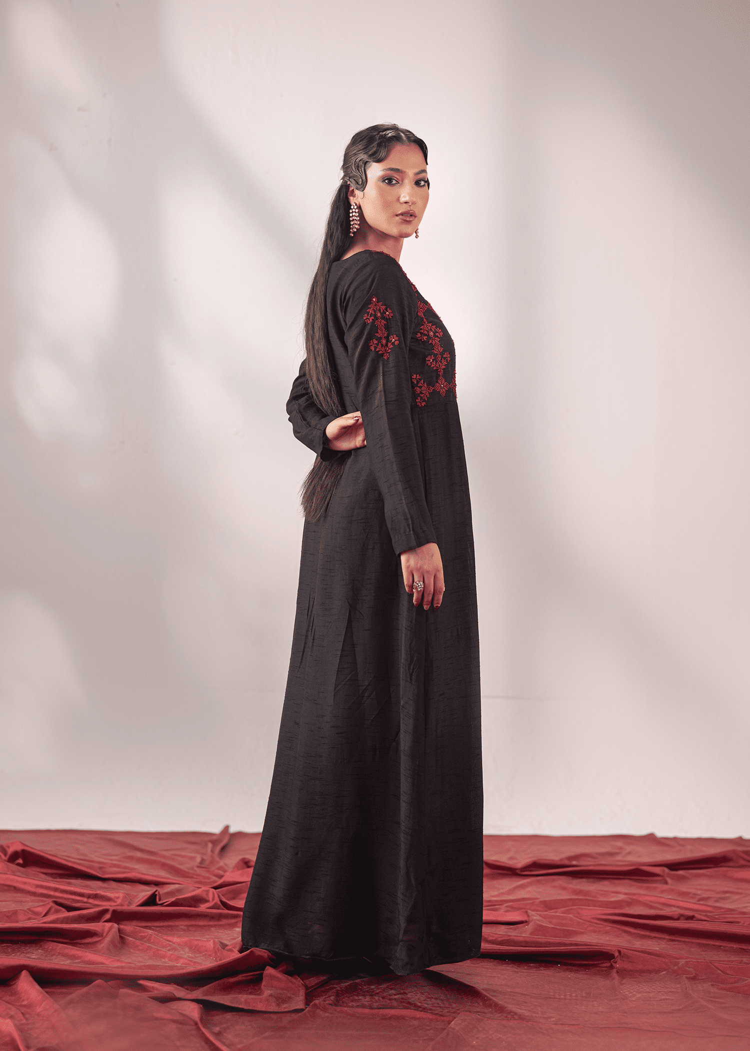 A timeless one-piece creation in deep black Korean silk, elevated with intricate hand embroidery and subtle embellishments. The refined detailing in red adds depth and drama, making this piece a statement of power, poise, and understated sophistication.