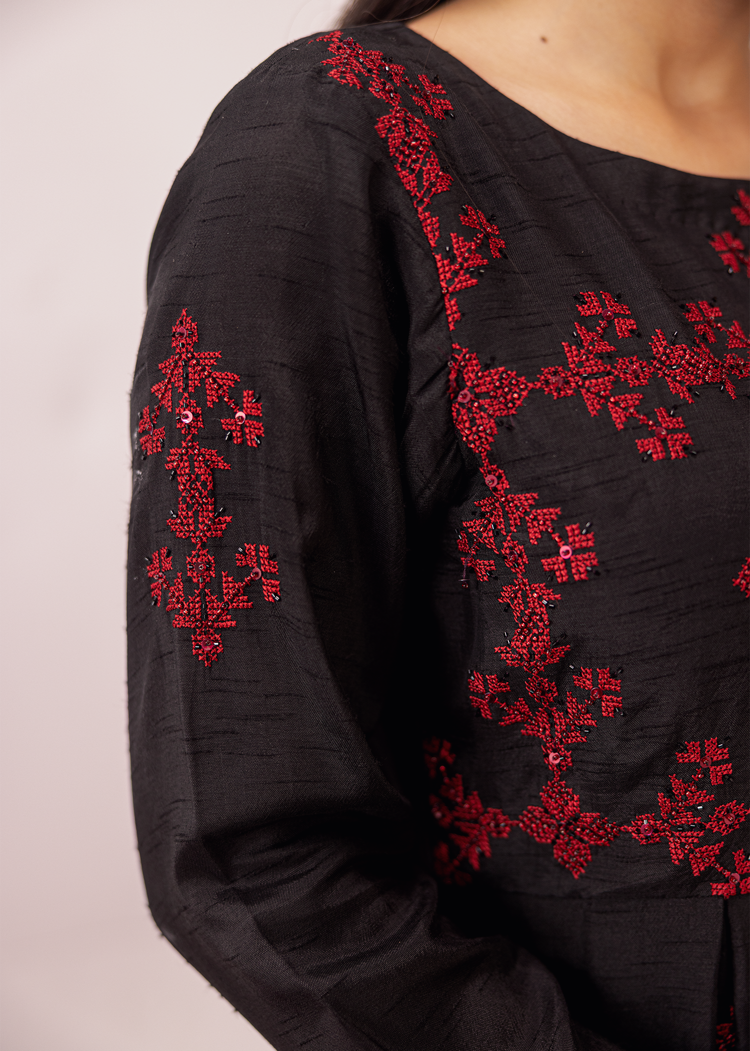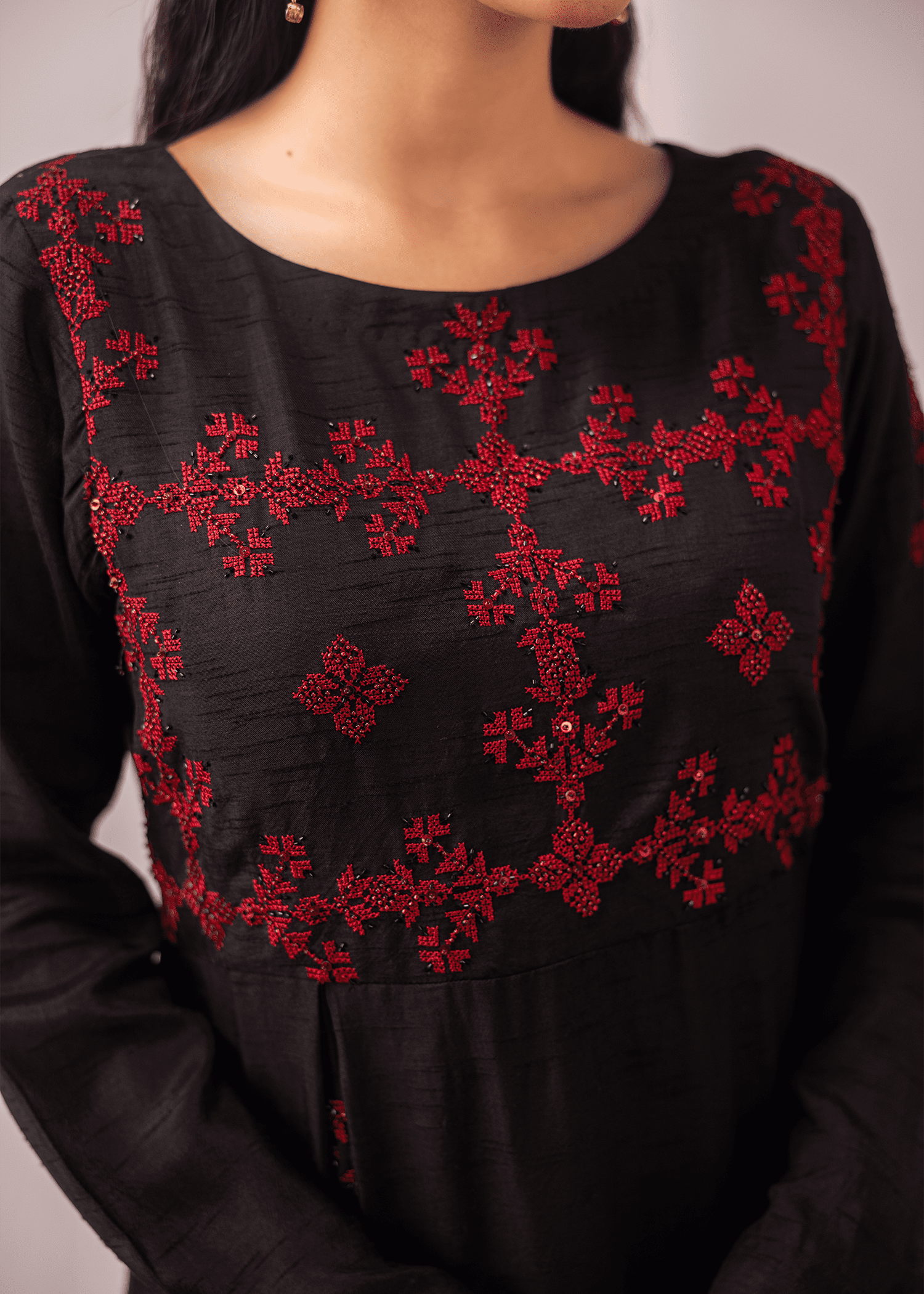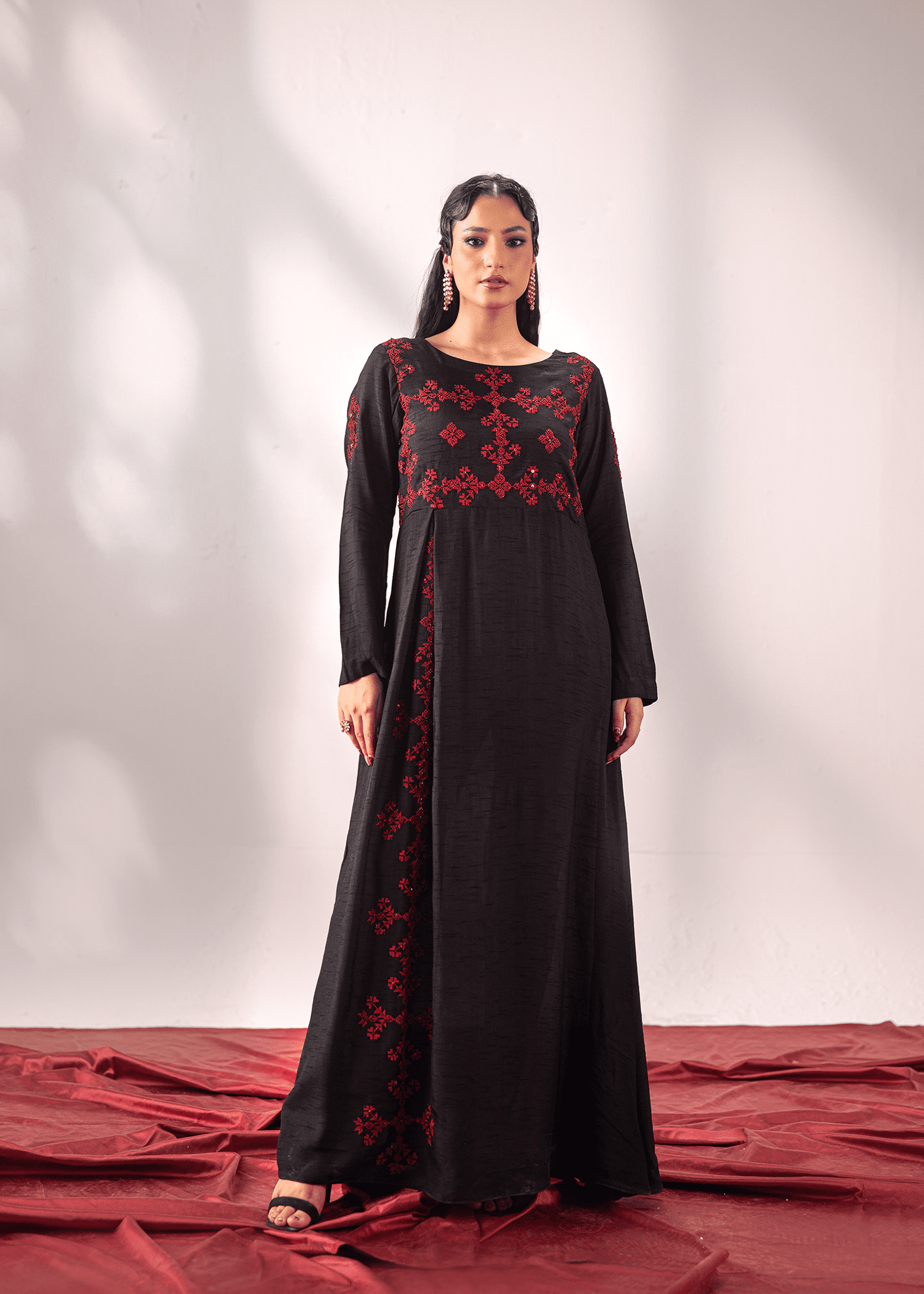 A timeless one-piece creation in deep black Korean silk, elevated with intricate hand embroidery and subtle embellishments. The refined detailing in red adds depth and drama, making this piece a statement of power, poise, and understated sophistication.