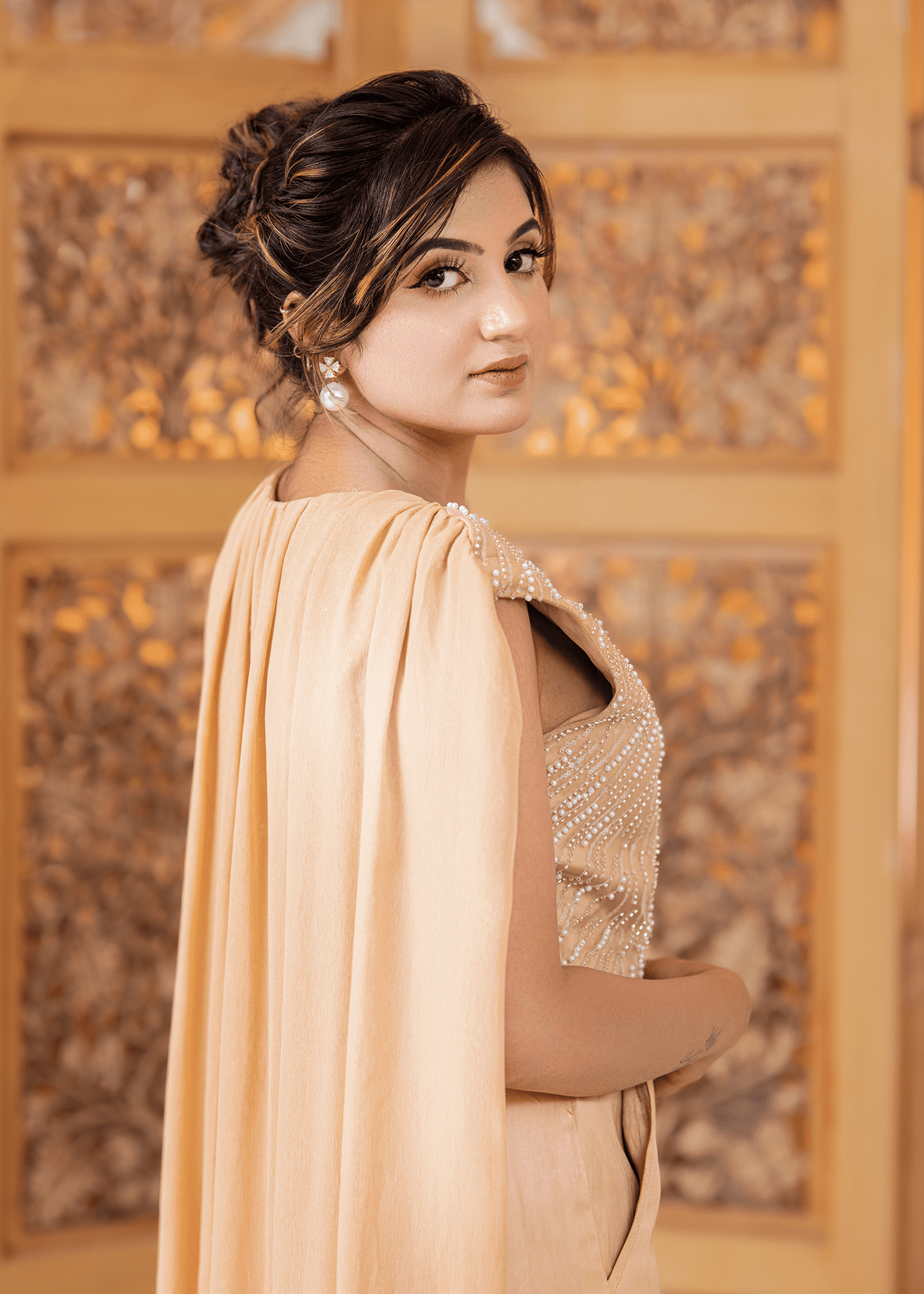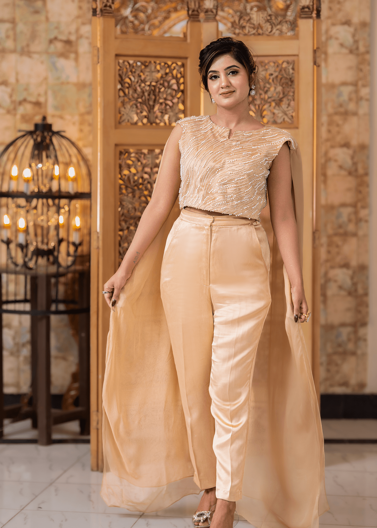 An elegant fusion ensemble crafted from chiffon, silk, and net. The hand-embellished bodice features delicate detailing over a sleek silk base. Paired with tailored trousers and a flowing net cape for contemporary sophistication. Perfect for formal soirées and modern festive occasions.
