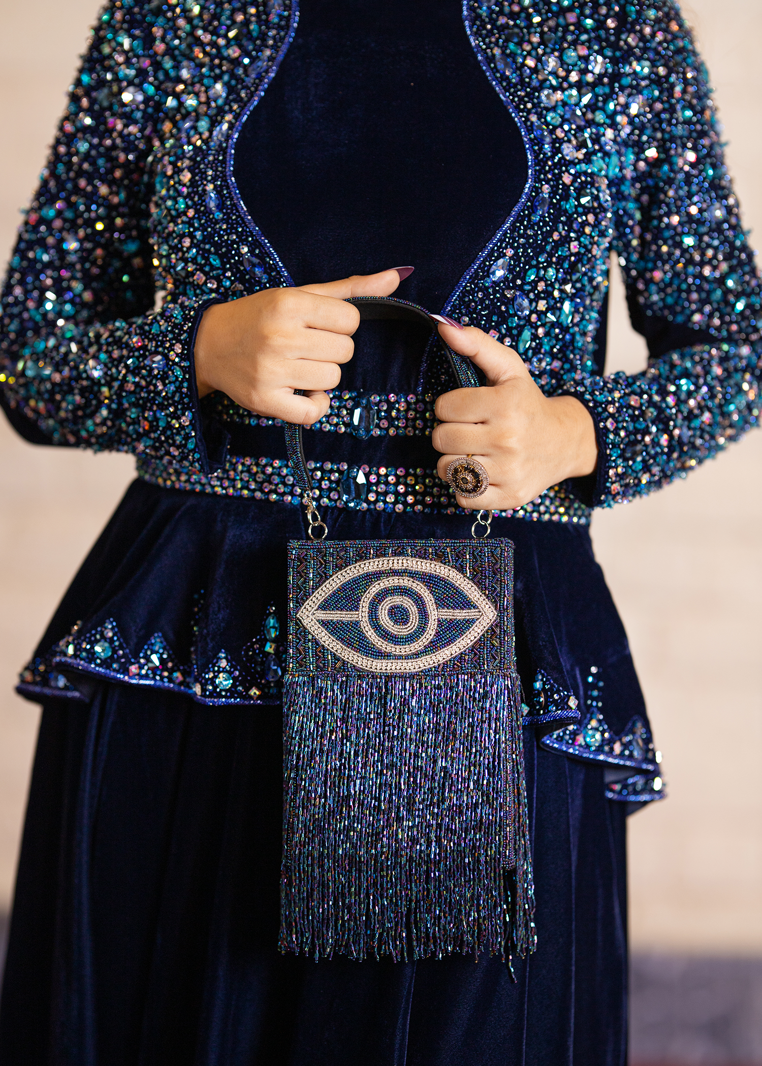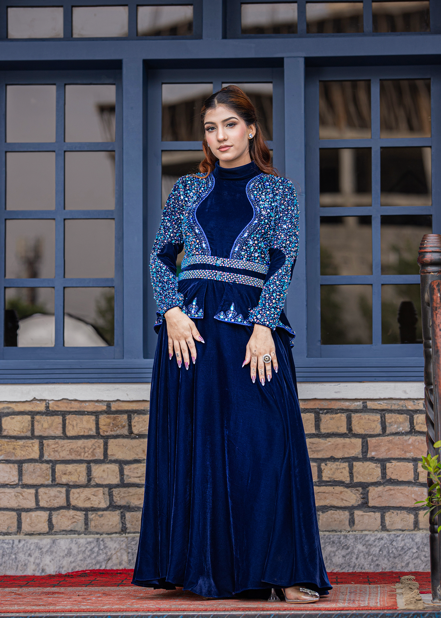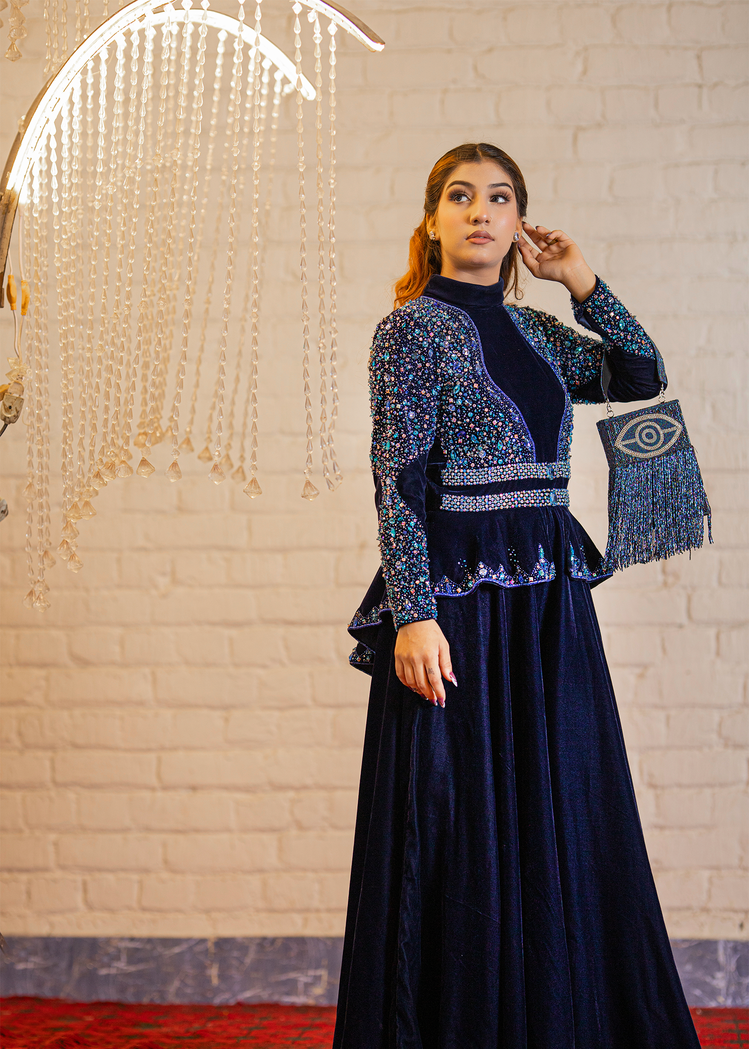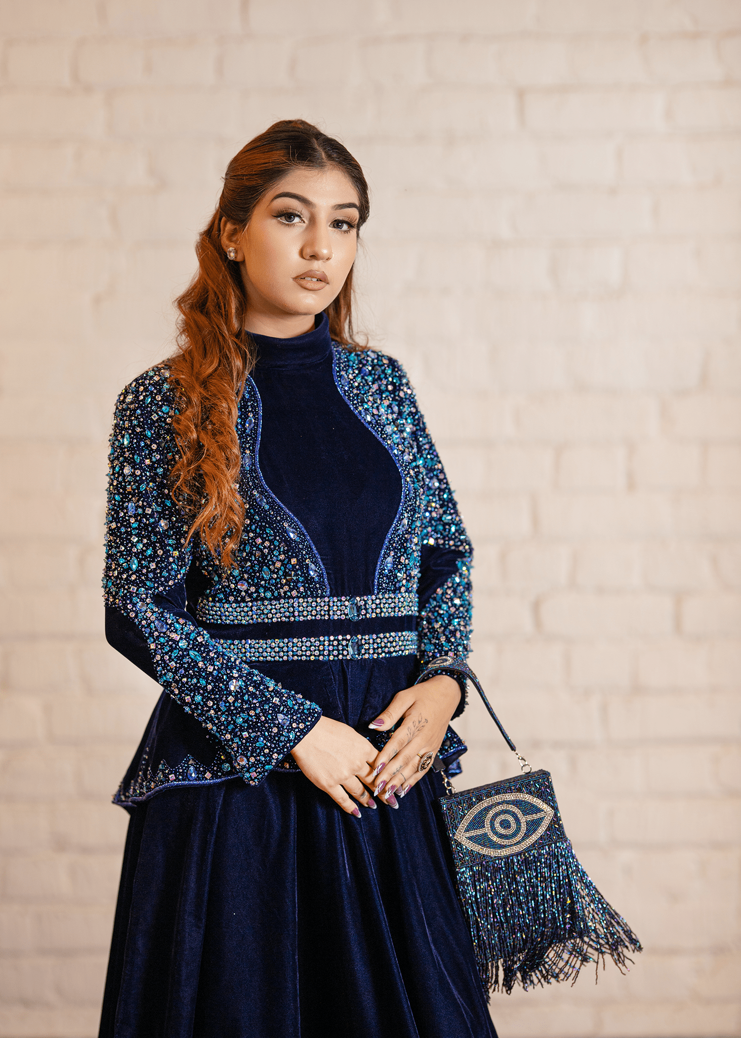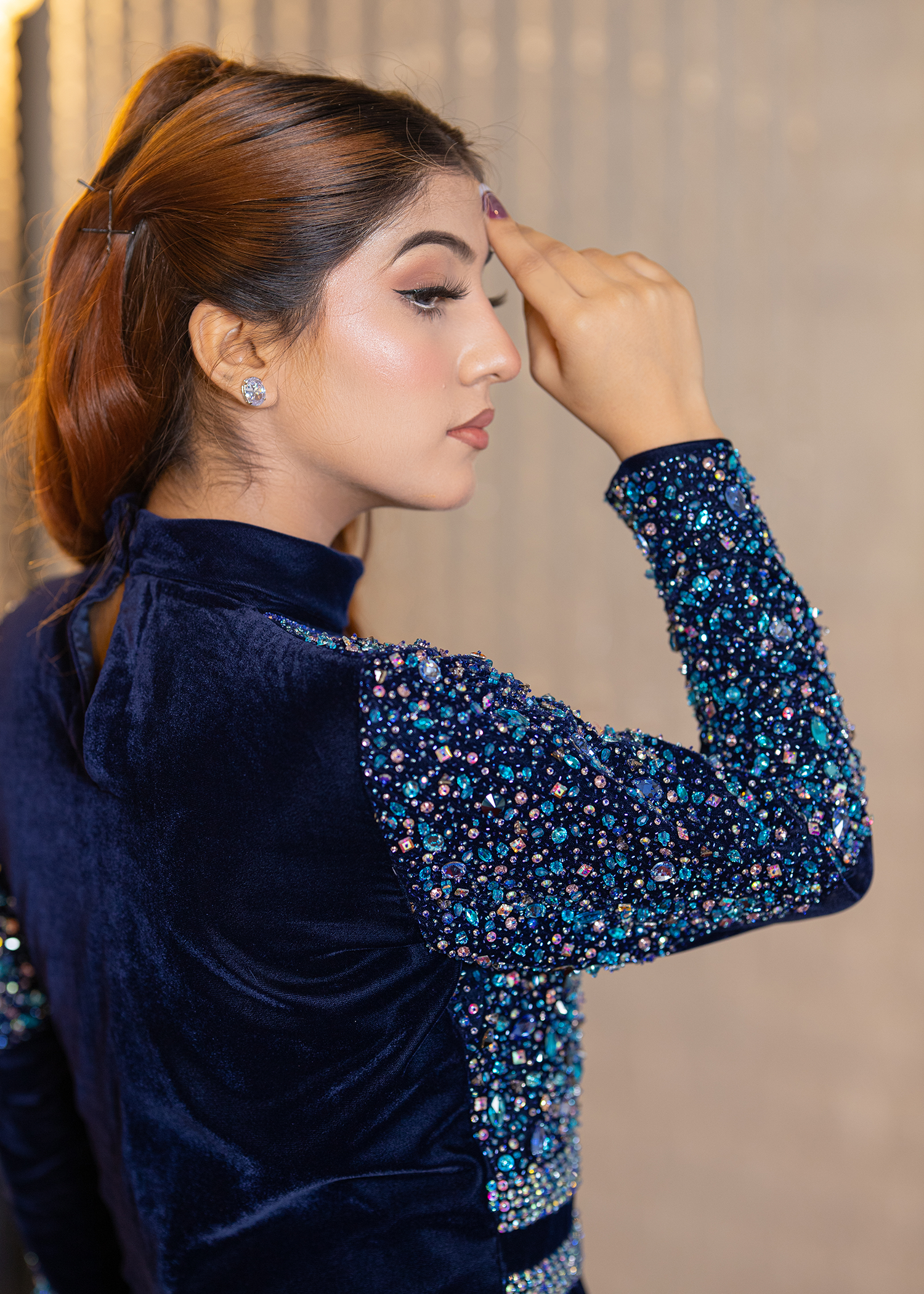 Midnight blue velvet ensemble featuring meticulous hand embellishment. Adorned with fine stones, crystals, katdana, sequins, and Swarovski accents. The structured silhouette and ornate detailing exude regal sophistication. Perfect for formal soirées and grand festive occasions.