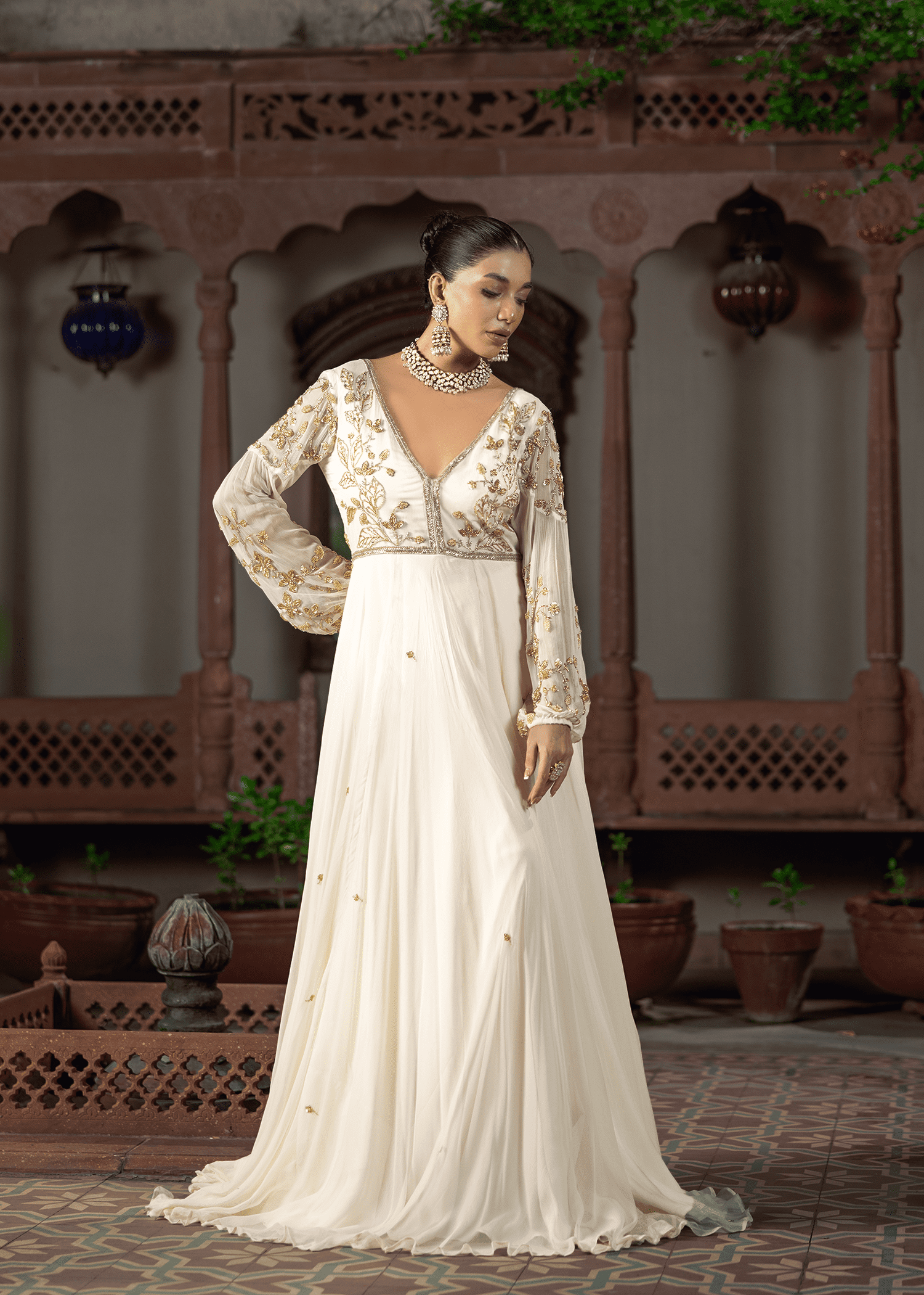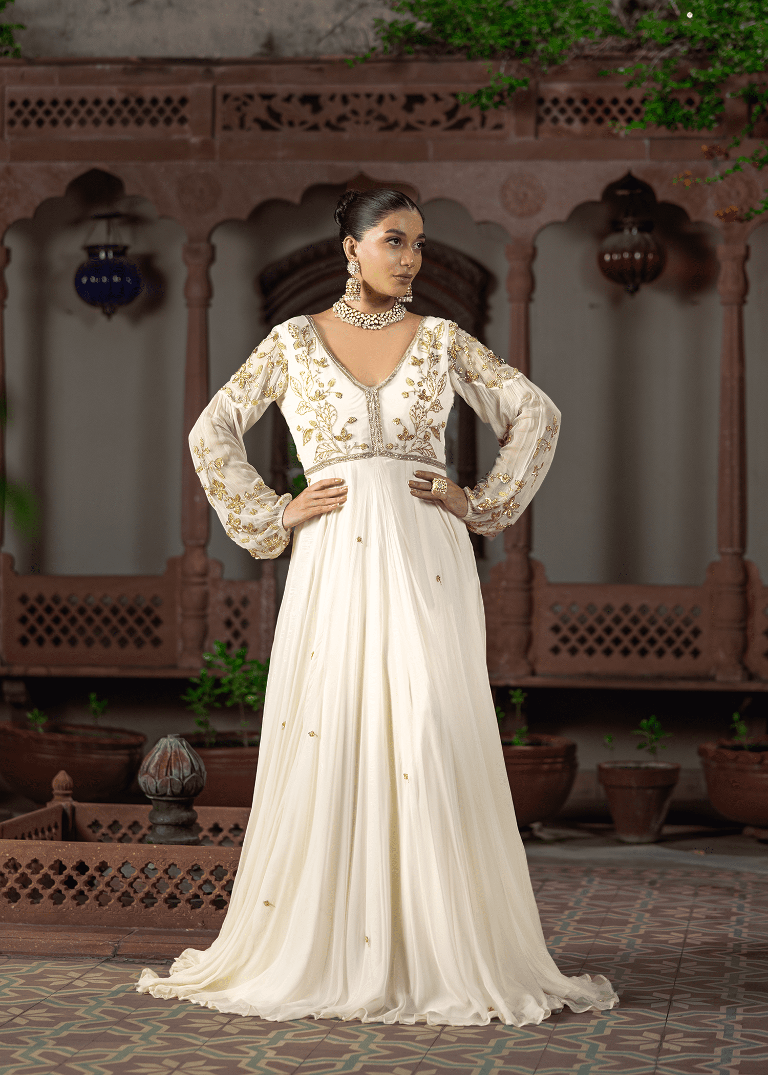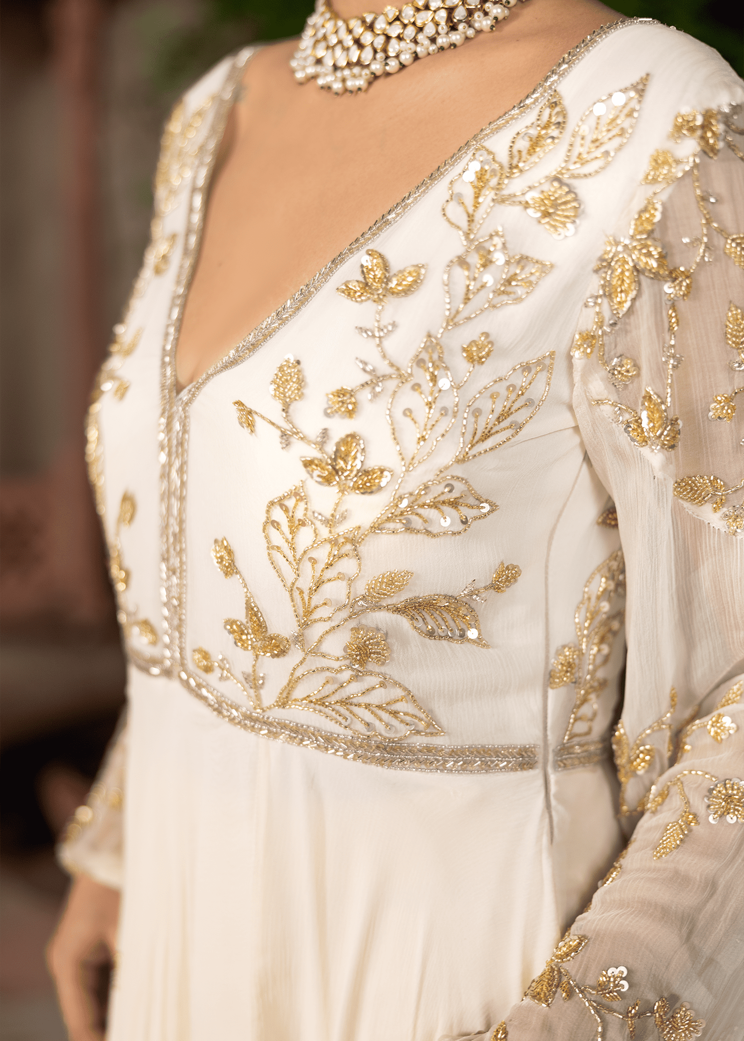 An ethereal cloud-white chiffon gown, hand-embellished with delicate katdana and sequins. The flowing silhouette and sheer detailed sleeves evoke understated elegance, making it a timeless evening statement.