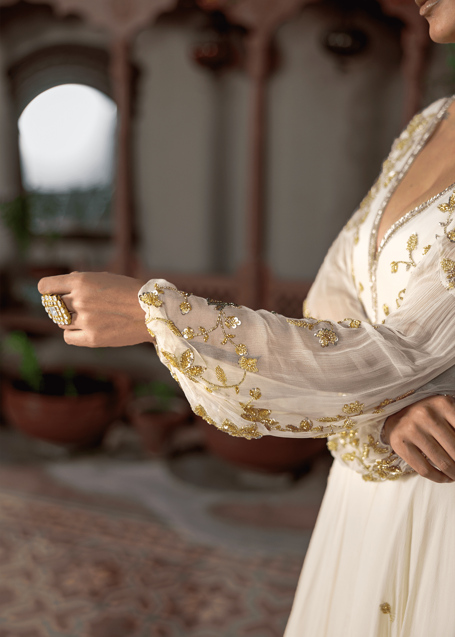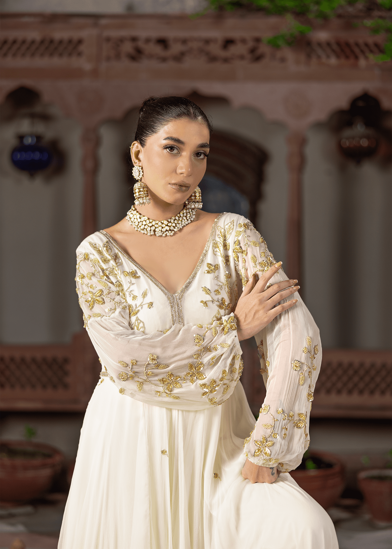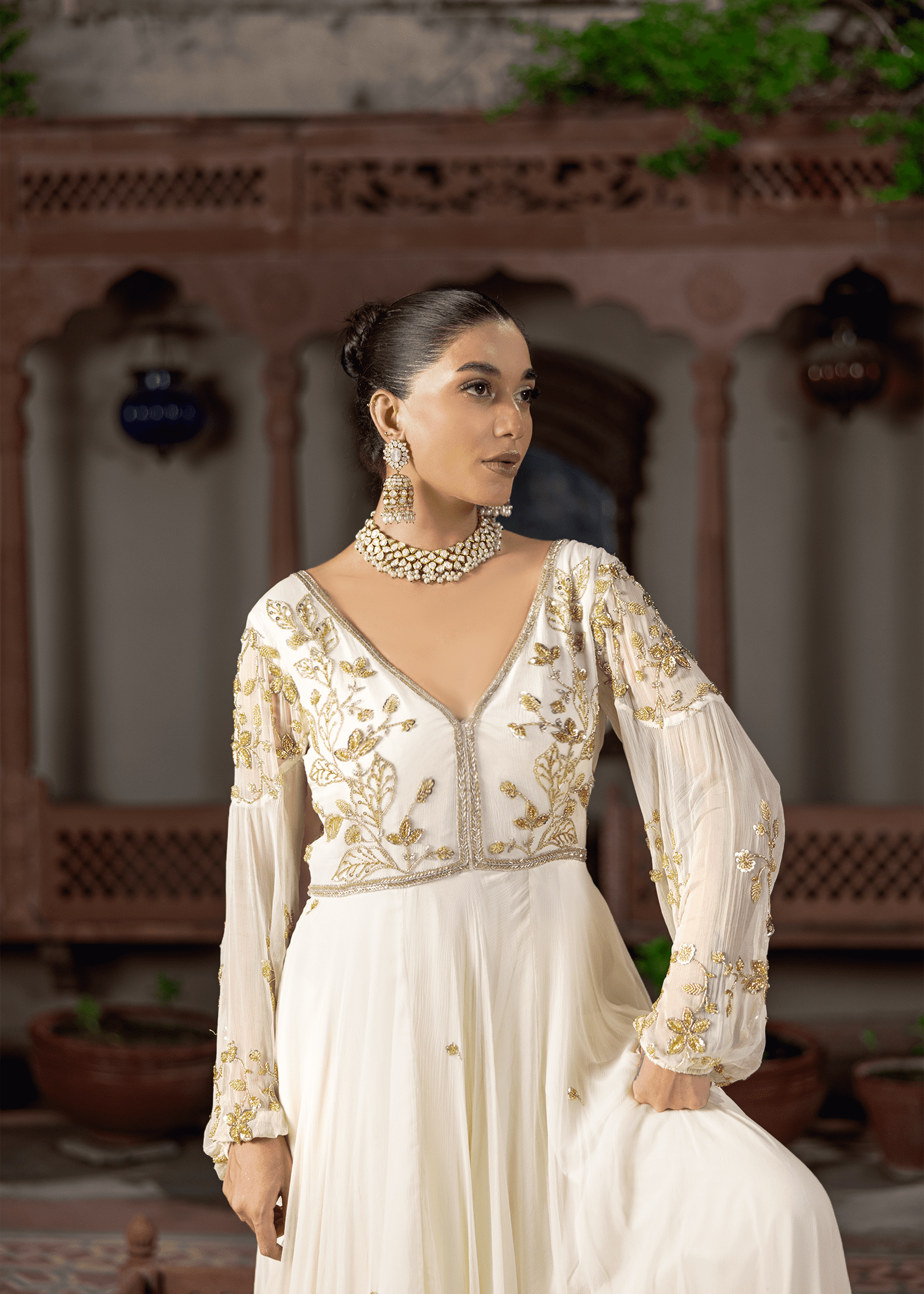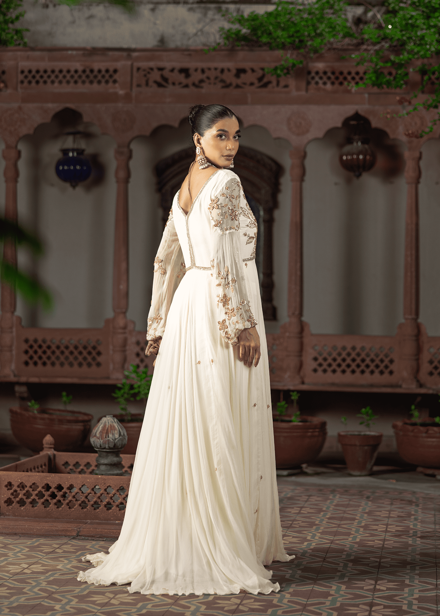 An ethereal cloud-white chiffon gown, hand-embellished with delicate katdana and sequins. The flowing silhouette and sheer detailed sleeves evoke understated elegance, making it a timeless evening statement.