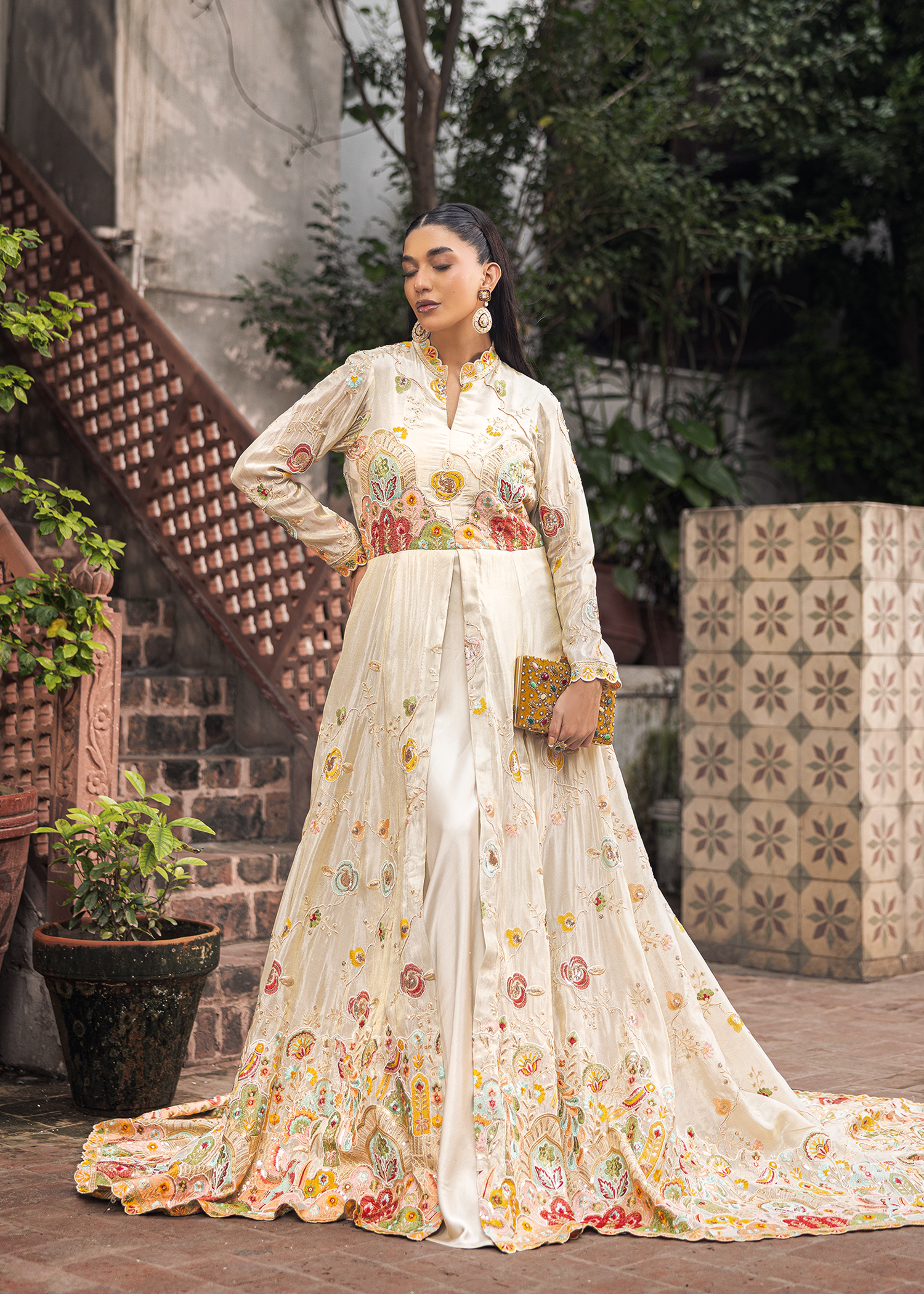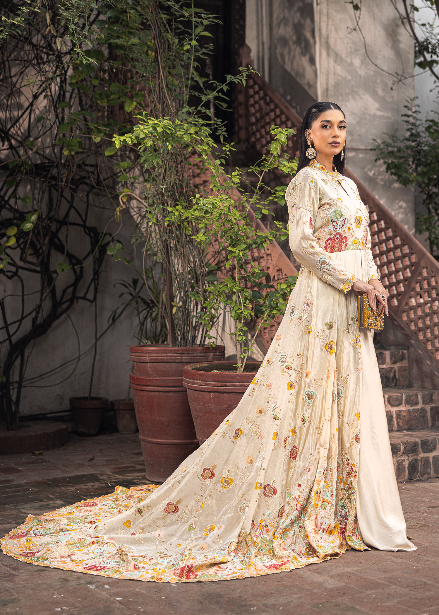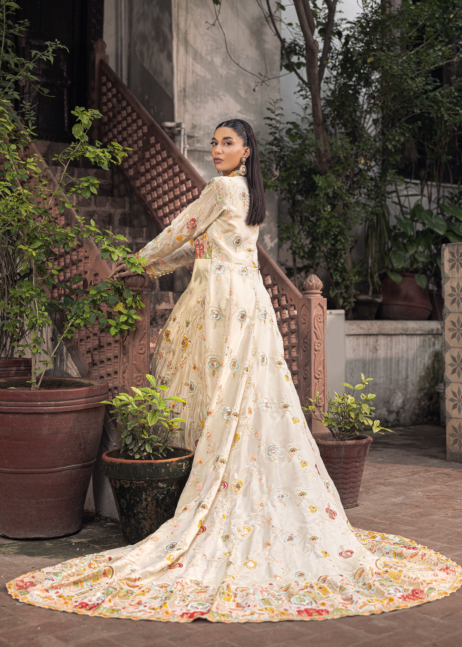 An ivory floor-length masori gown, distinguished by refined applique detailing. The flowing silhouette with a subtle train is enriched with intricate motifs, offering a regal yet contemporary expression of couture elegance.
