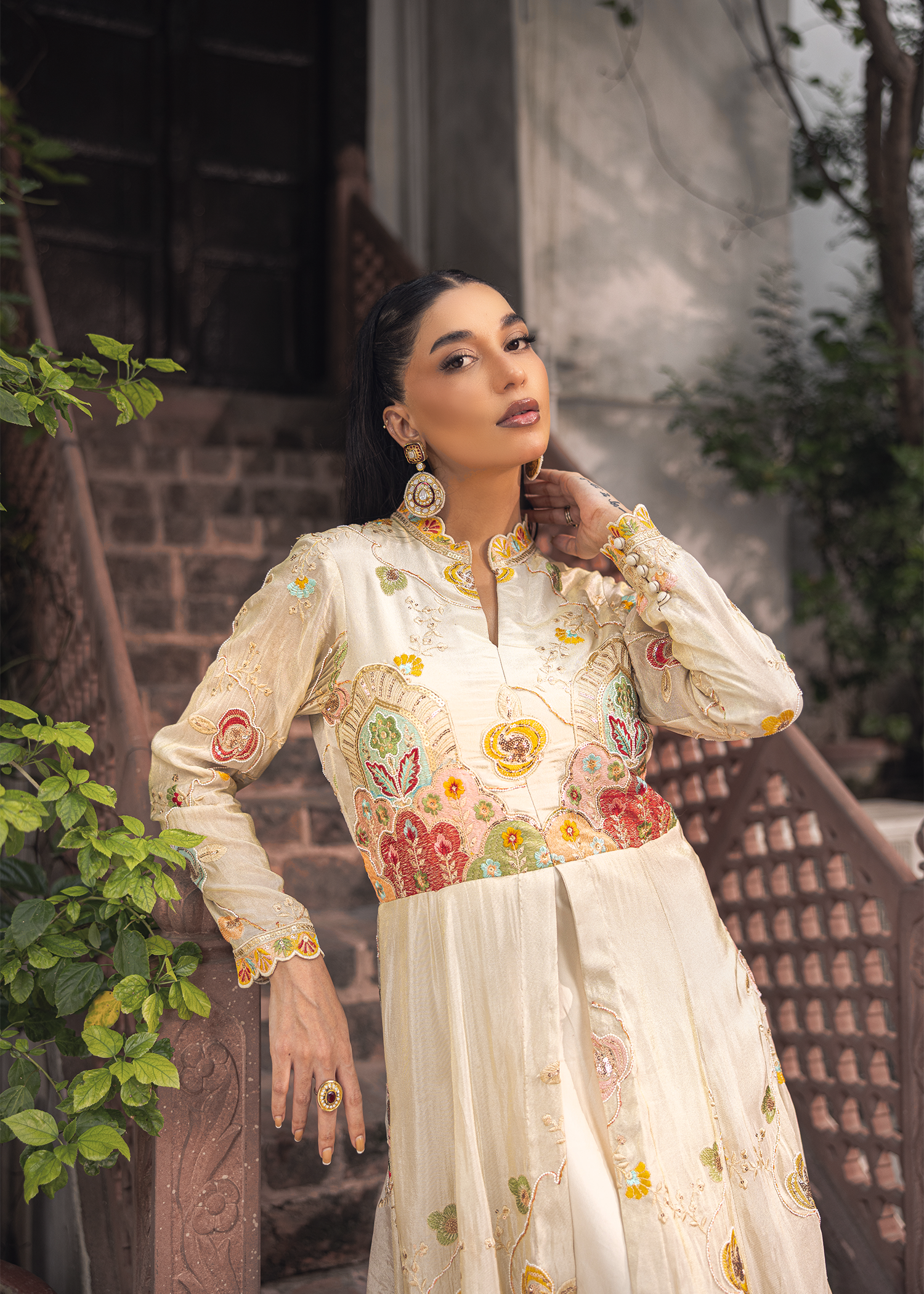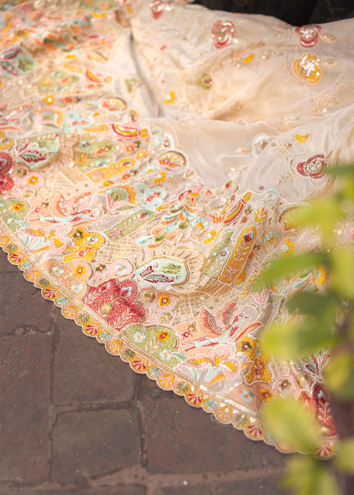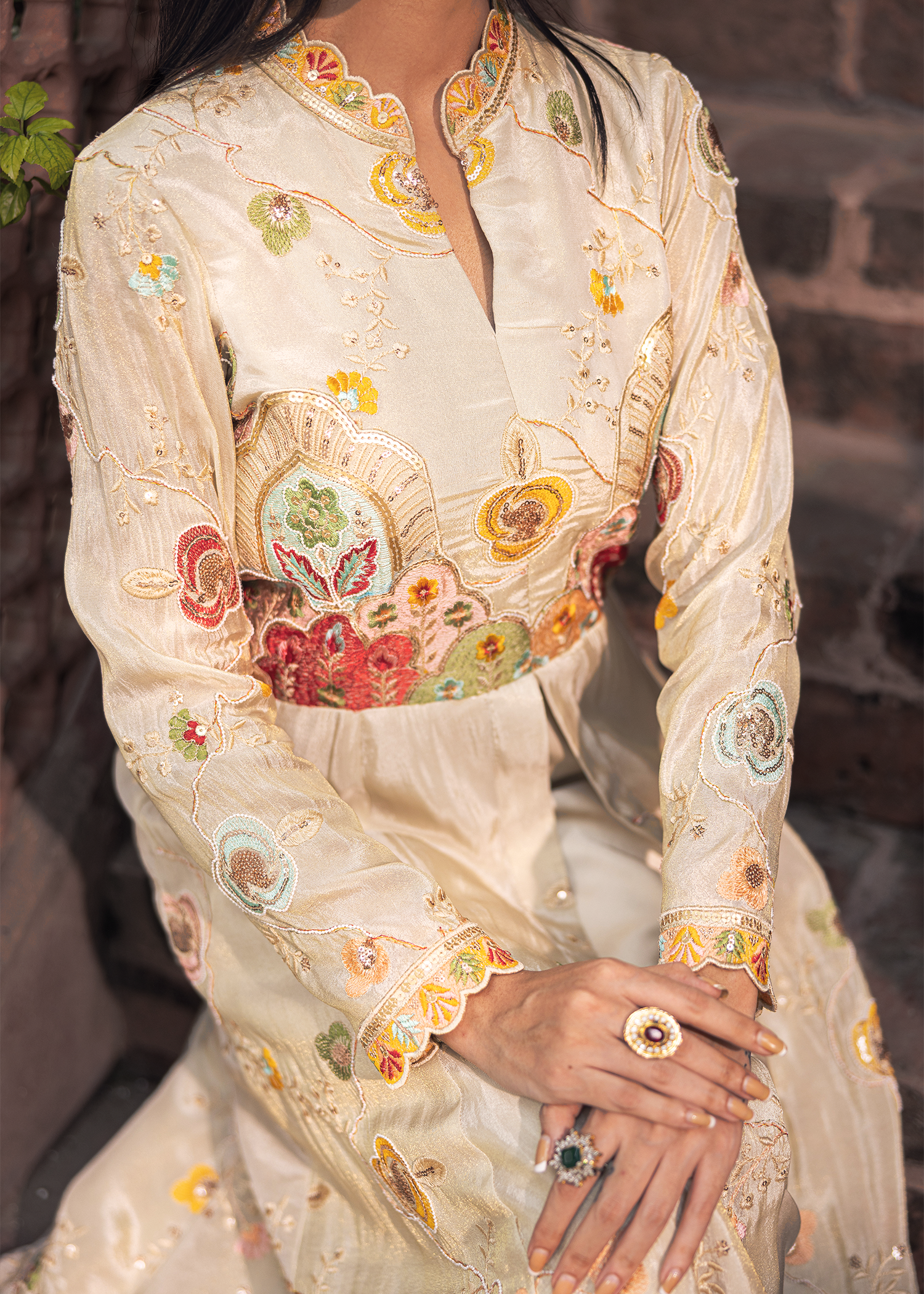 An ivory floor-length masori gown, distinguished by refined applique detailing. The flowing silhouette with a subtle train is enriched with intricate motifs, offering a regal yet contemporary expression of couture elegance.