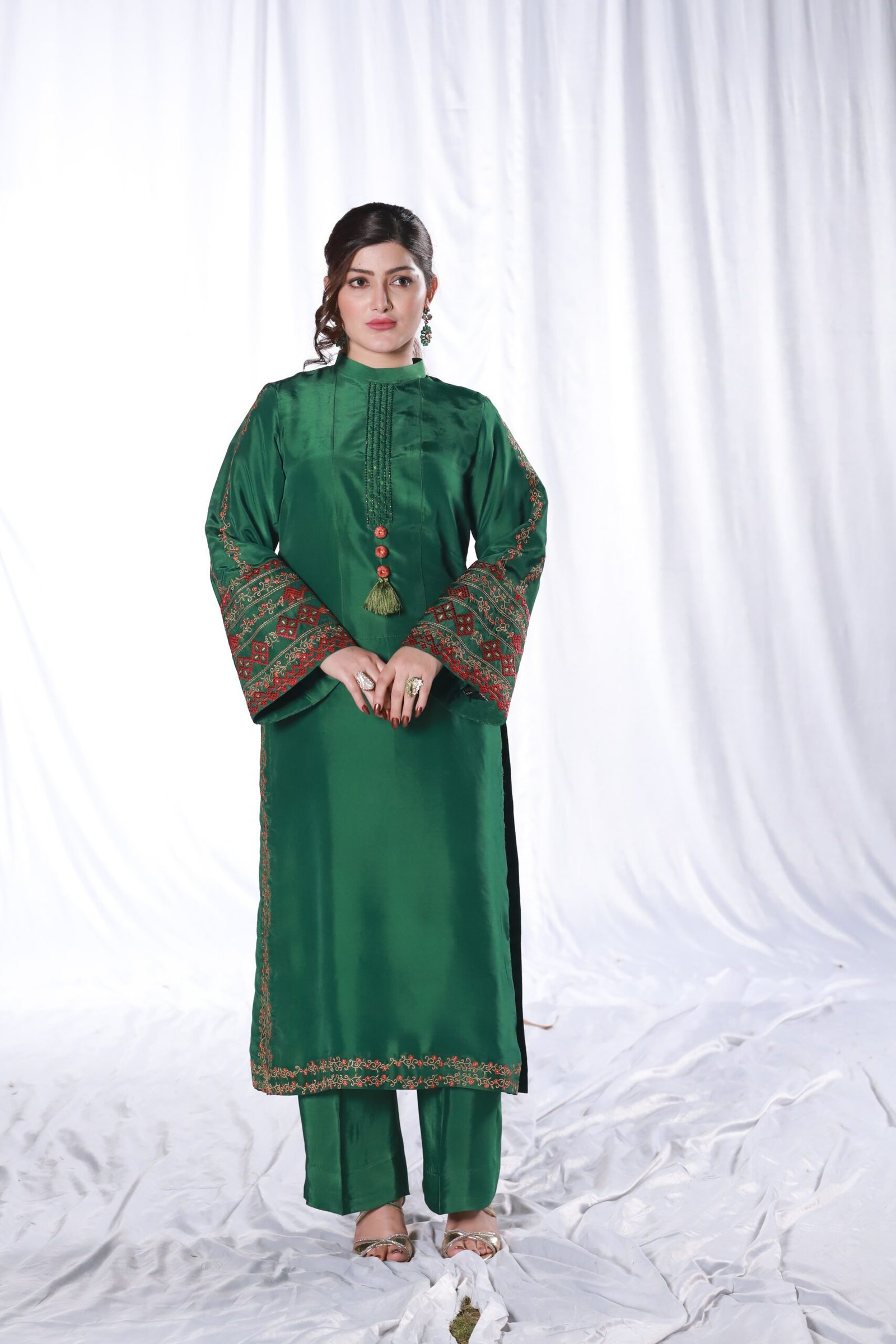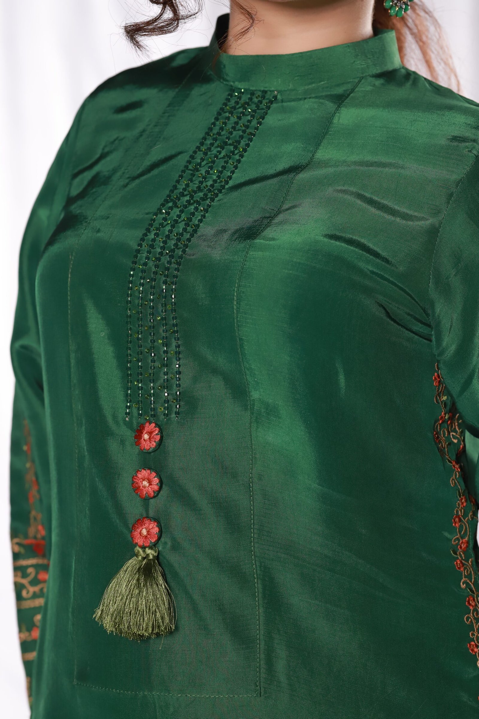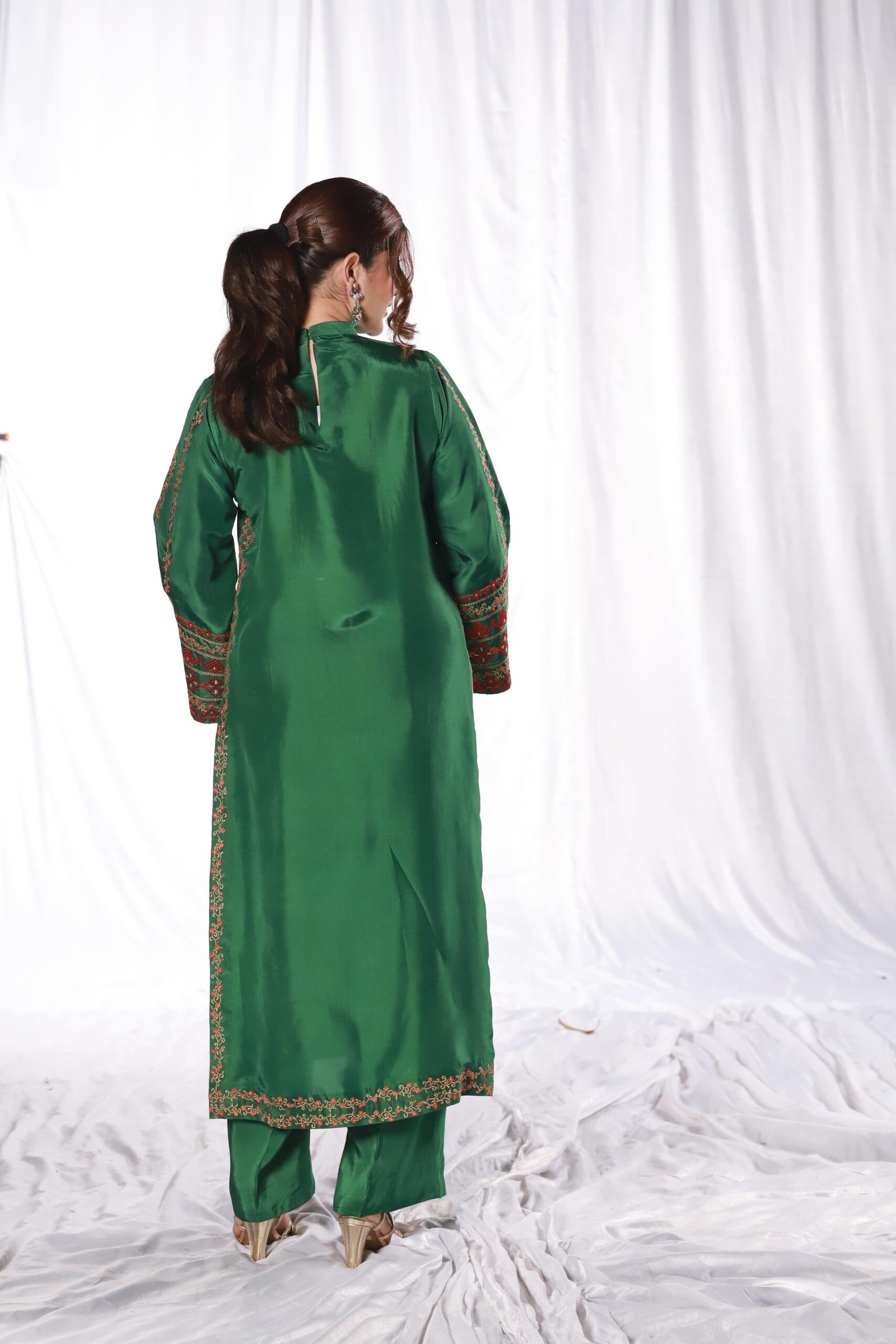 This two-piece green ensemble is crafted from smooth sheesha silk, giving it a clean, structured look. The shirt and trouser are detailed with refined machine embroidery along the sleeves, borders, and front, adding subtle pattern and texture without overwhelming the silhouette.