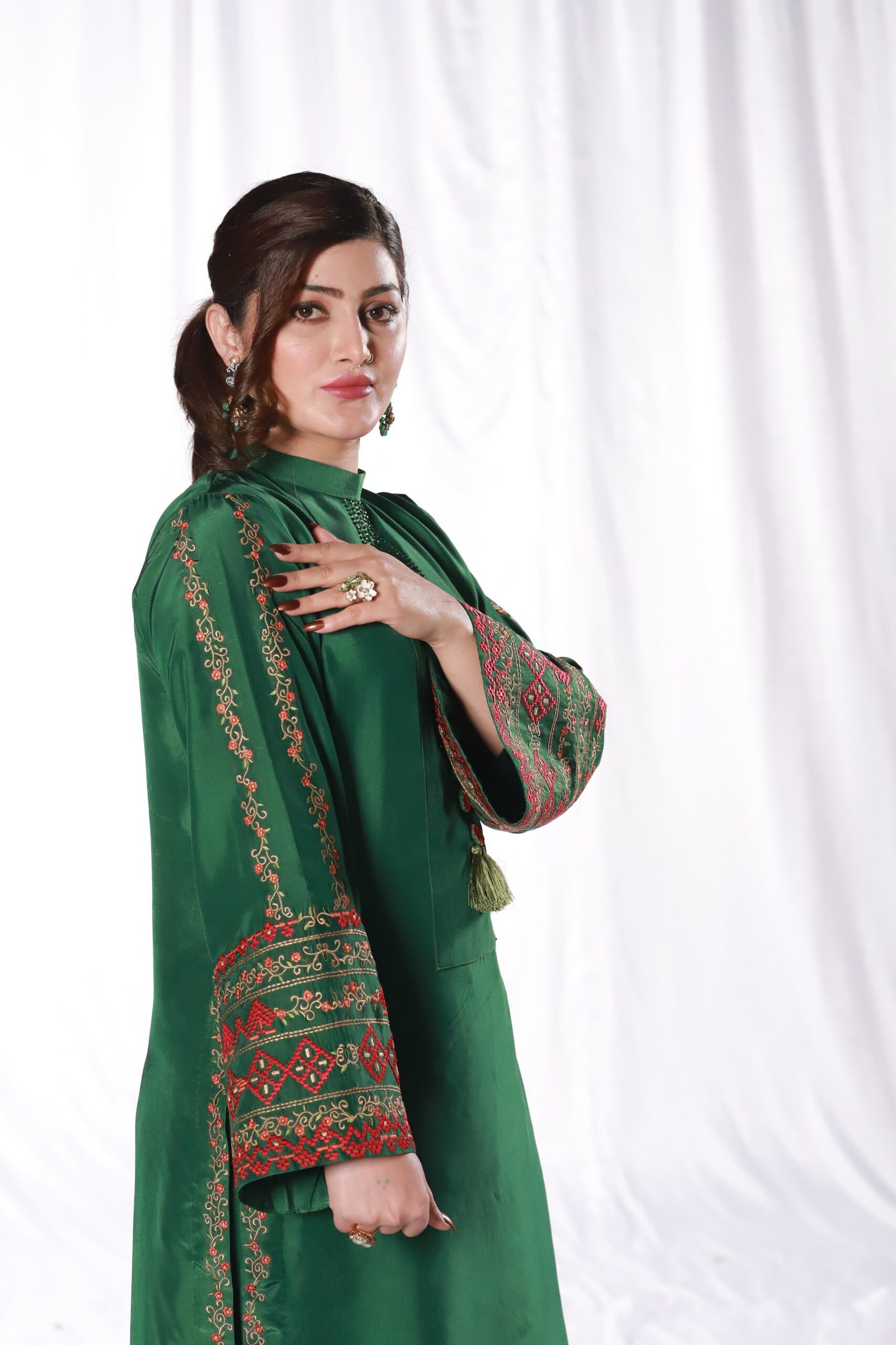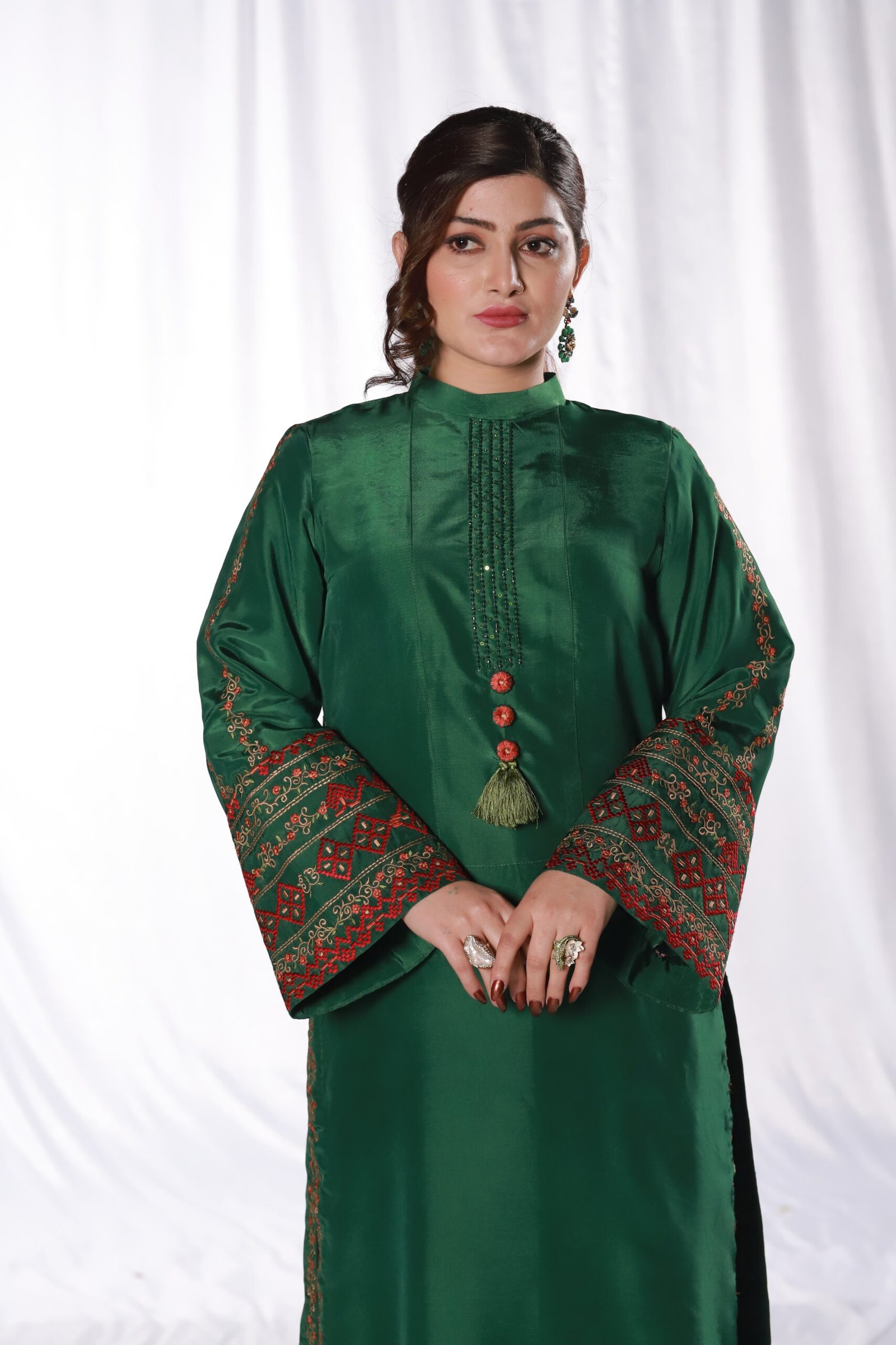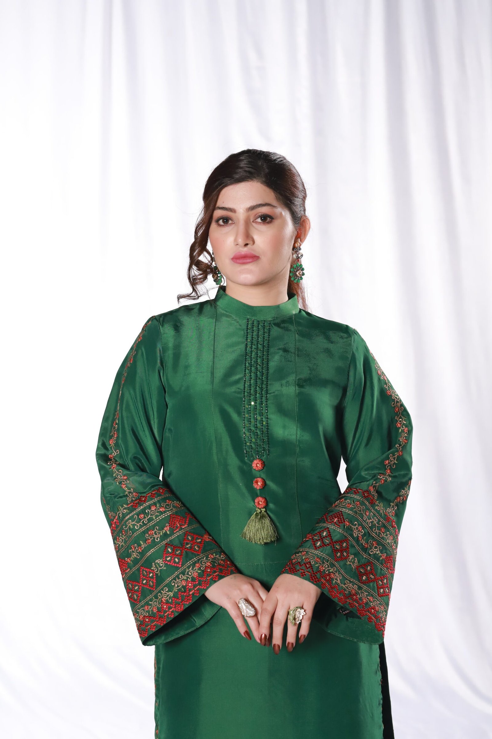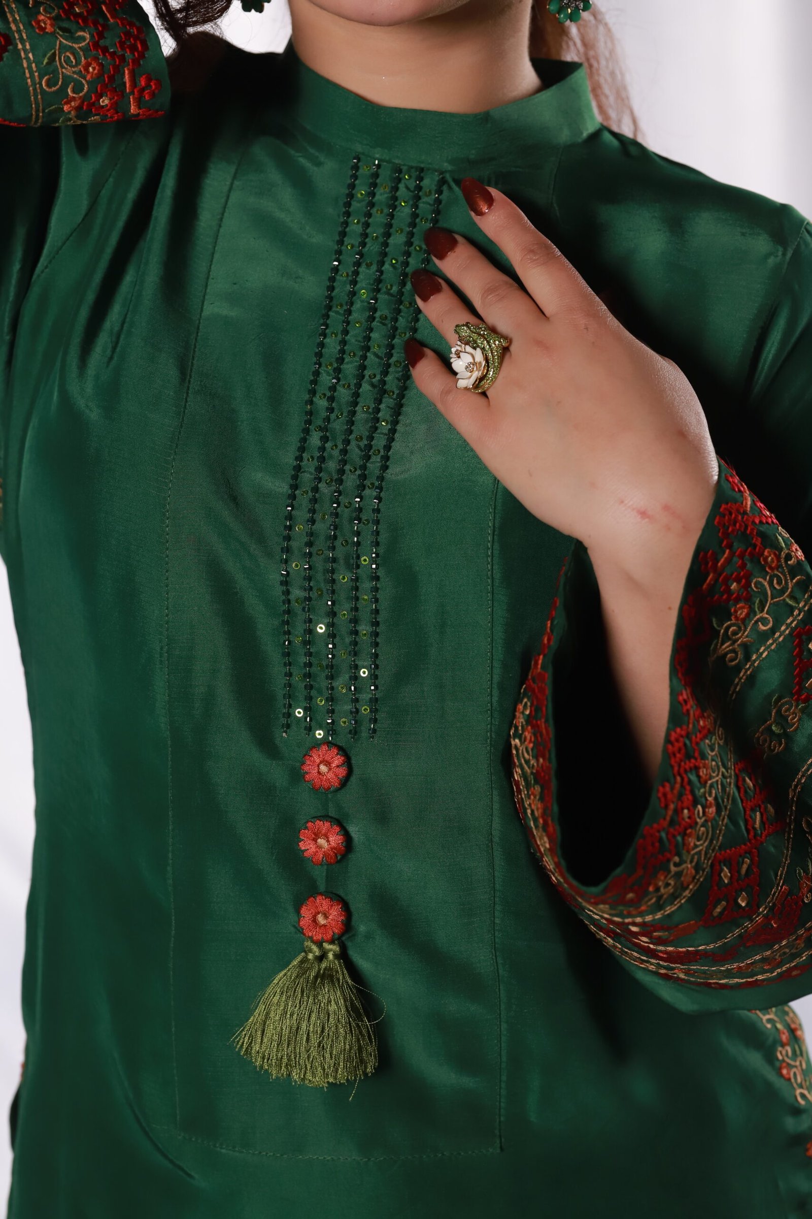 This two-piece green ensemble is crafted from smooth sheesha silk, giving it a clean, structured look. The shirt and trouser are detailed with refined machine embroidery along the sleeves, borders, and front, adding subtle pattern and texture without overwhelming the silhouette.