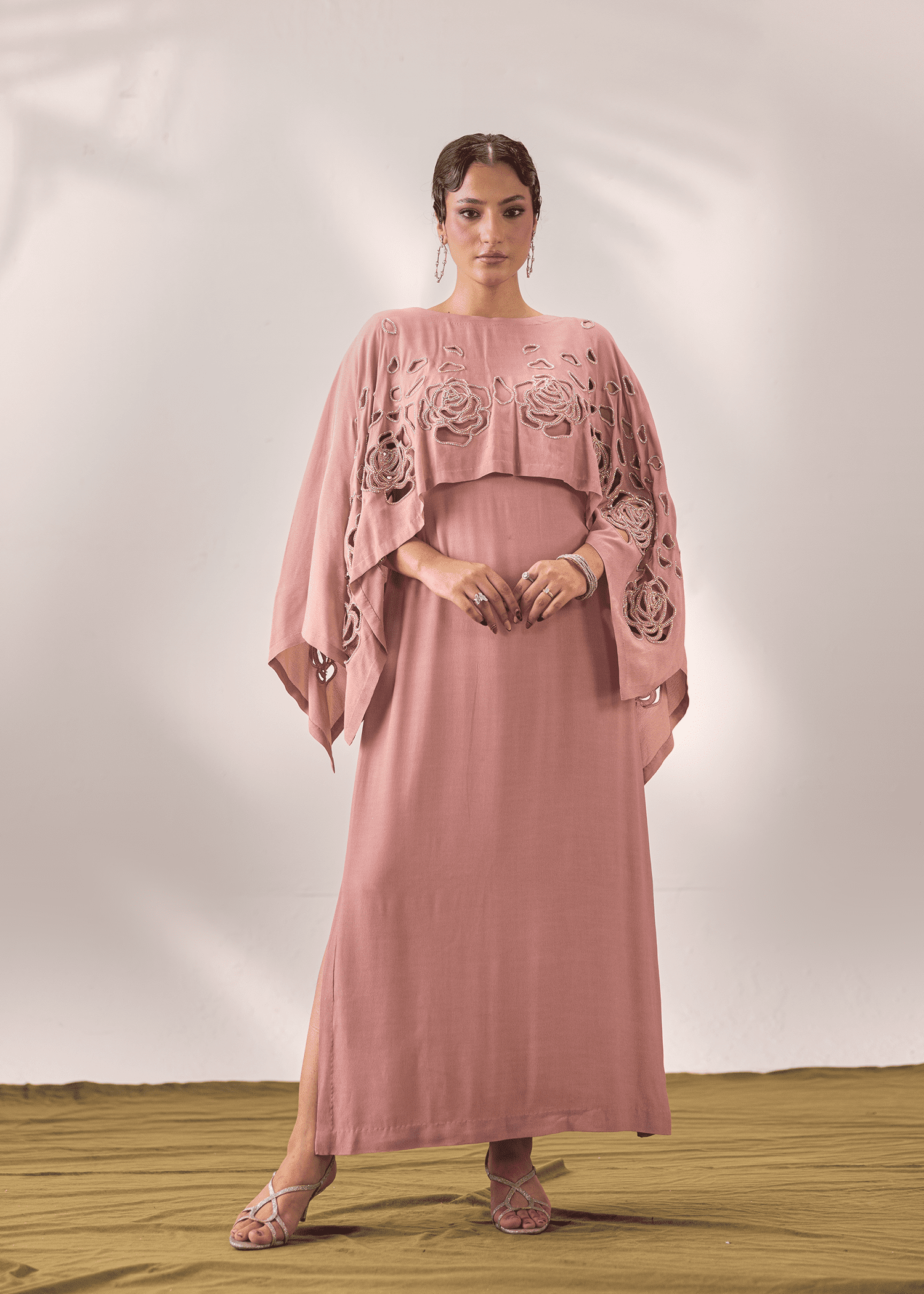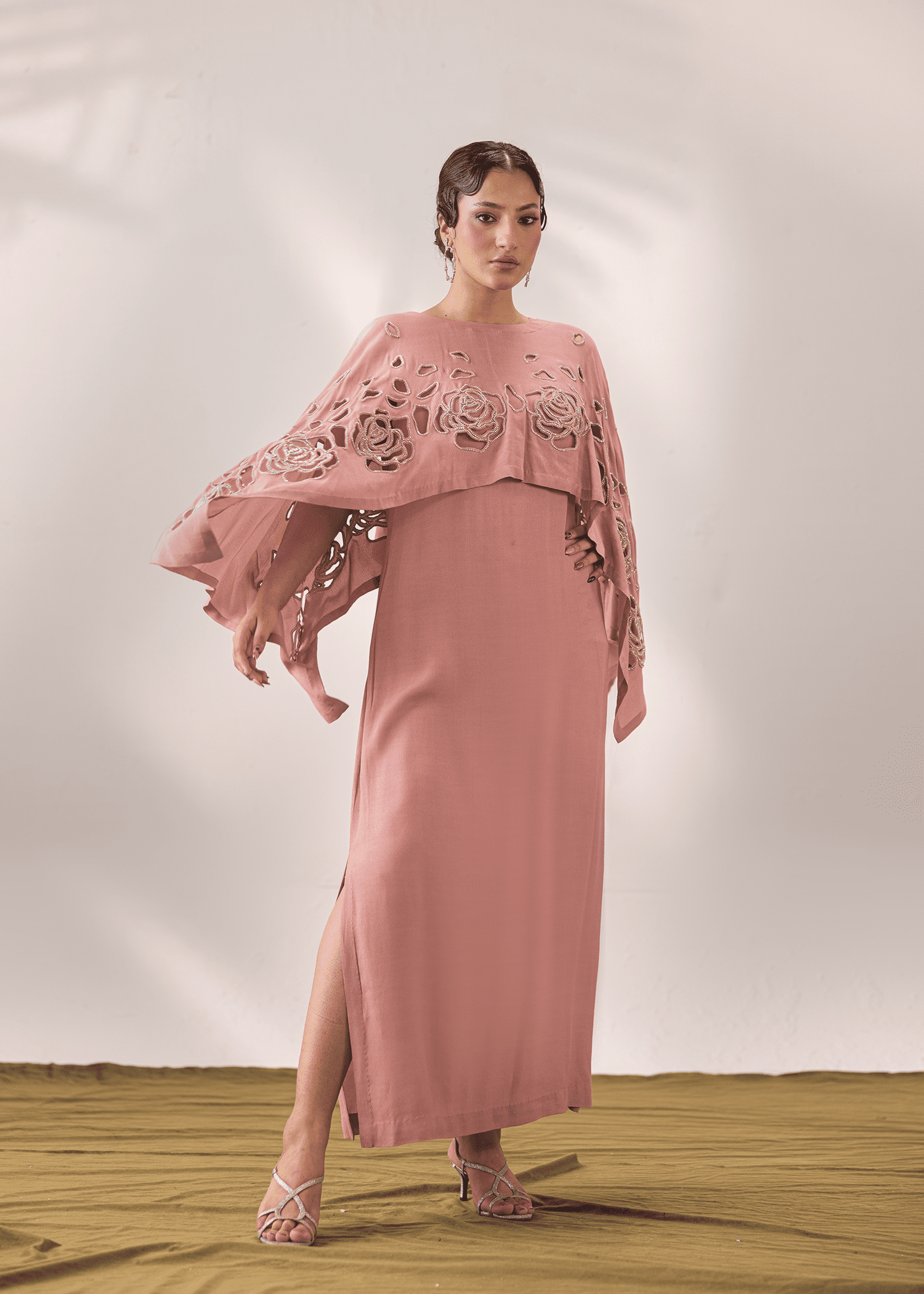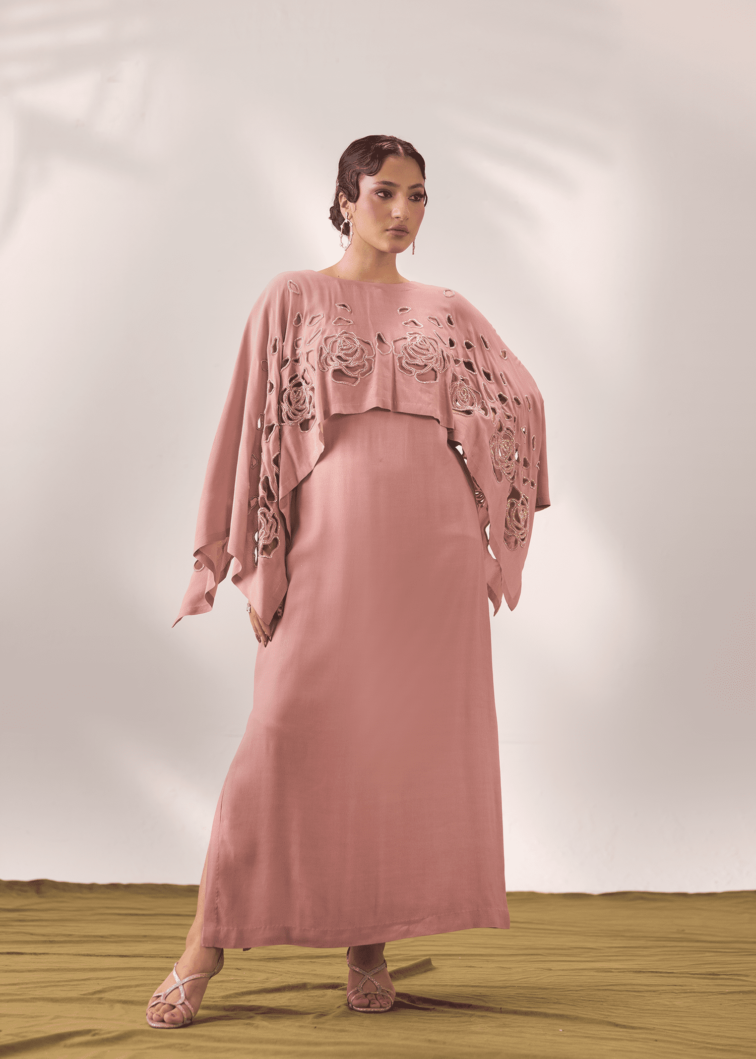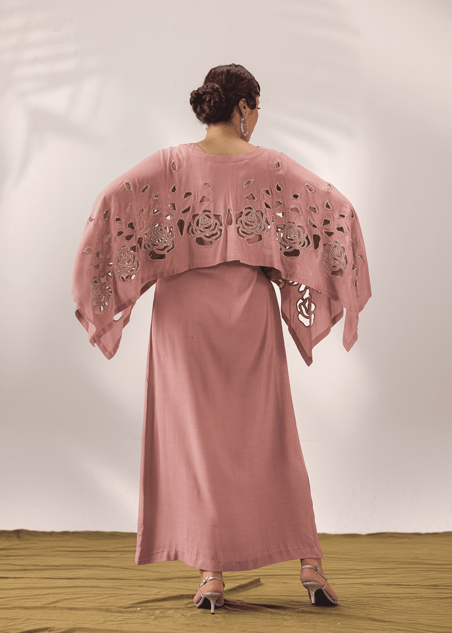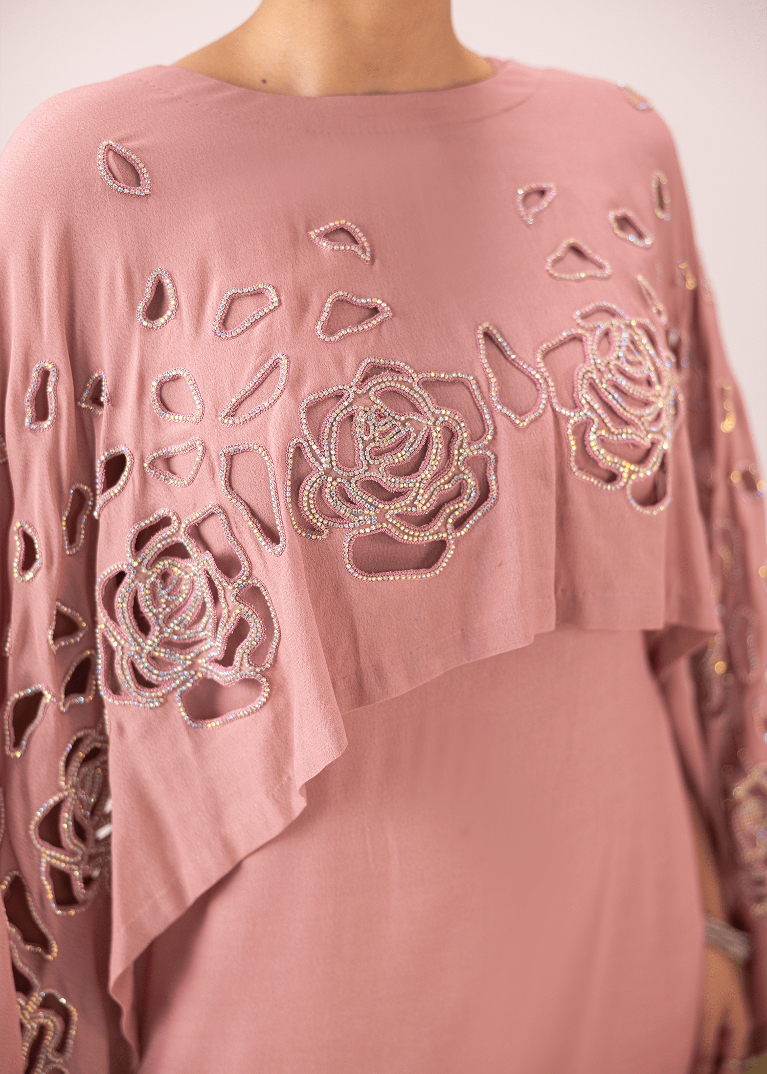 A two-piece set in flamingo pink georgette, featuring delicate cutwork outlined with rhinestones. The flowing silhouette and cape-style overlay create a modern yet graceful statement.