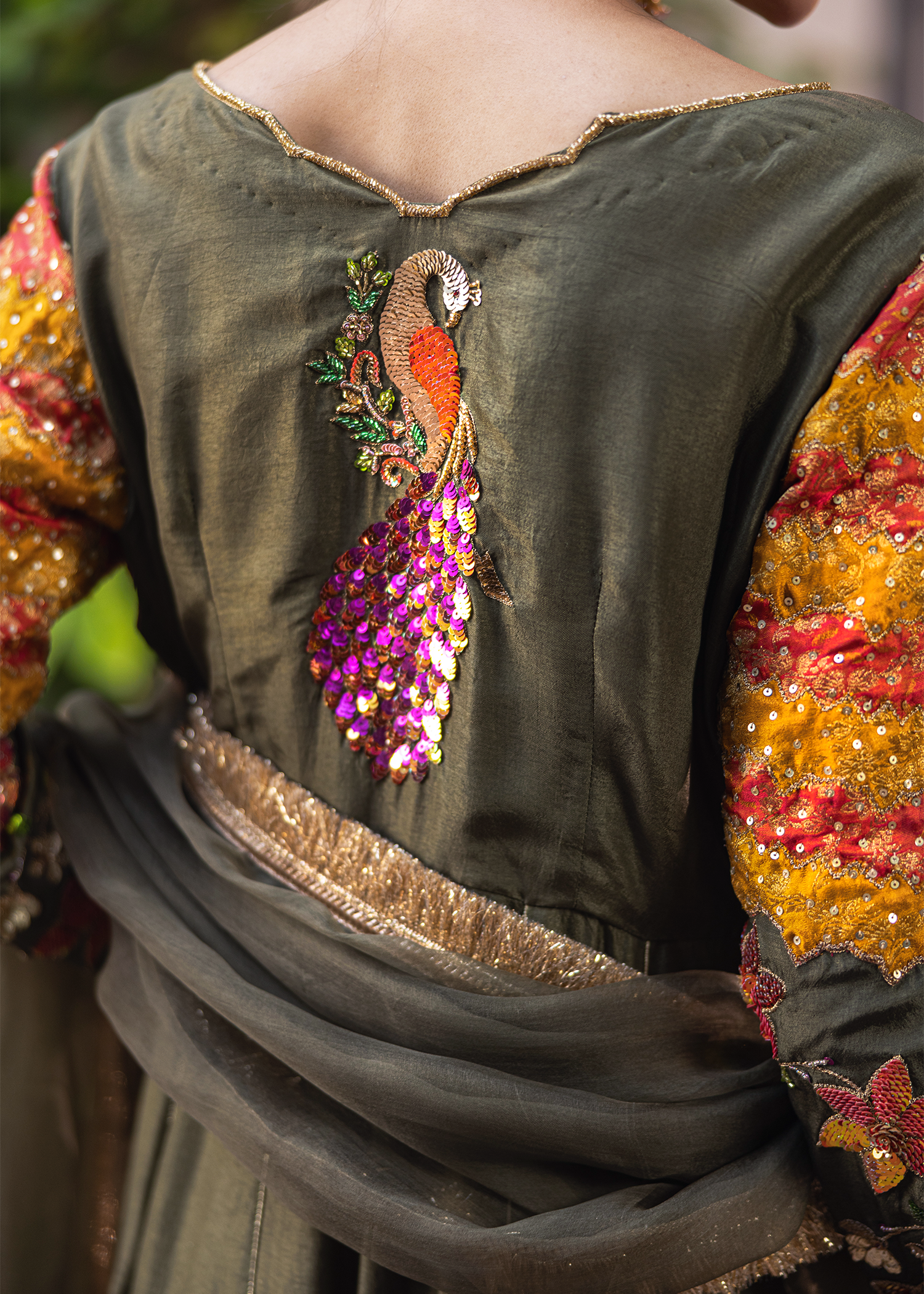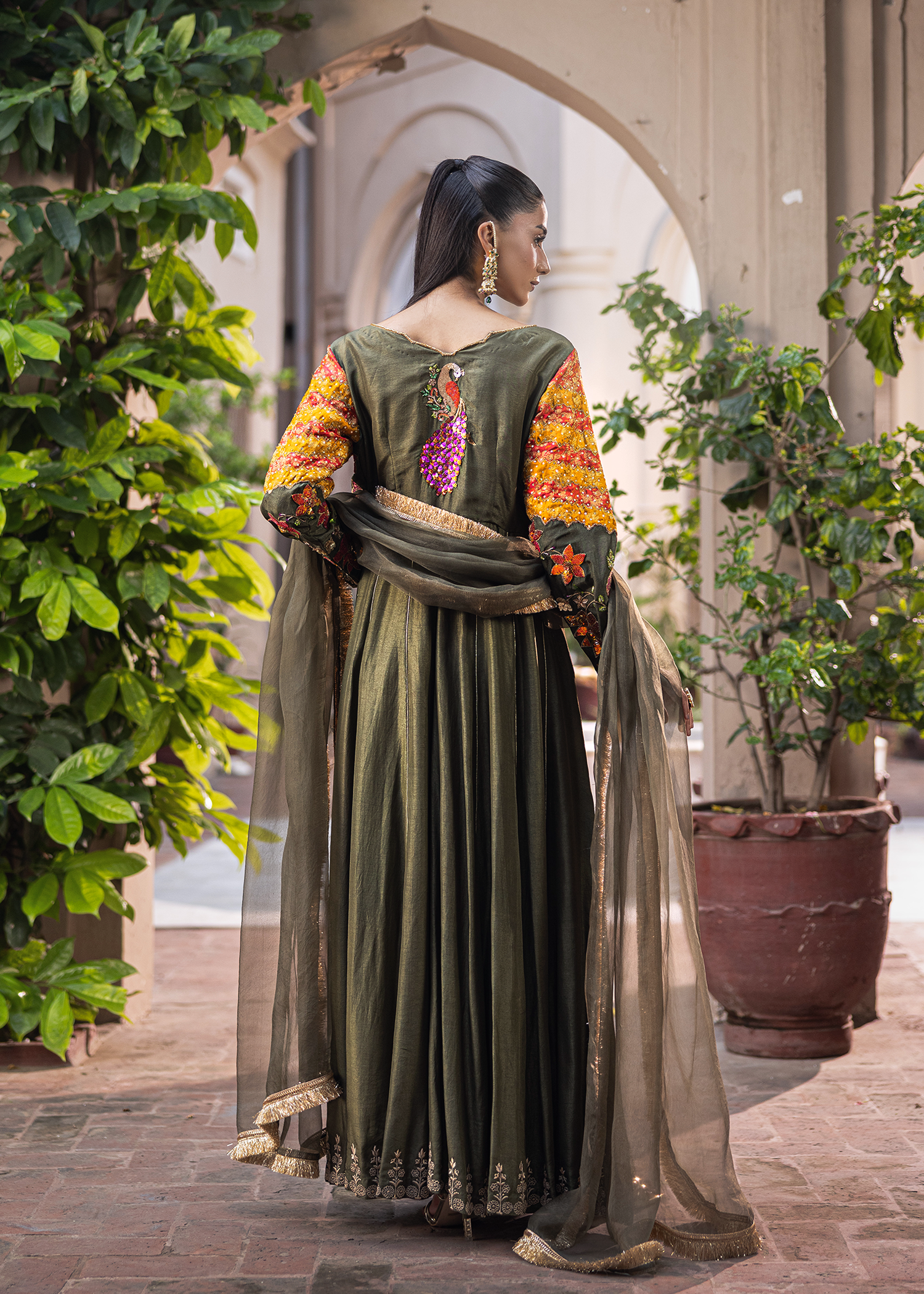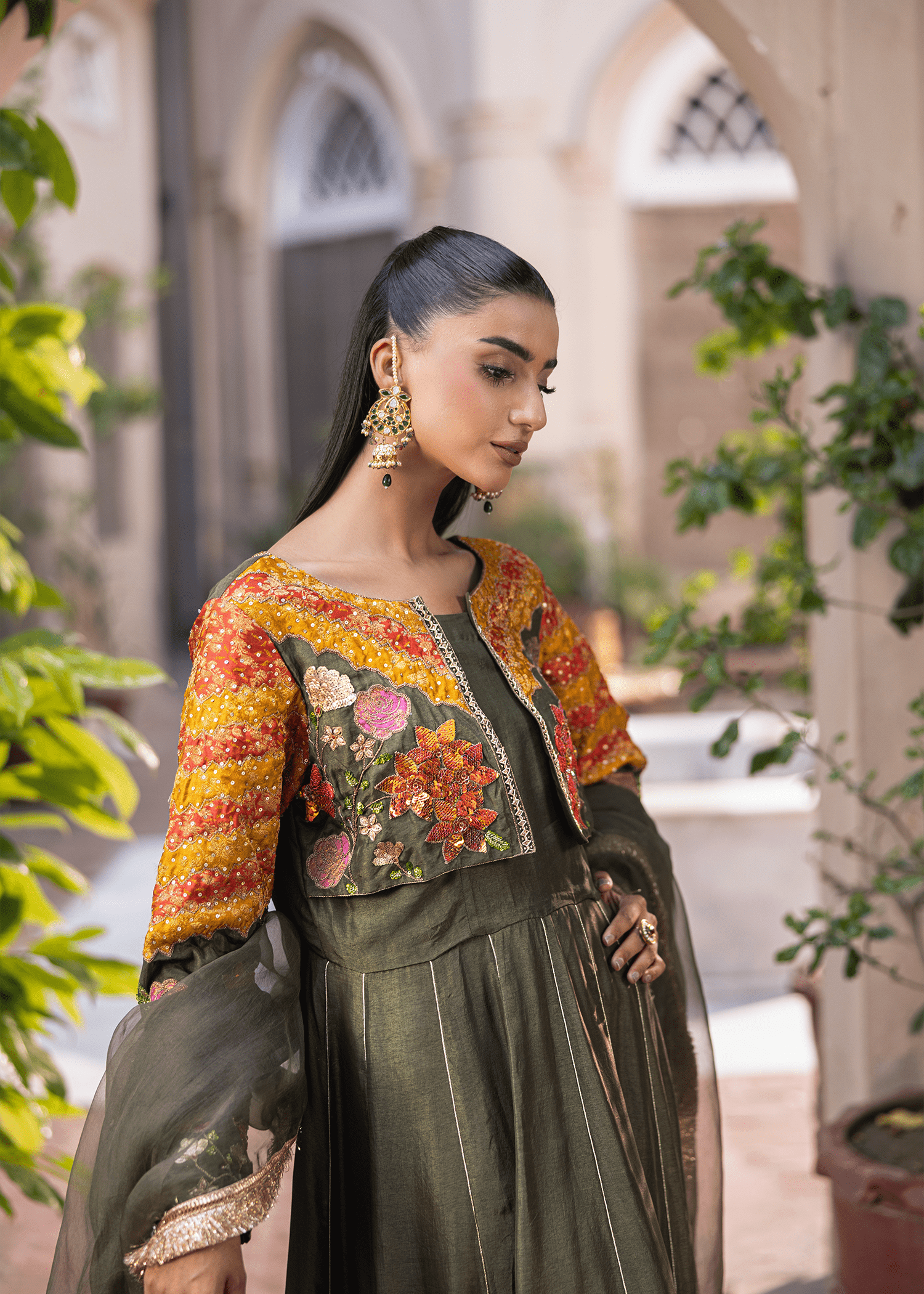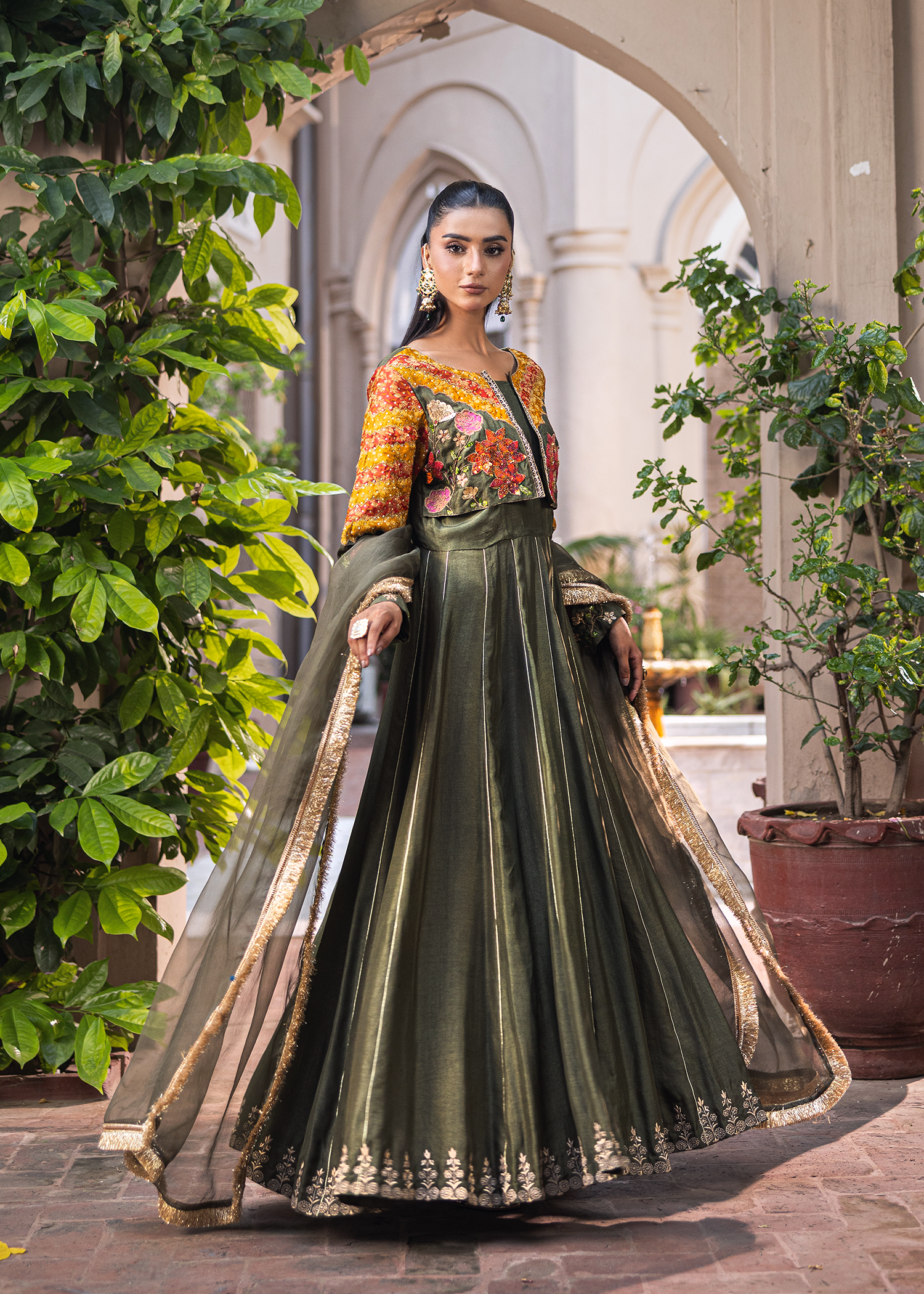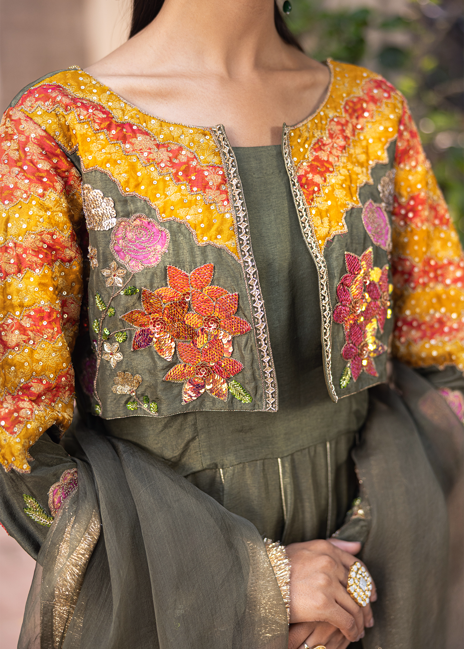 A sophisticated ensemble in dark moss green Korean silk jamawar, featuring a floor-length dress paired with a statement jacket. The cropped jacket, in a radiant blend of sunset orange and gold tones, is adorned with intricate applique work highlighted by shimmery sequins, dabka, and katdana embellishments. Finished with a sheer dupatta edged in gold, this design fuses regal elegance with contemporary charm.