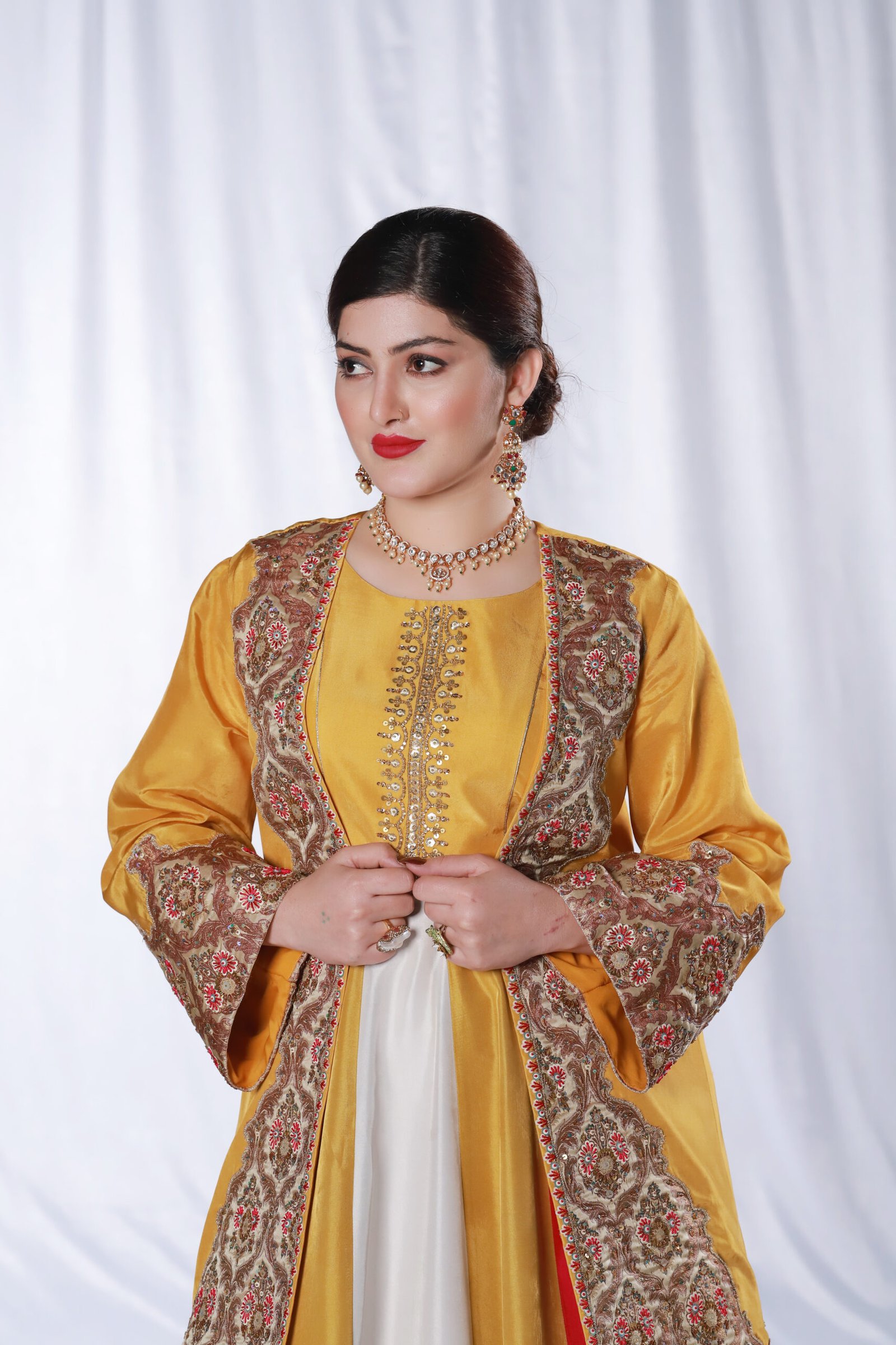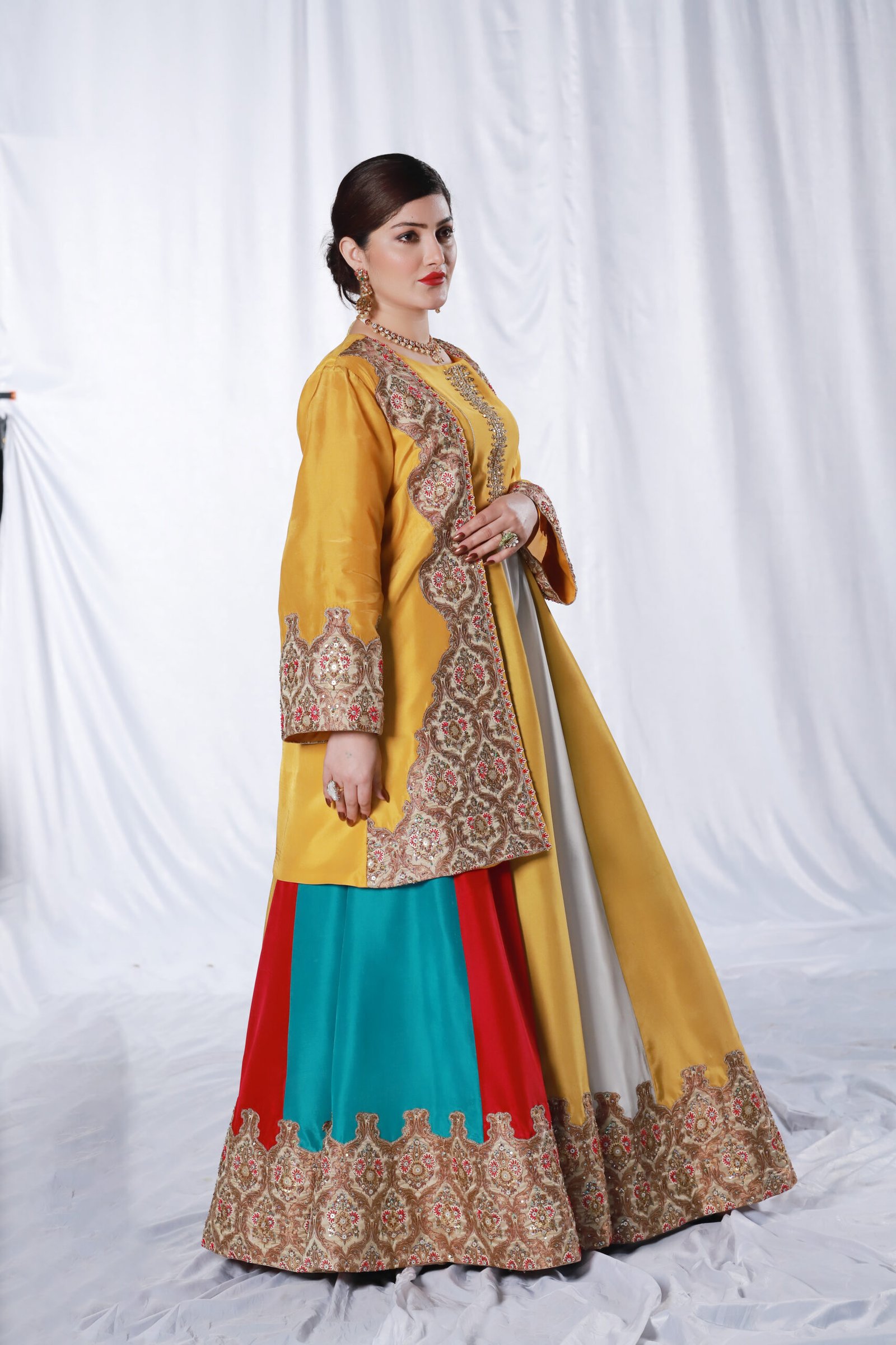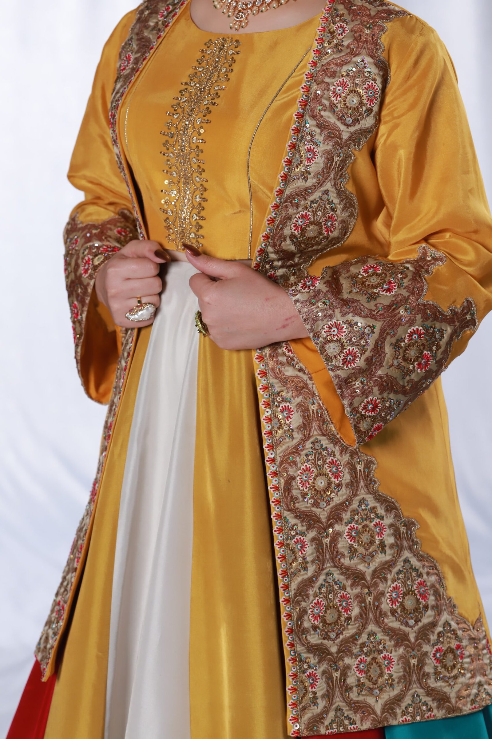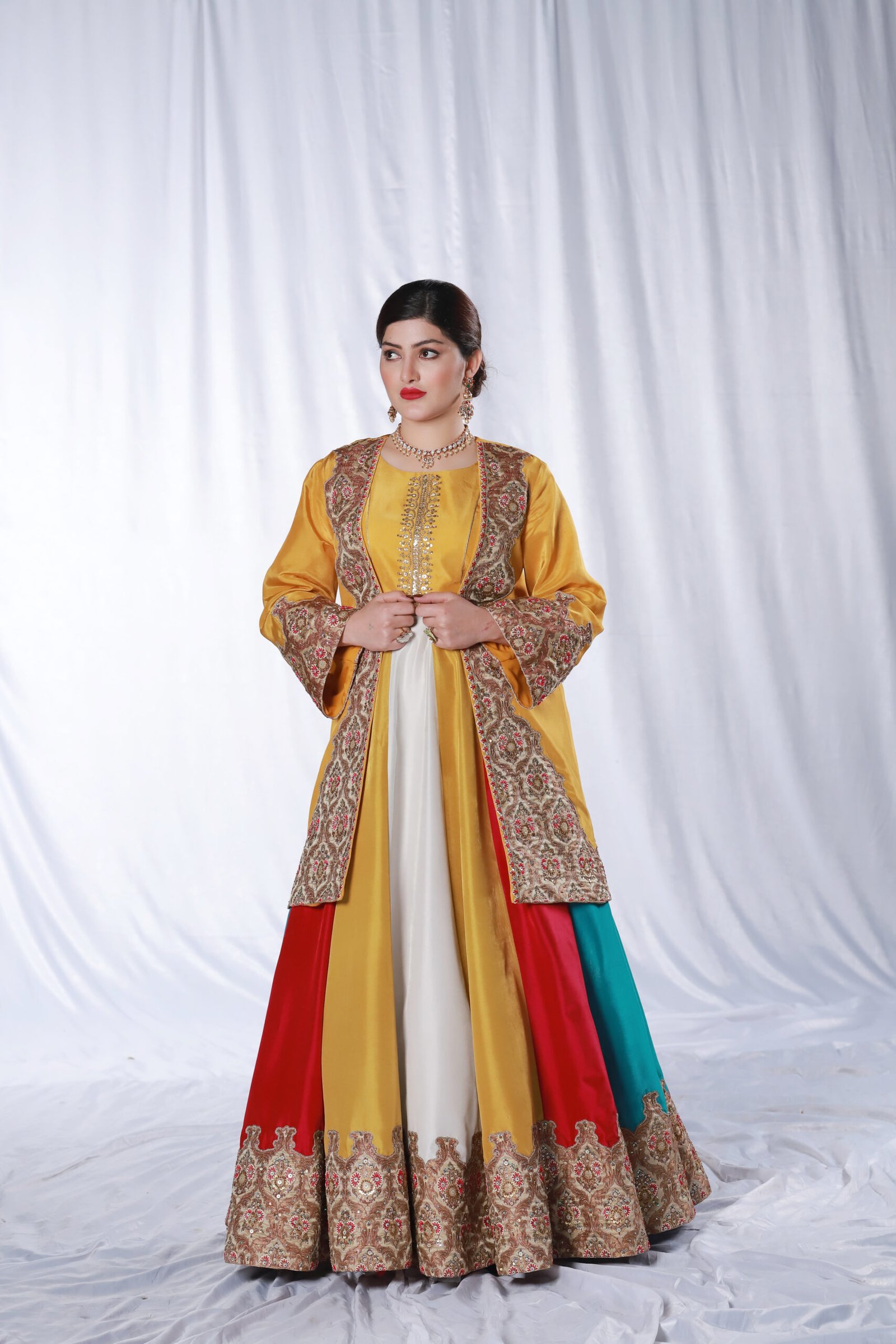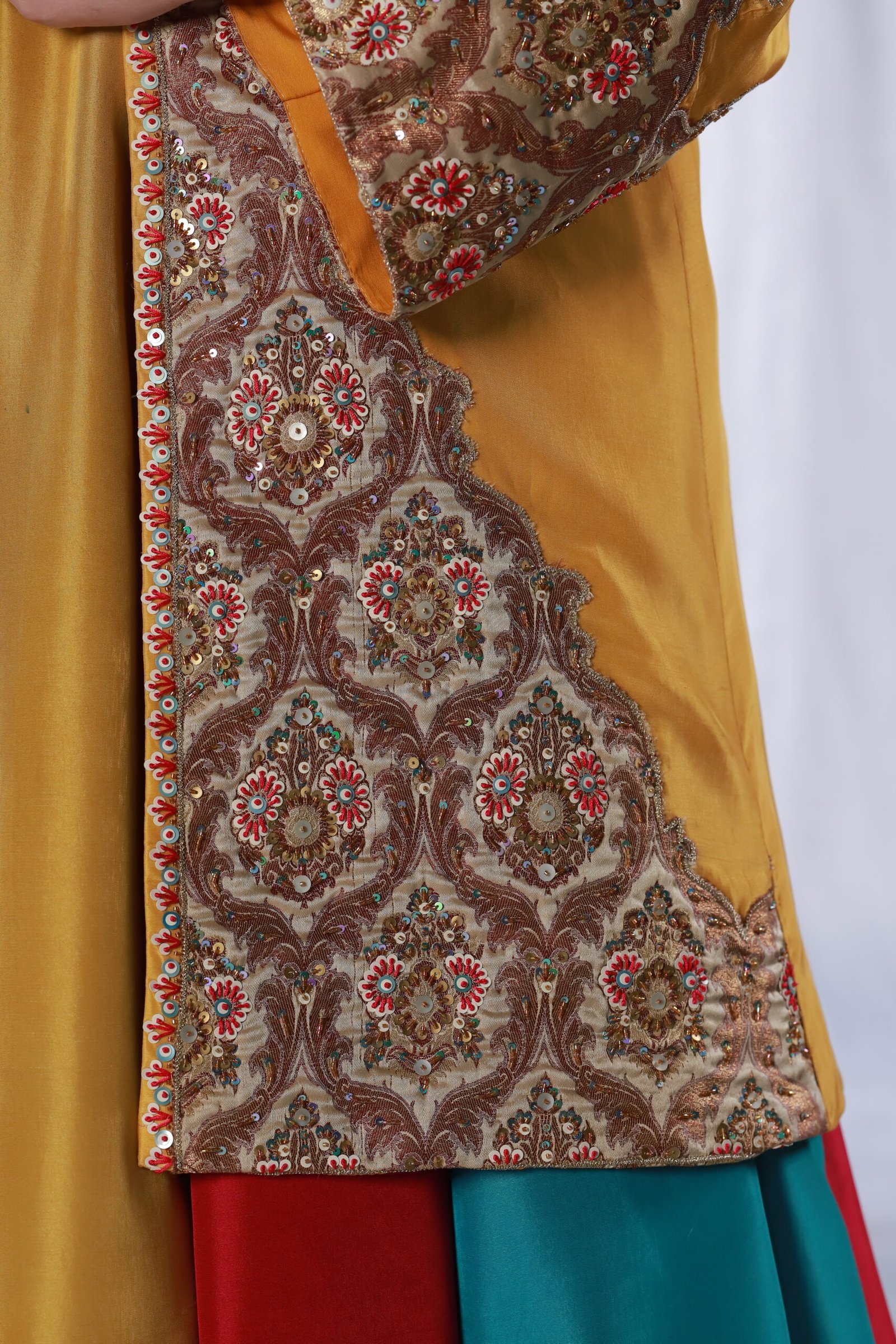 This three-piece ensemble is crafted on soft tessel silk, designed in a striking palette of mustard, pink, blue, and off-white. The front open jacket features intricate applique work paired with delicate hand embroidery, finished with resham, sequin, katdana, and moti detailing for a refined, textured look. The panels of the dress create a graceful flare, while the ornate embroidered borders add richness and depth.