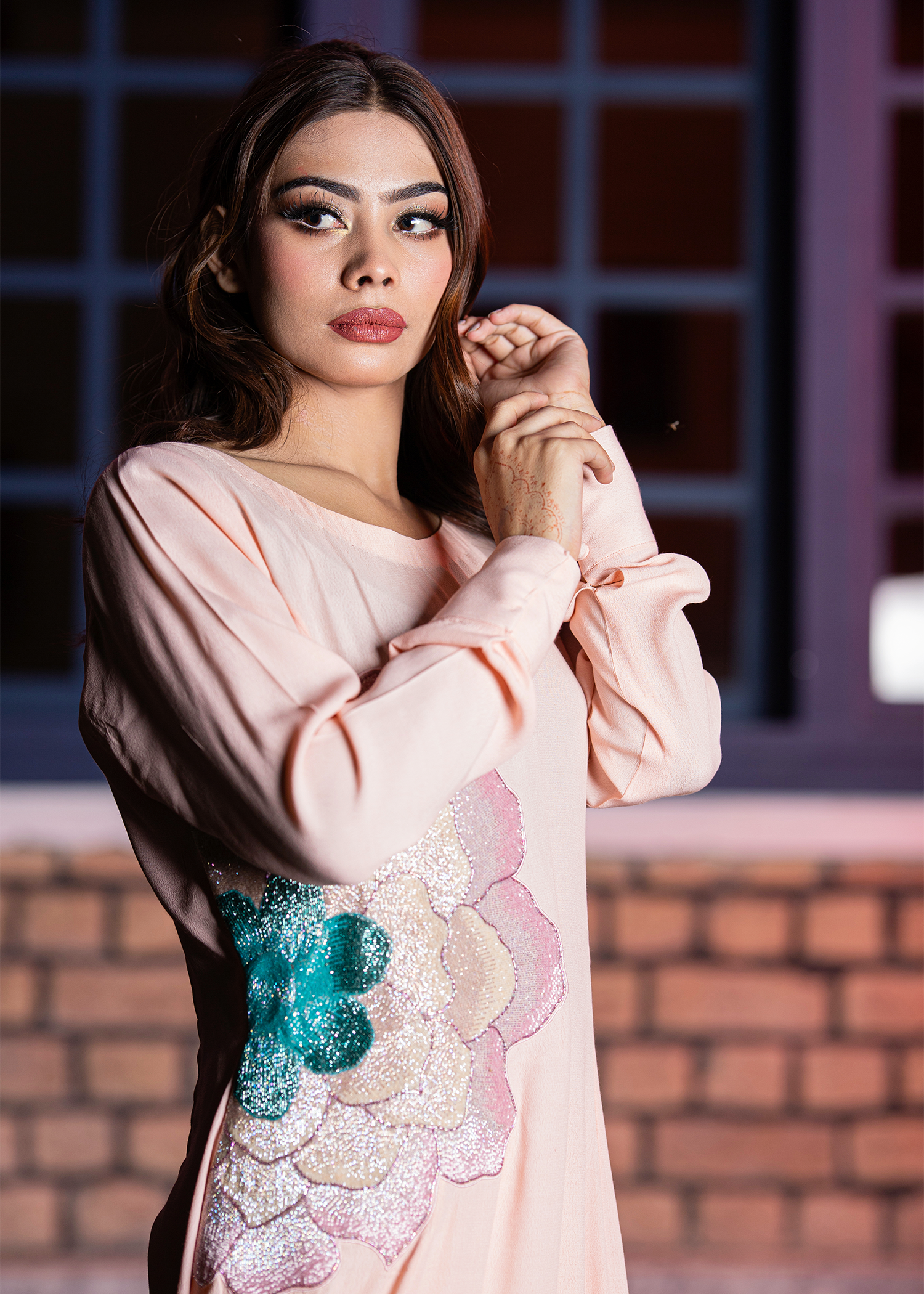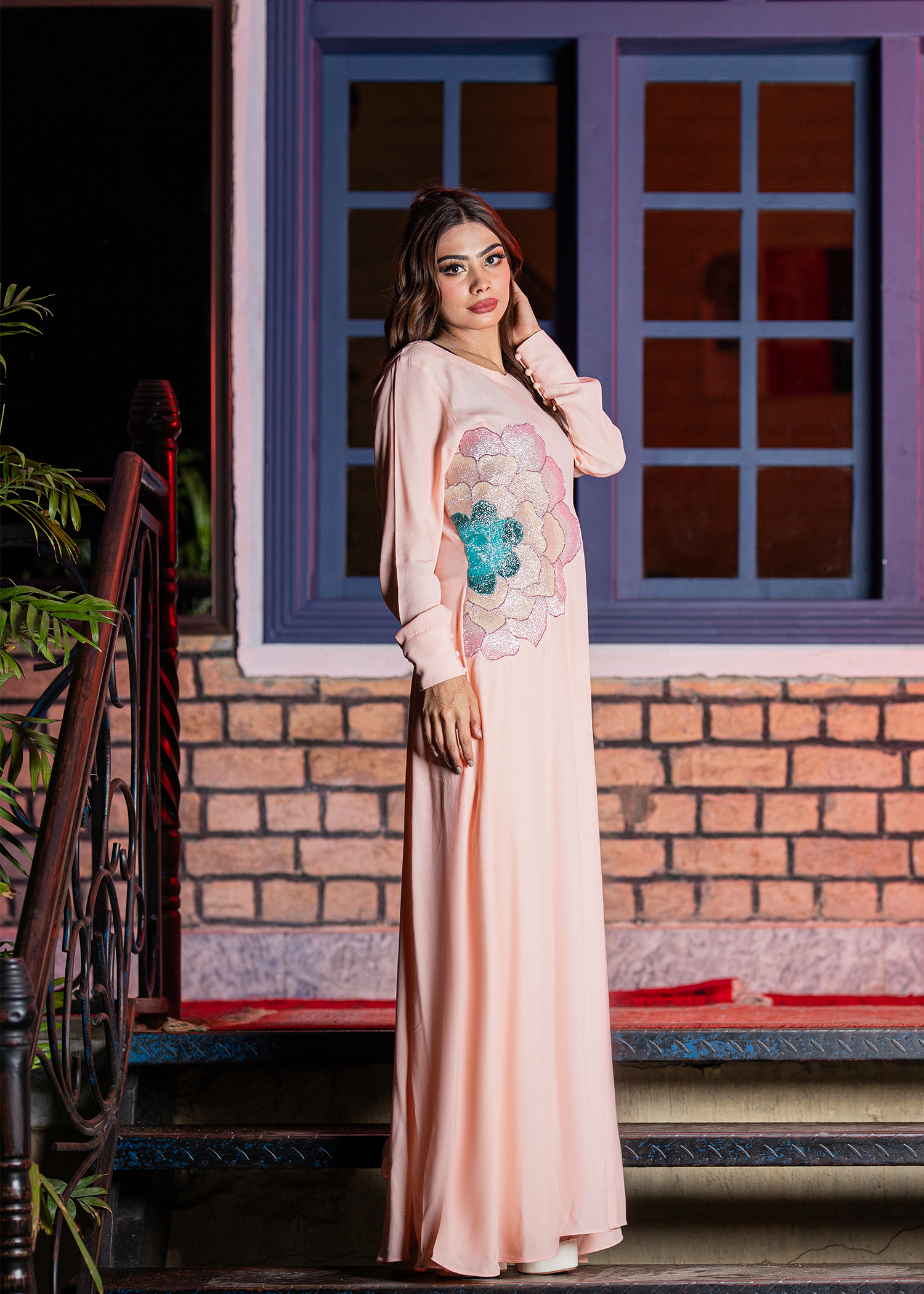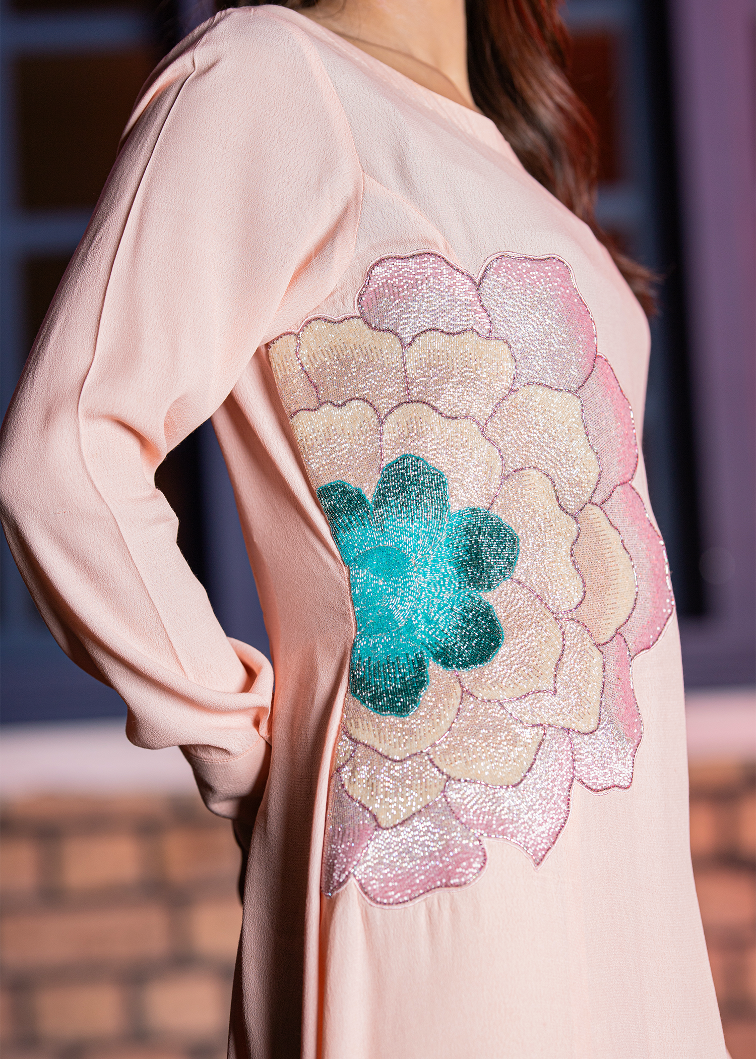 Soft peach georgette one-piece adorned with refined hand embellishment. Accented with intricate katdana work forming a statement floral motif. Lightweight fabric drapes elegantly, offering a graceful and modern silhouette. Ideal for semi-formal gatherings and contemporary festive wear.