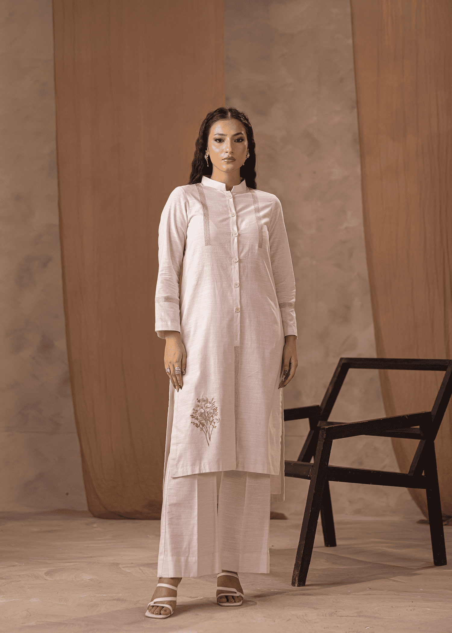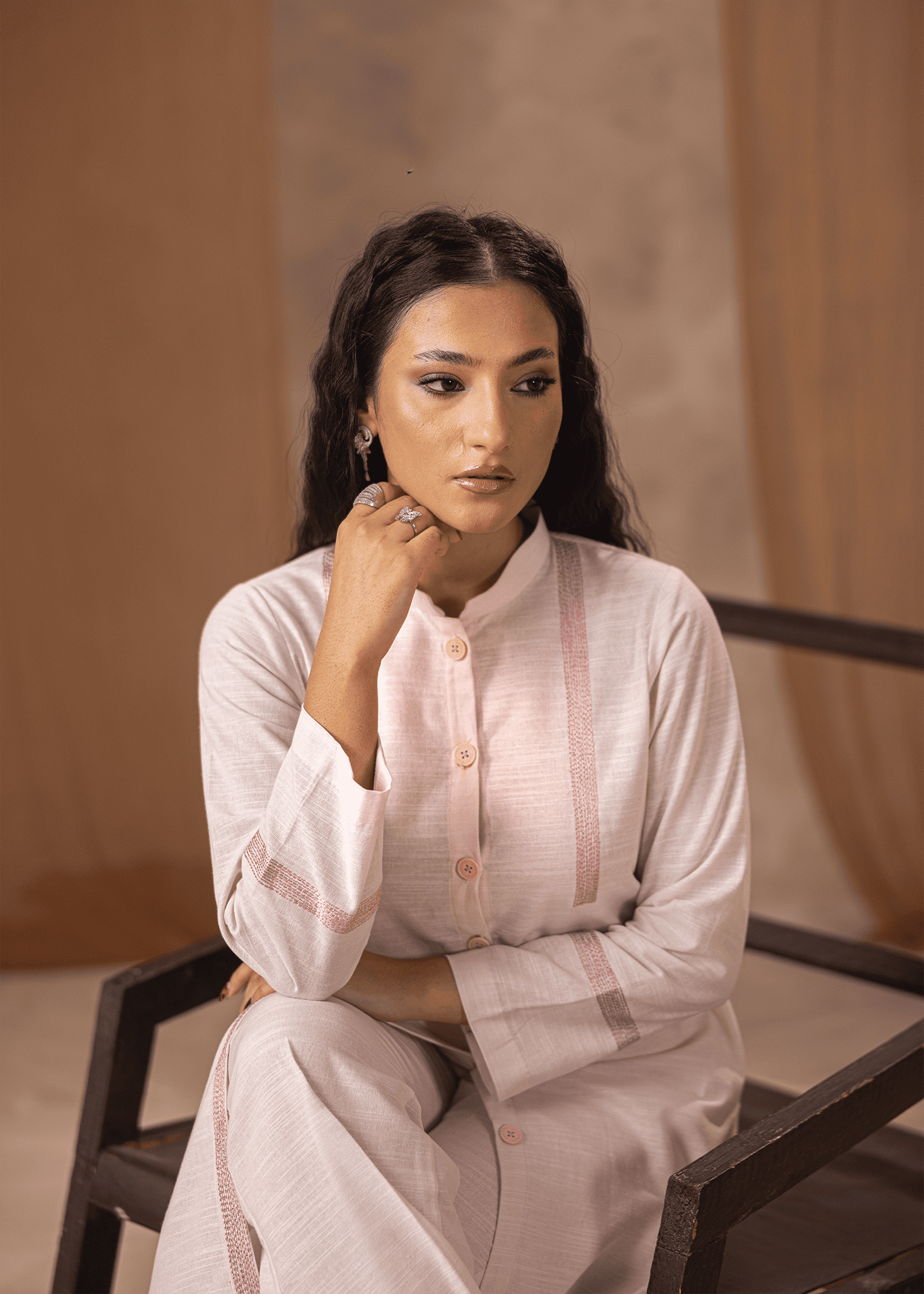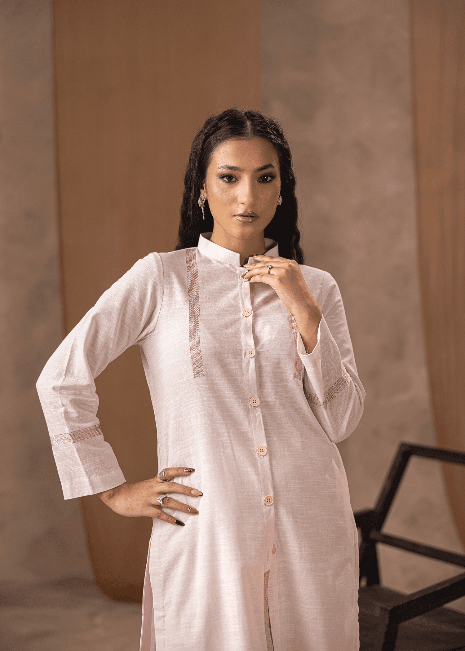Two-piece blush pink khaddar, adorned with subtle machine embroidery. A refined design that balances modest elegance with everyday sophistication.