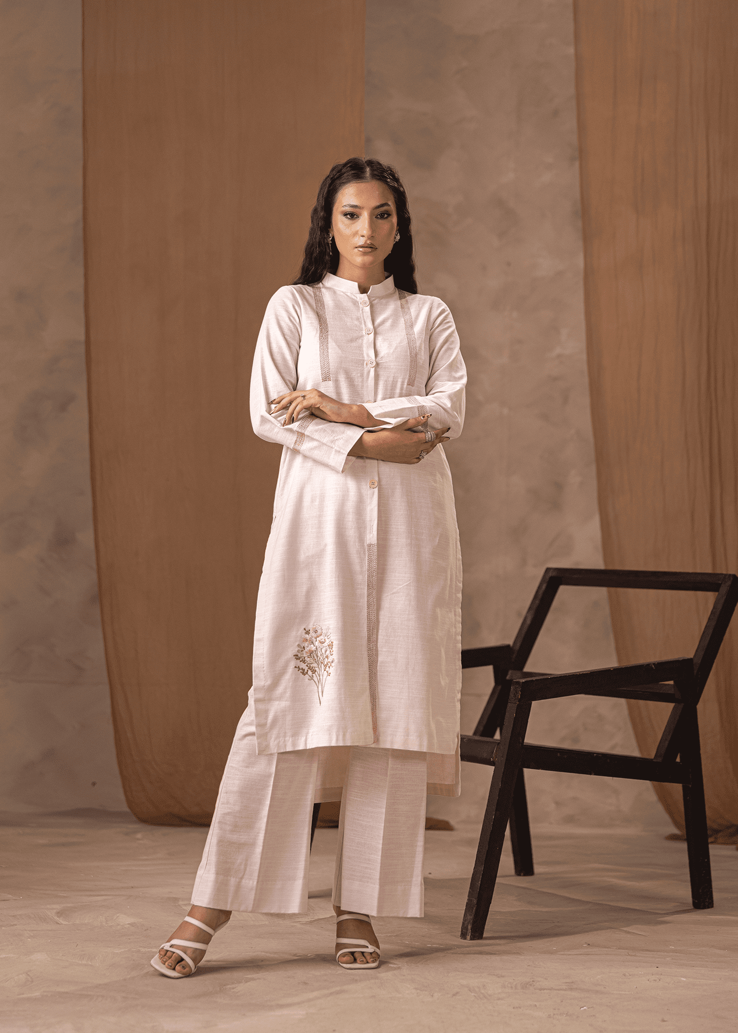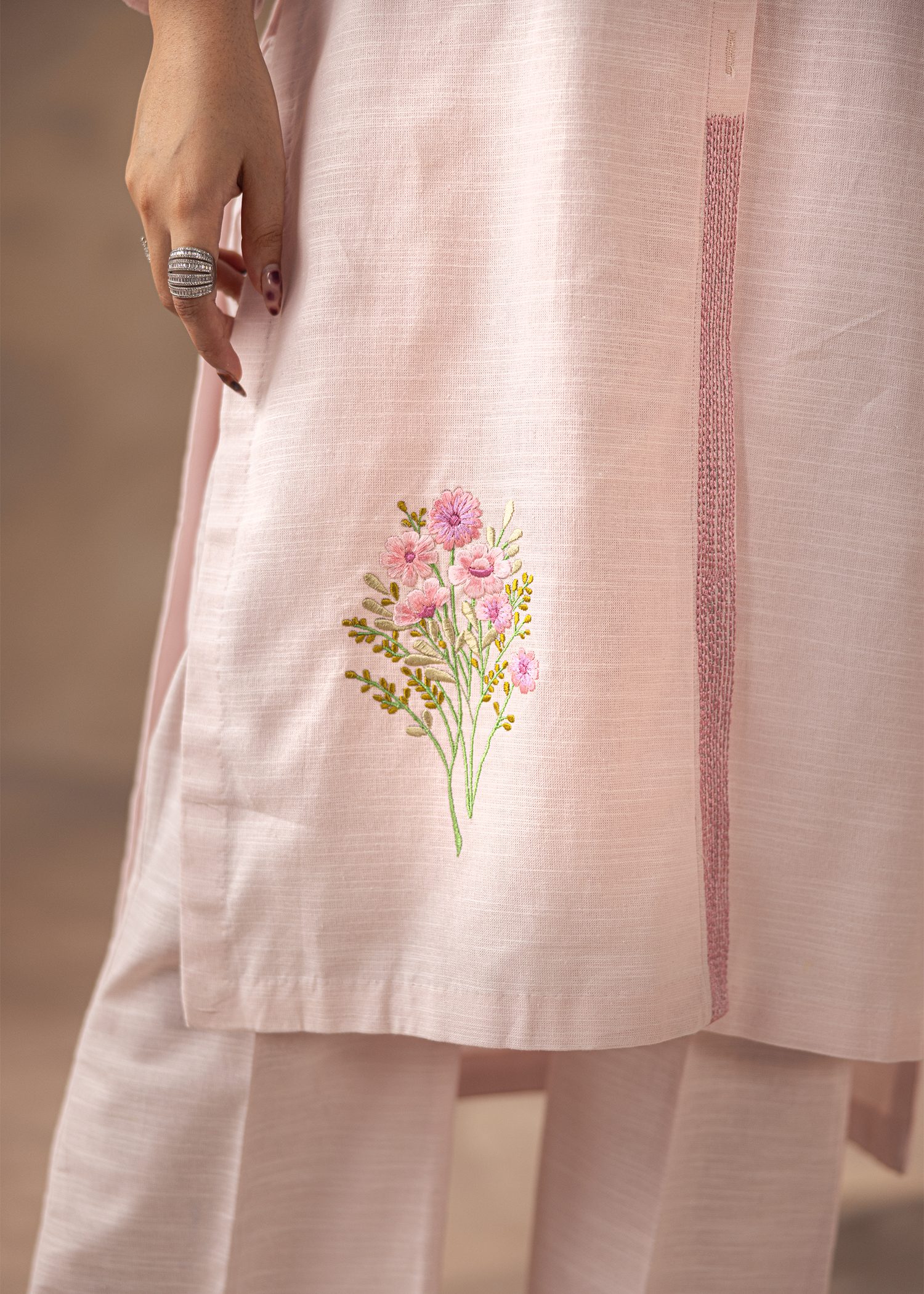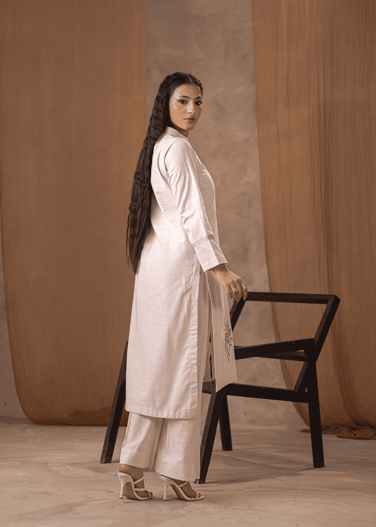 Two-piece blush pink khaddar, adorned with subtle machine embroidery. A refined design that balances modest elegance with everyday sophistication.