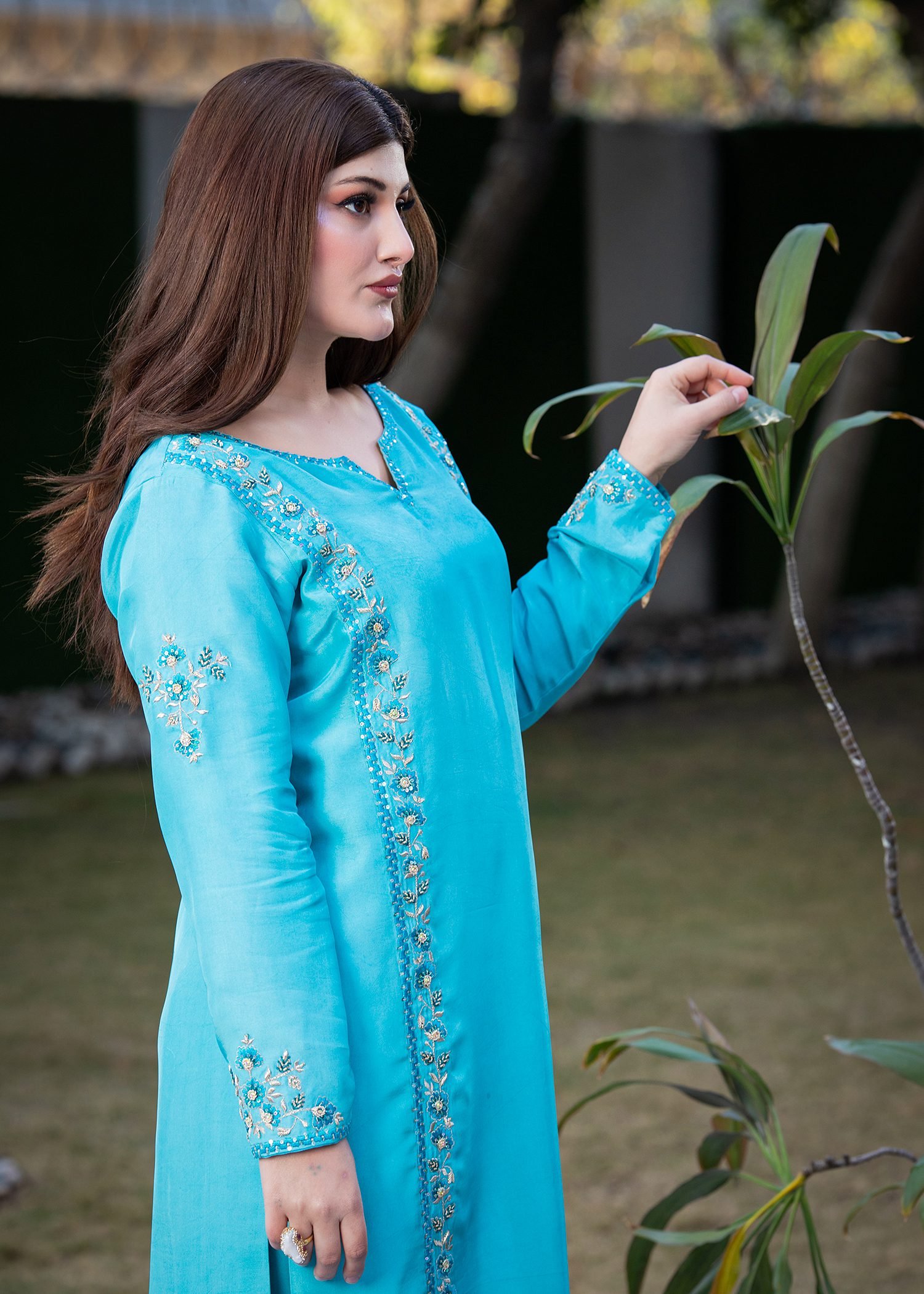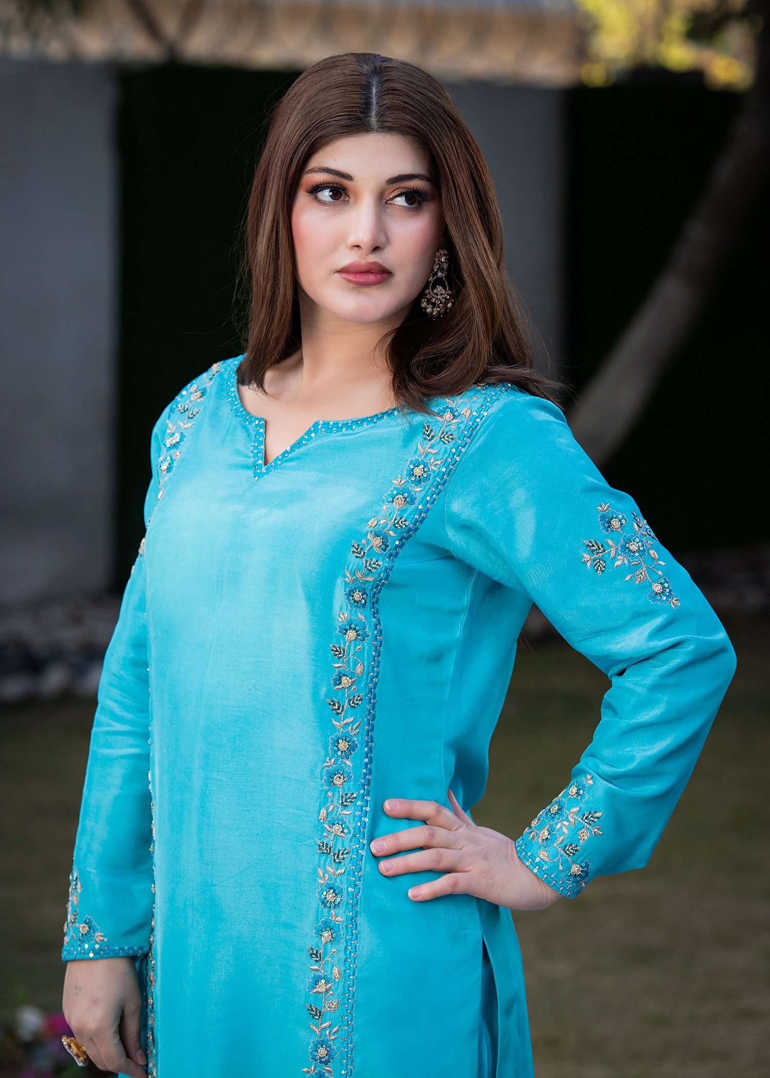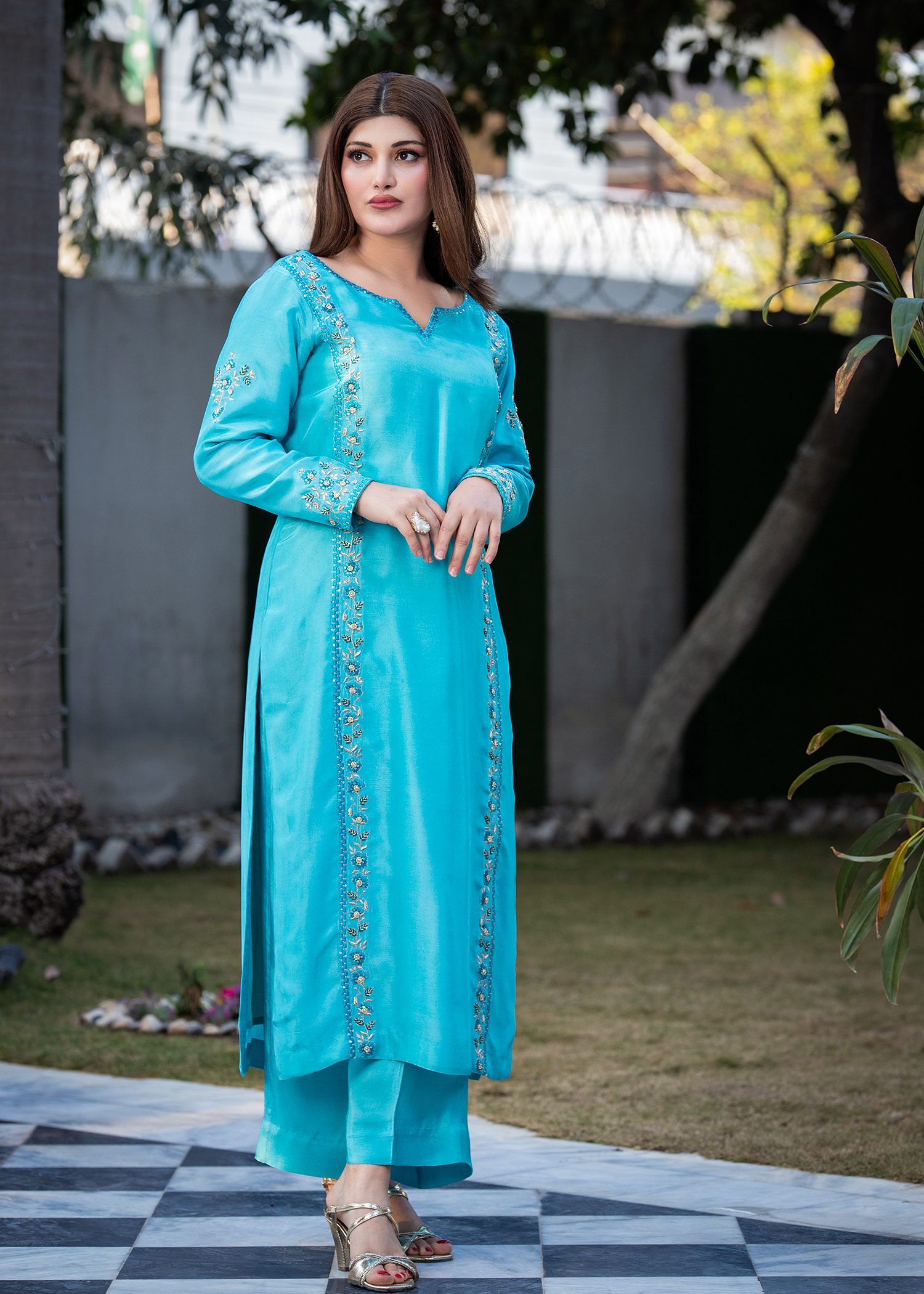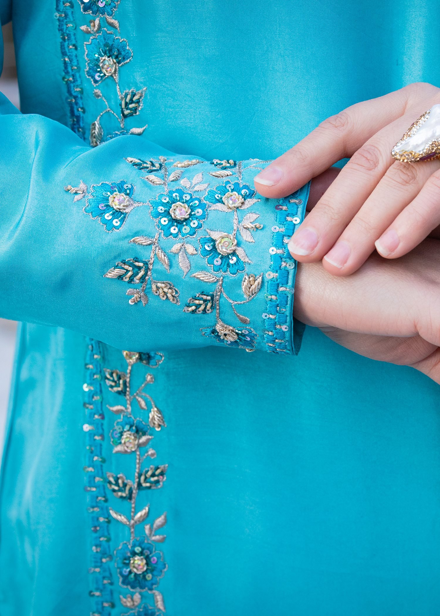 Rendered in striking Electric Blue, this ensemble is crafted from fluid Tassel silk that moves with ease. Linear machine embroidery frames the silhouette, while hand embellishment with cutdana, sequins, and Swarovski crystals adds calibrated shine along the panels and sleeves.
