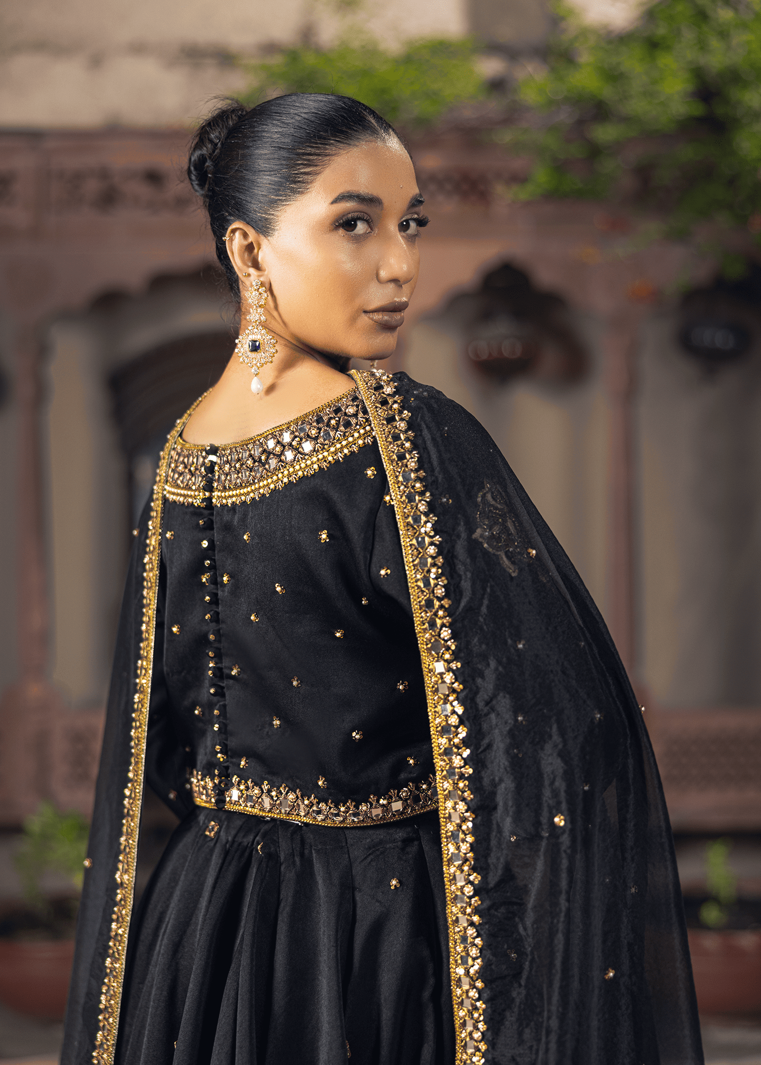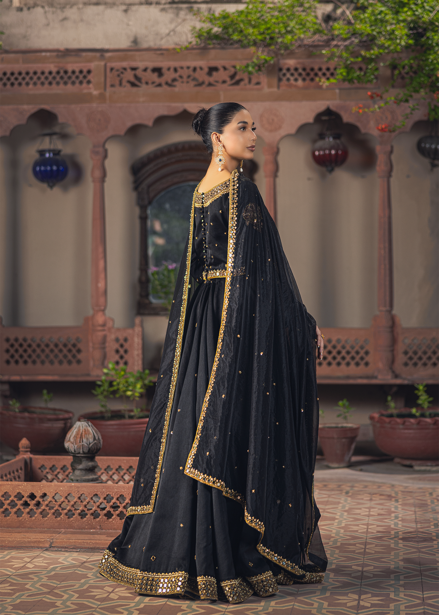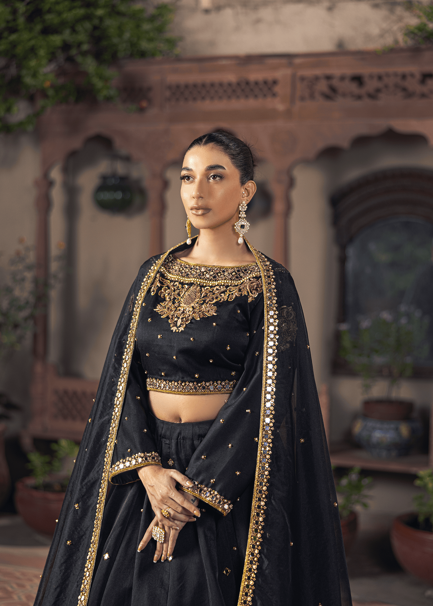 A three-piece set in jet black velvet silk with organza. The blouse and lehenga are enriched with mirror and zardozi embellishments, while the dupatta carries a finely detailed border, creating a statement of timeless elegance with contemporary allure.