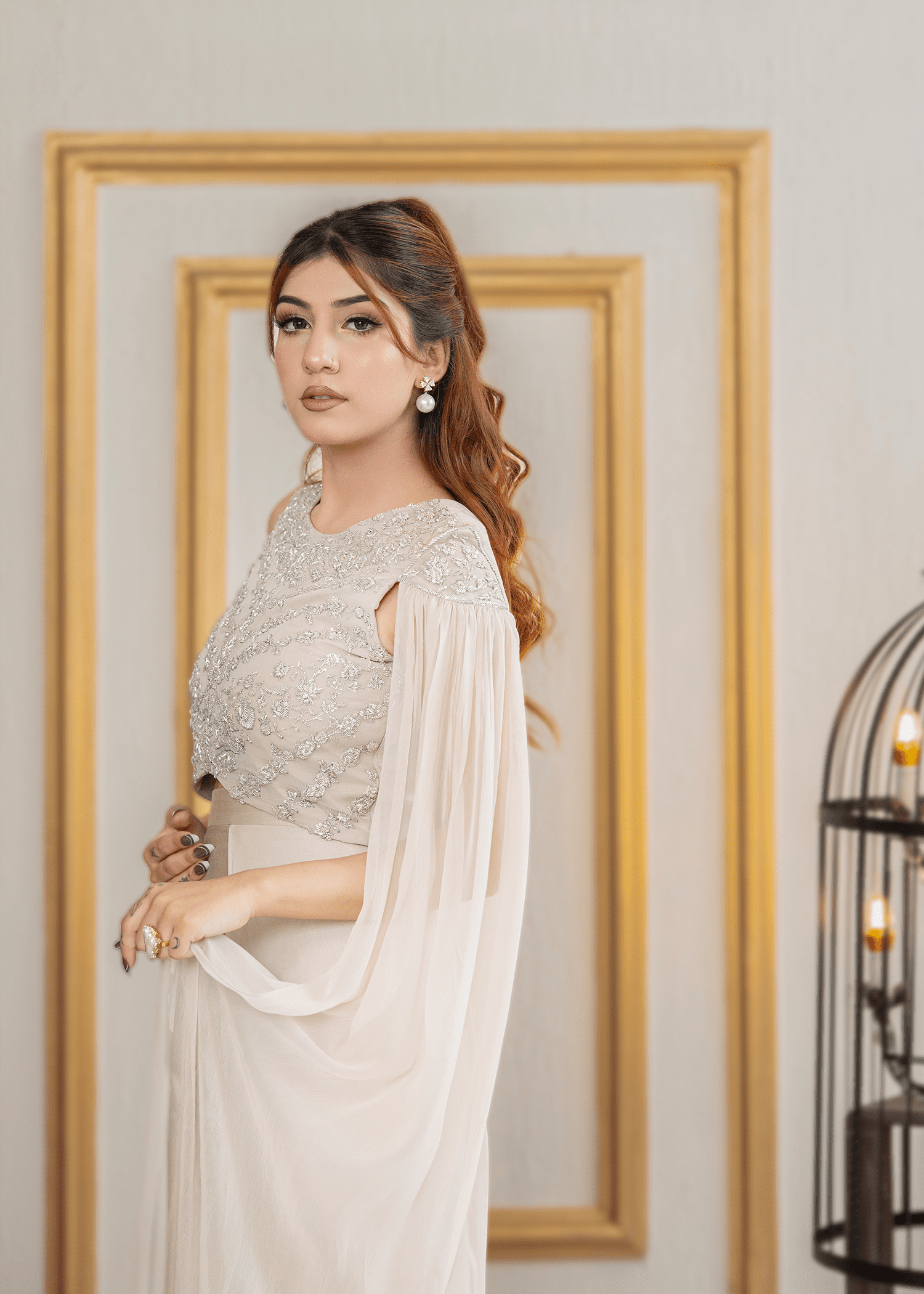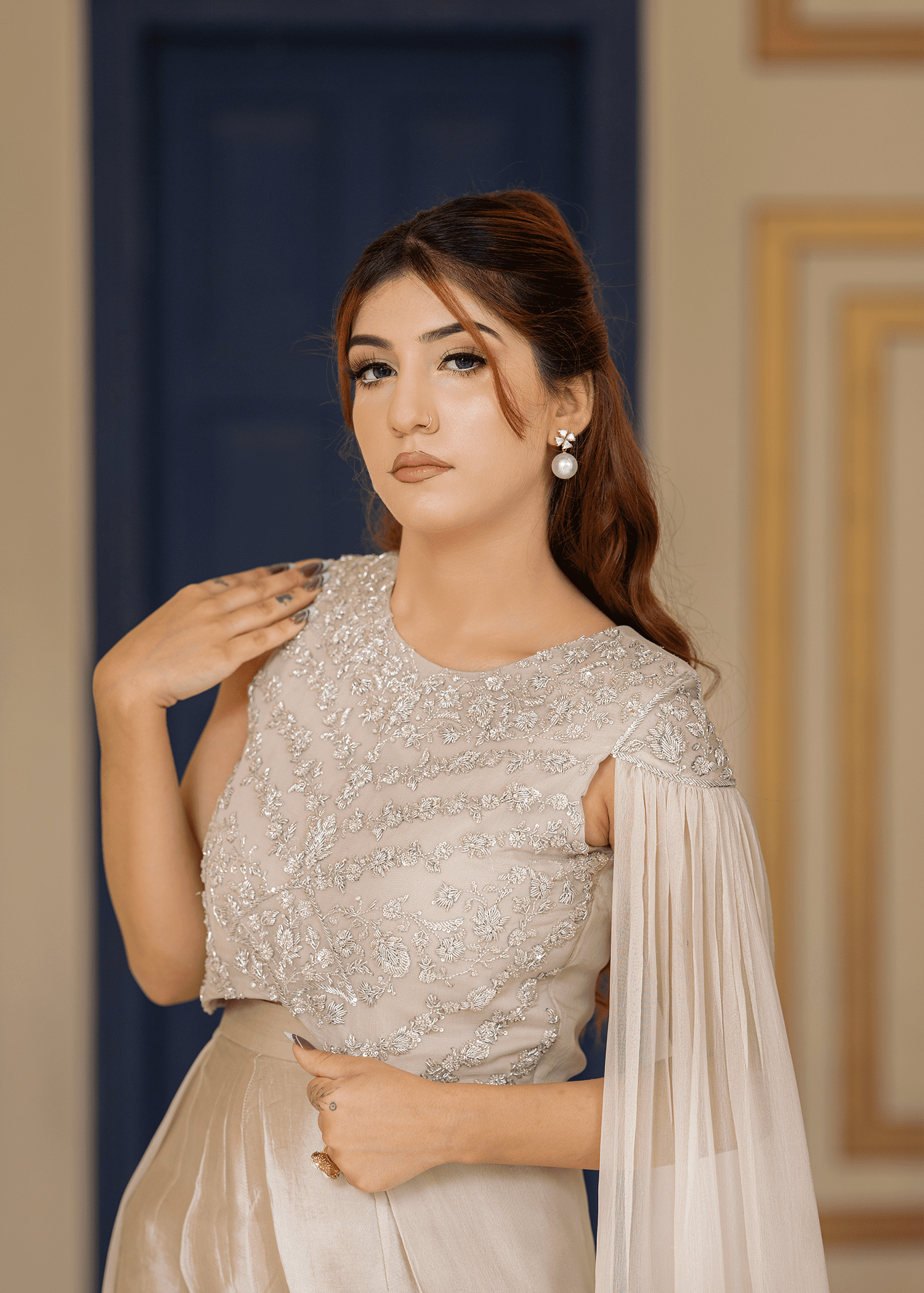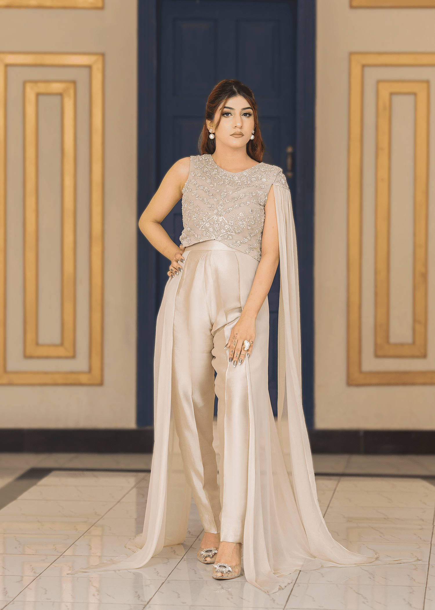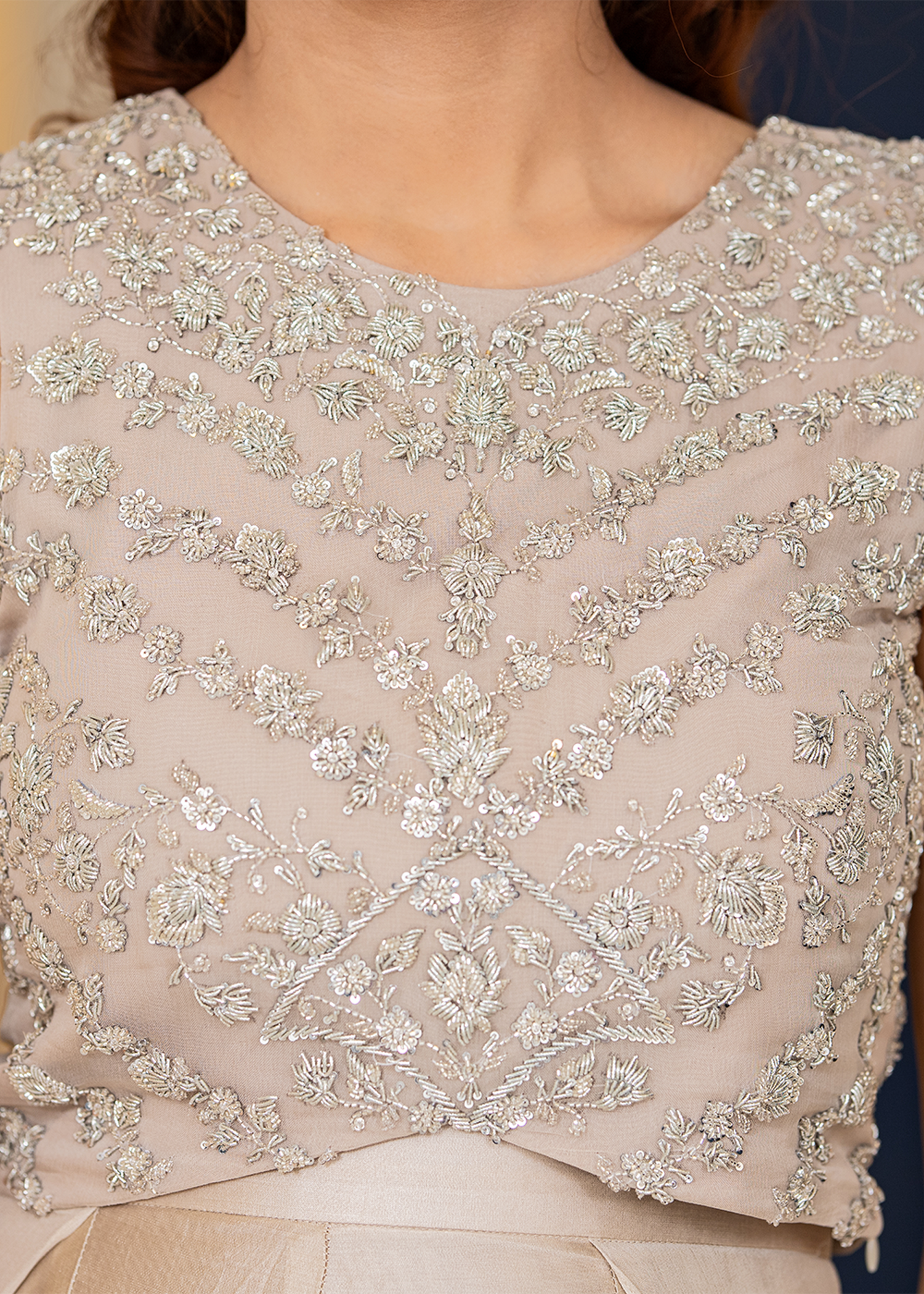 A refined two-piece in silk grey, tailored from pure chiffon and sheesha silk. Accented with intricate hand embroidery, this ensemble embodies quiet sophistication and timeless elegance.