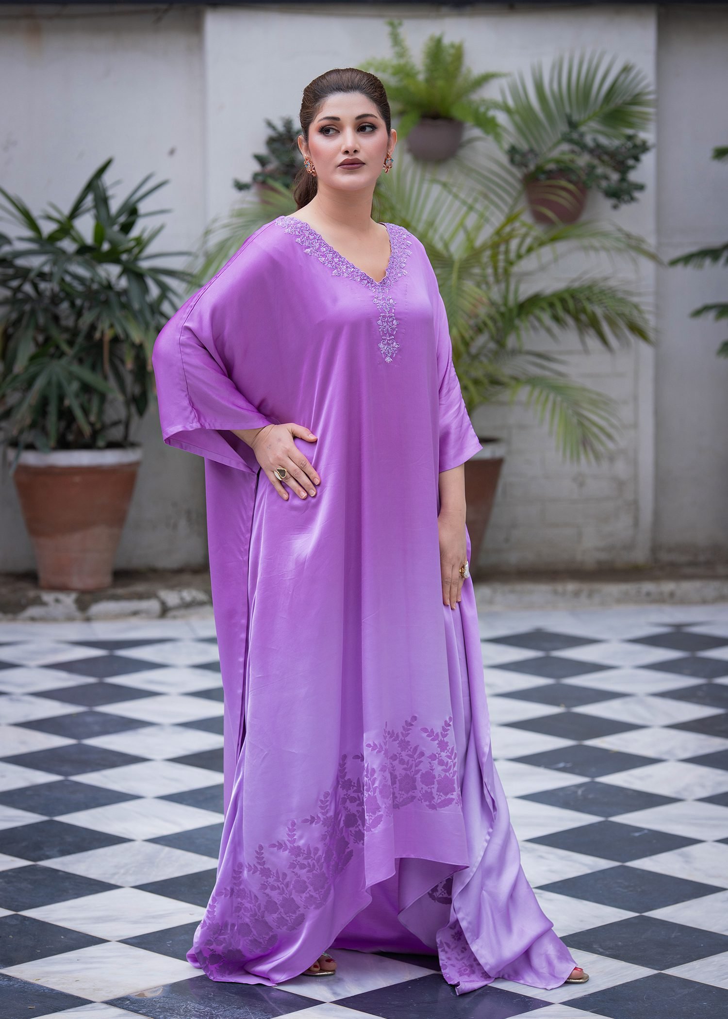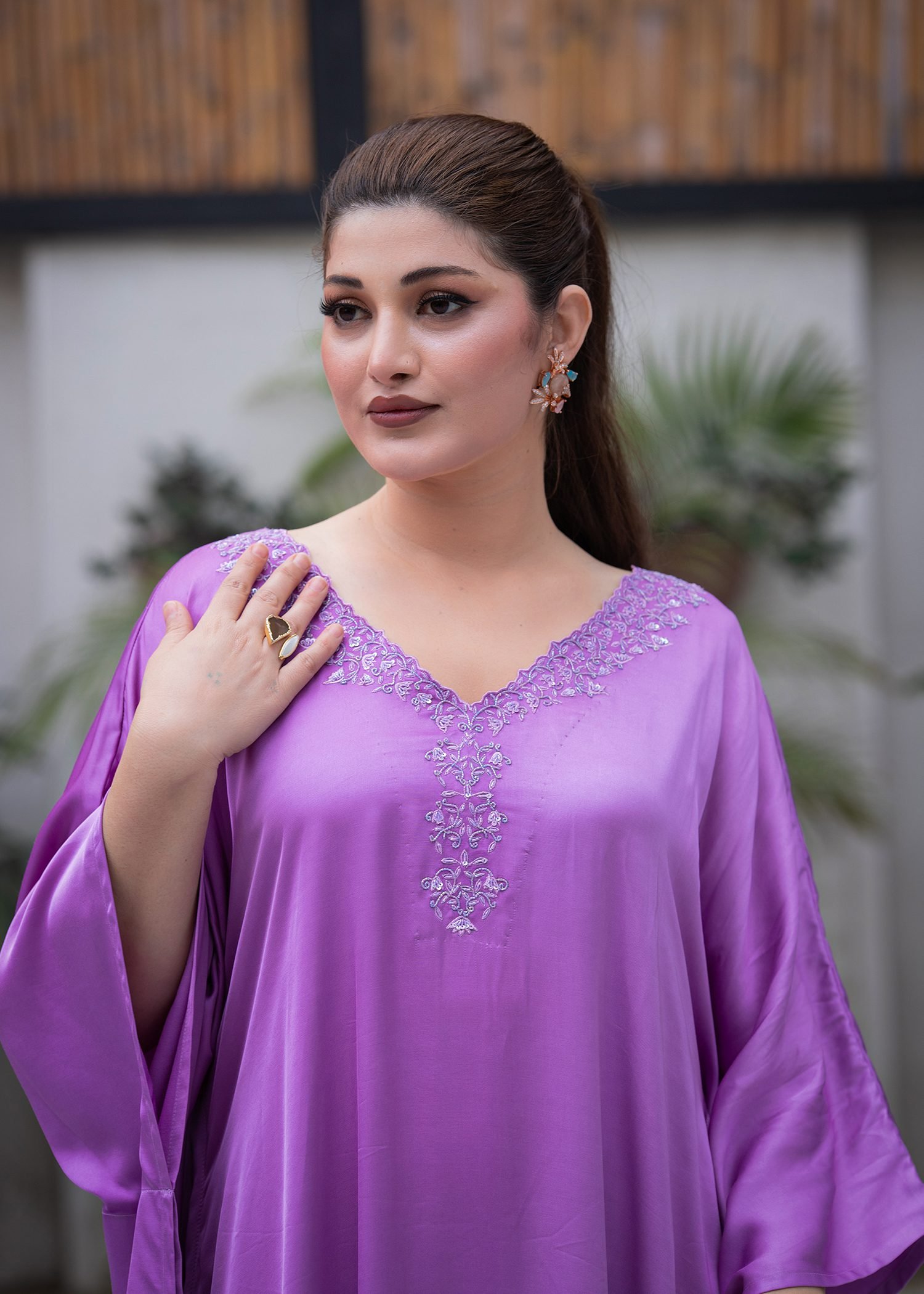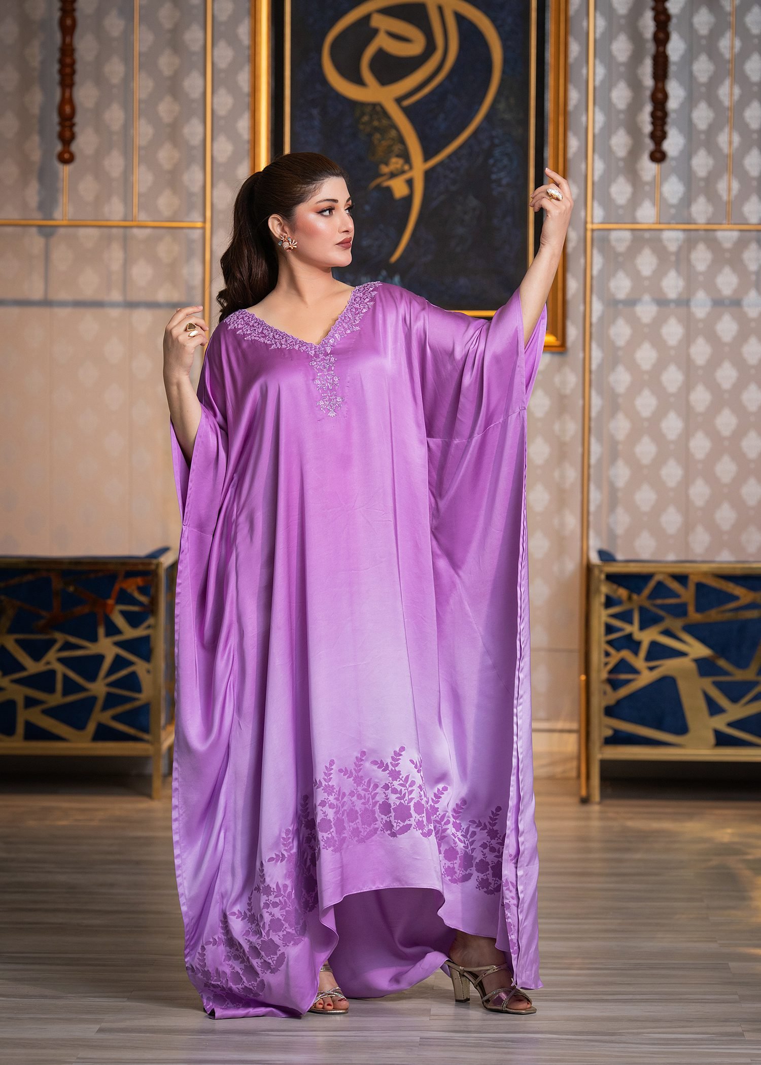 Rendered in a soft Lilac tone, this ensemble is crafted from smooth satin silk with a fluid, cape-style fall. Delicate machine embroidery enhances the neckline, while hand embellishment with cutdana and sequins introduces subtle radiance. A coordinated block print along the hem adds depth and layered texture.