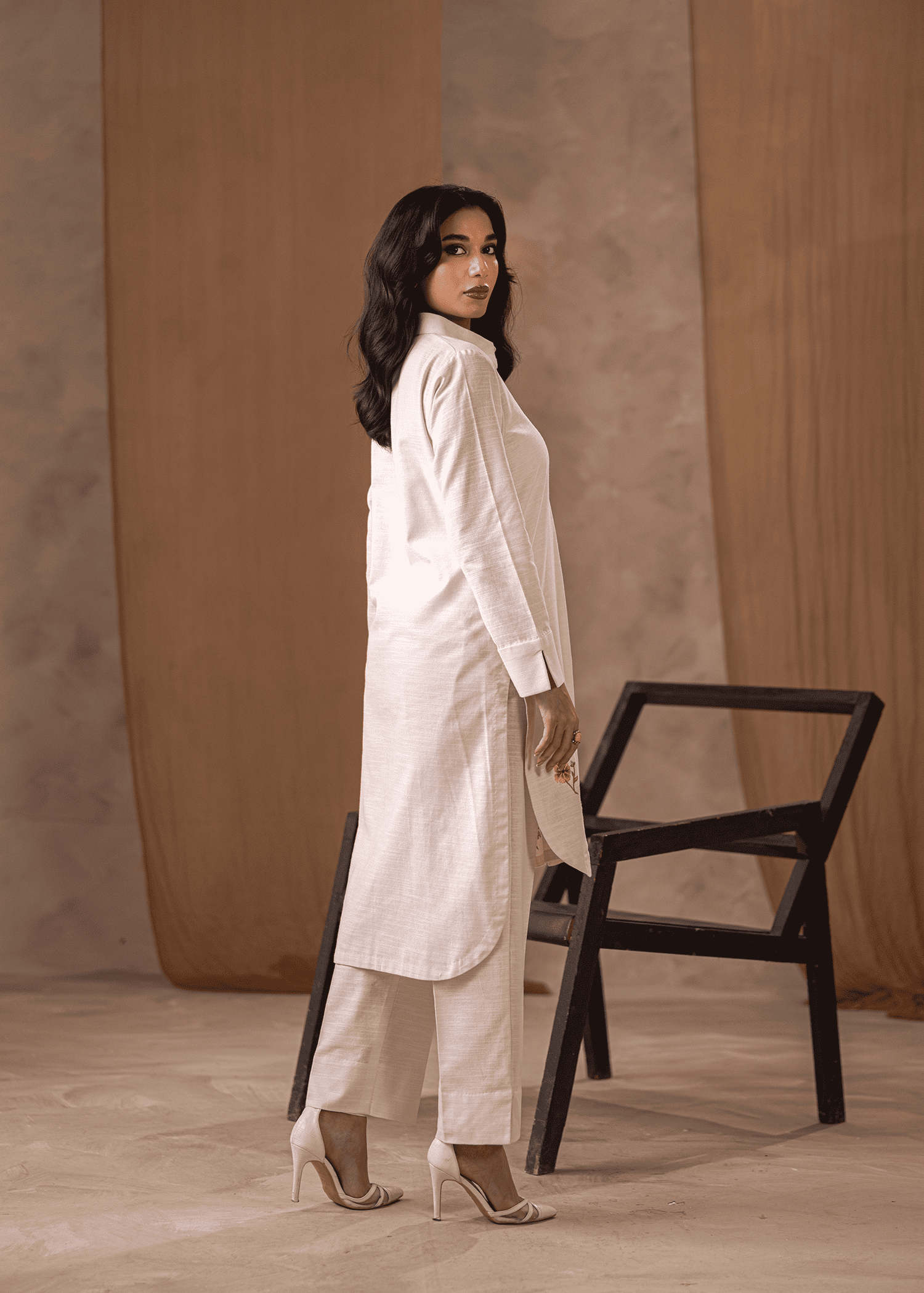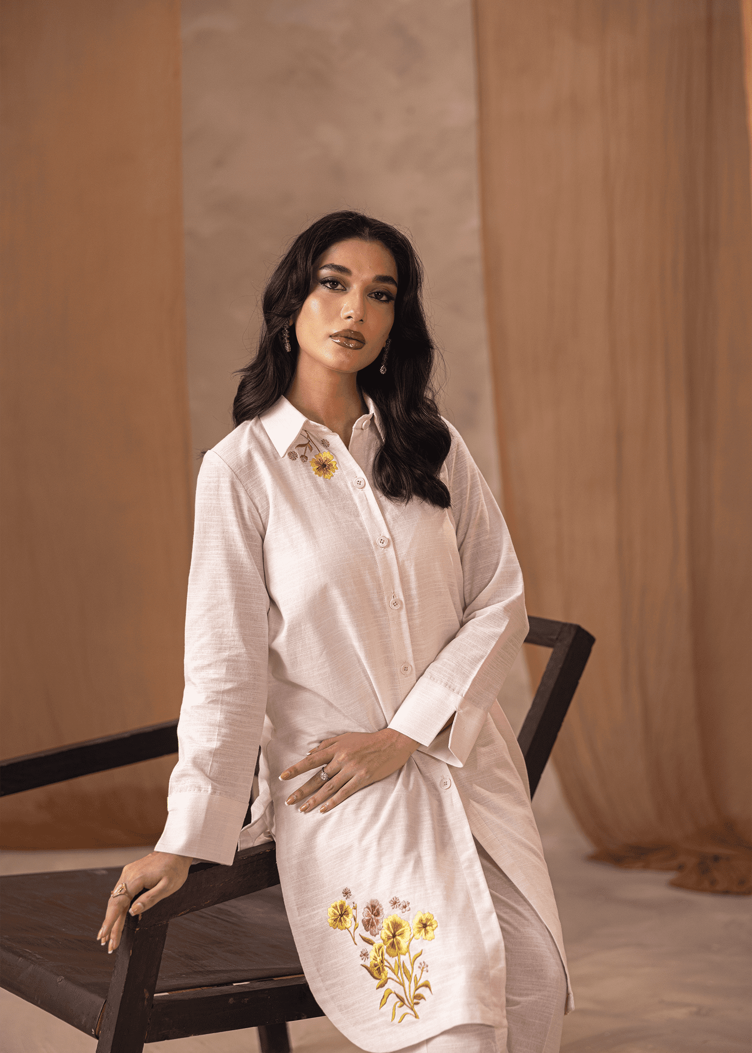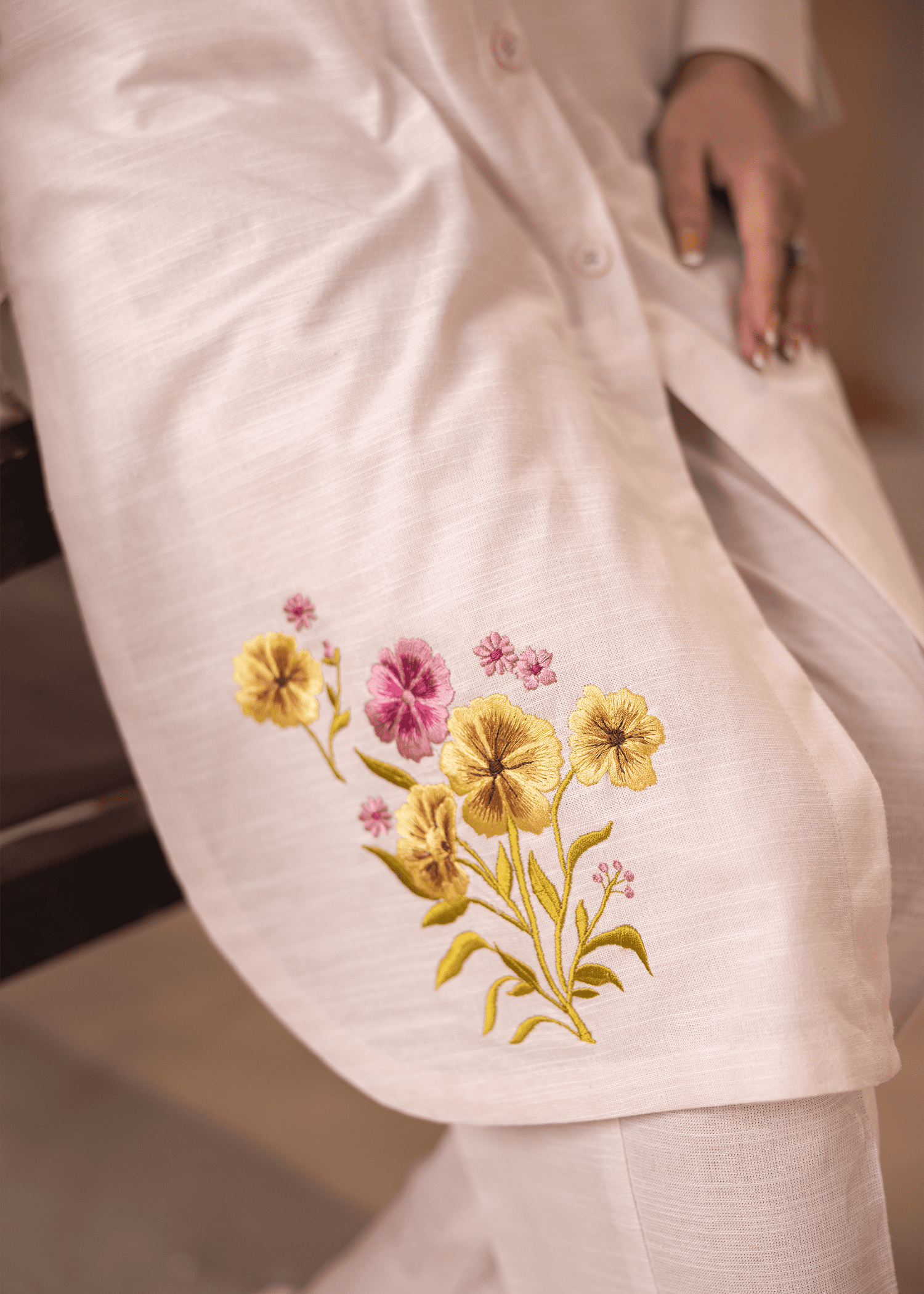 Two-piece in blush pink khaddar, delicately machine-embroidered to create a soft, elegant statement.