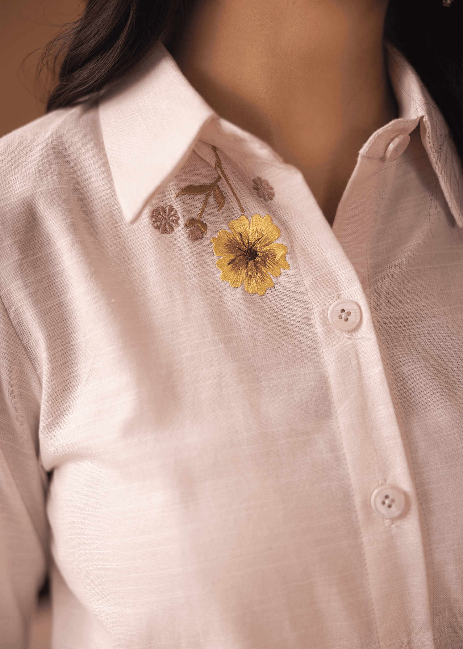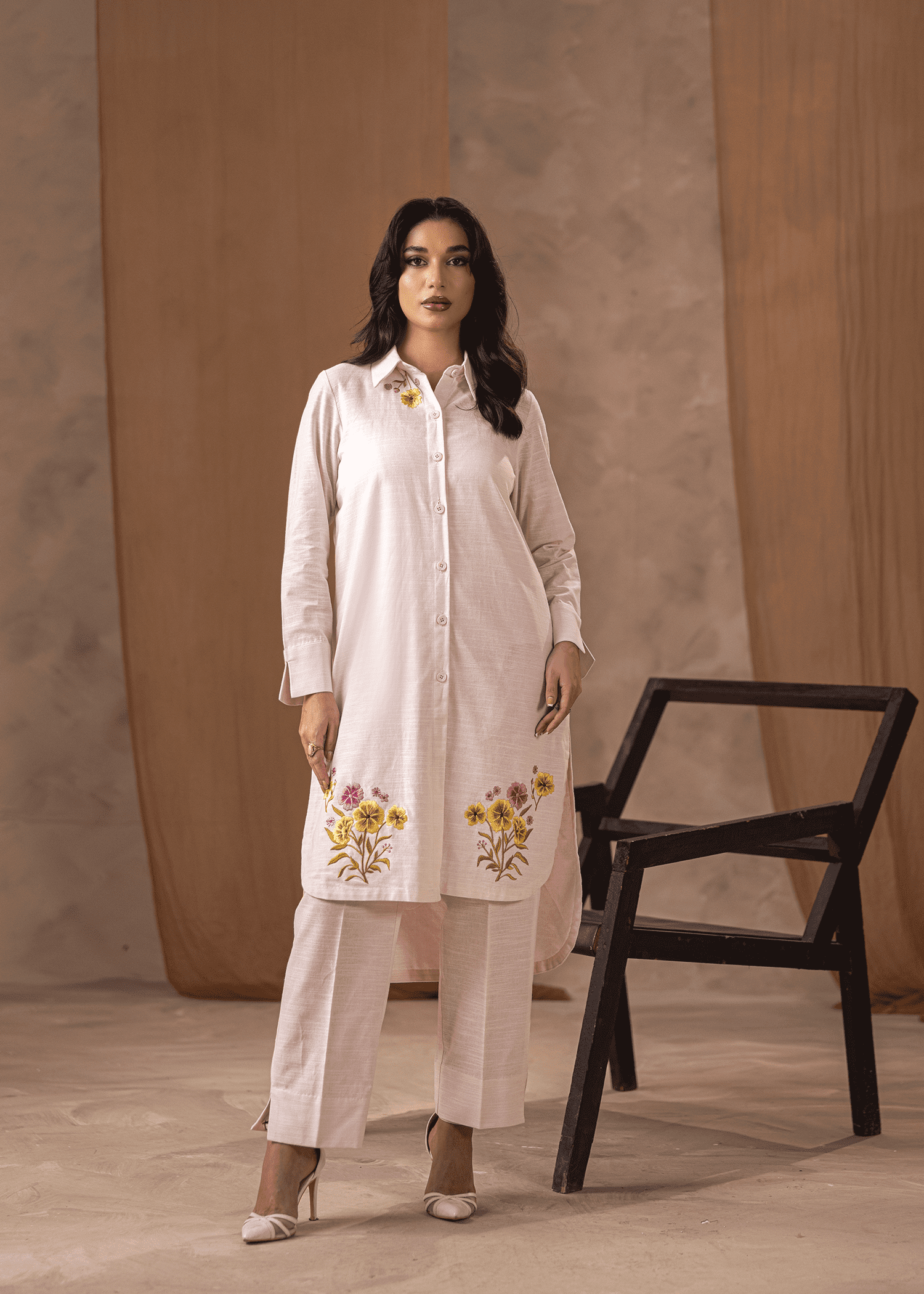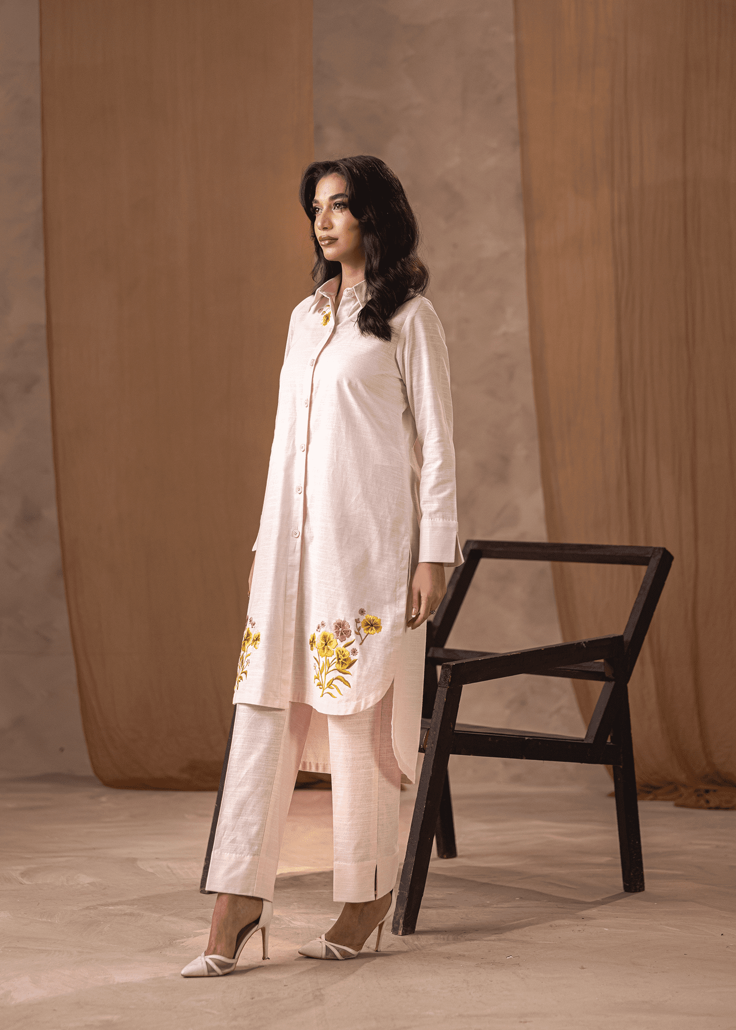 Two-piece in blush pink khaddar, delicately machine-embroidered to create a soft, elegant statement.