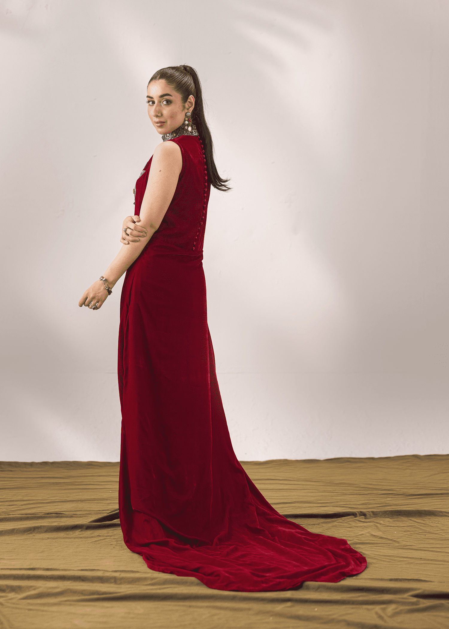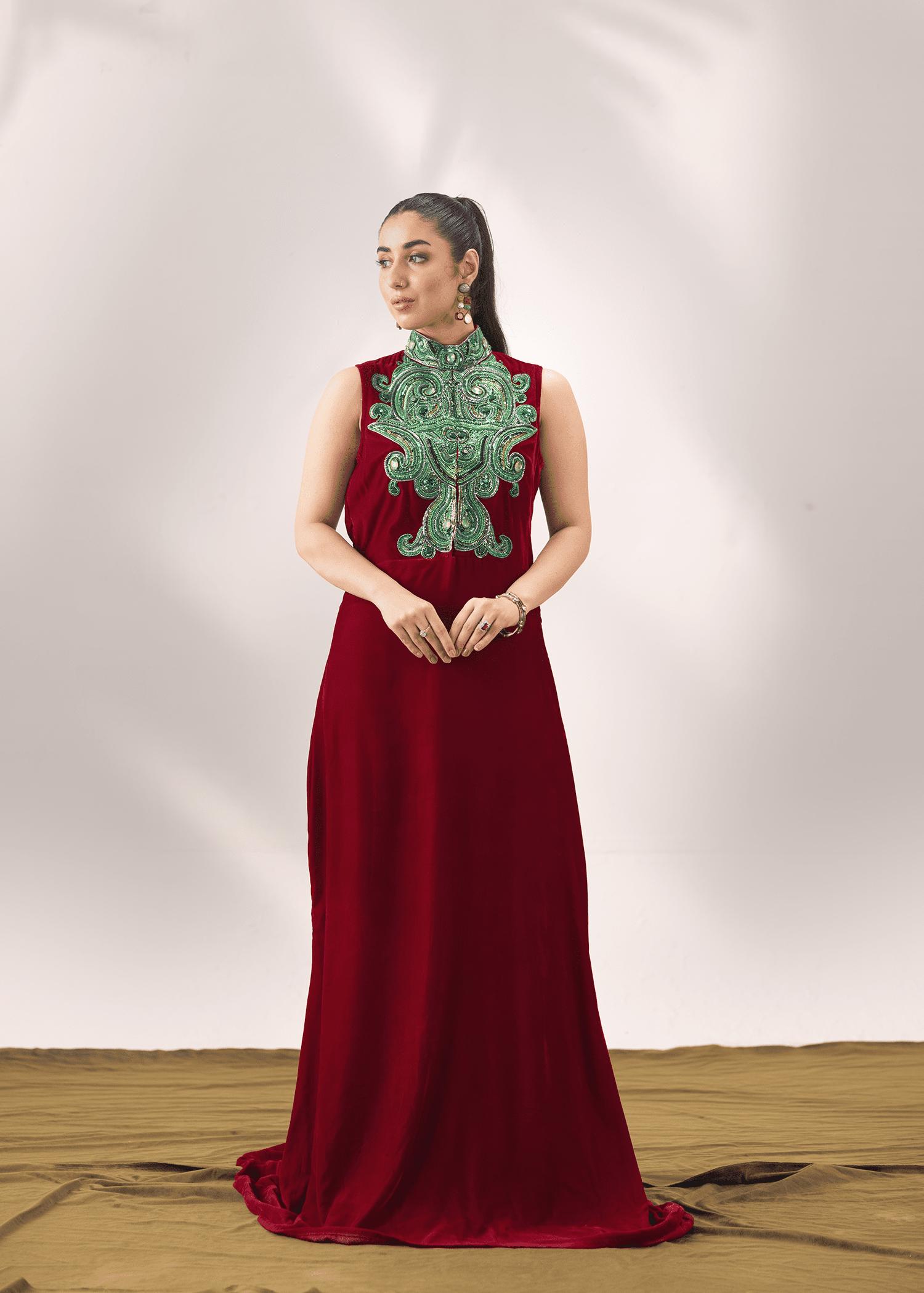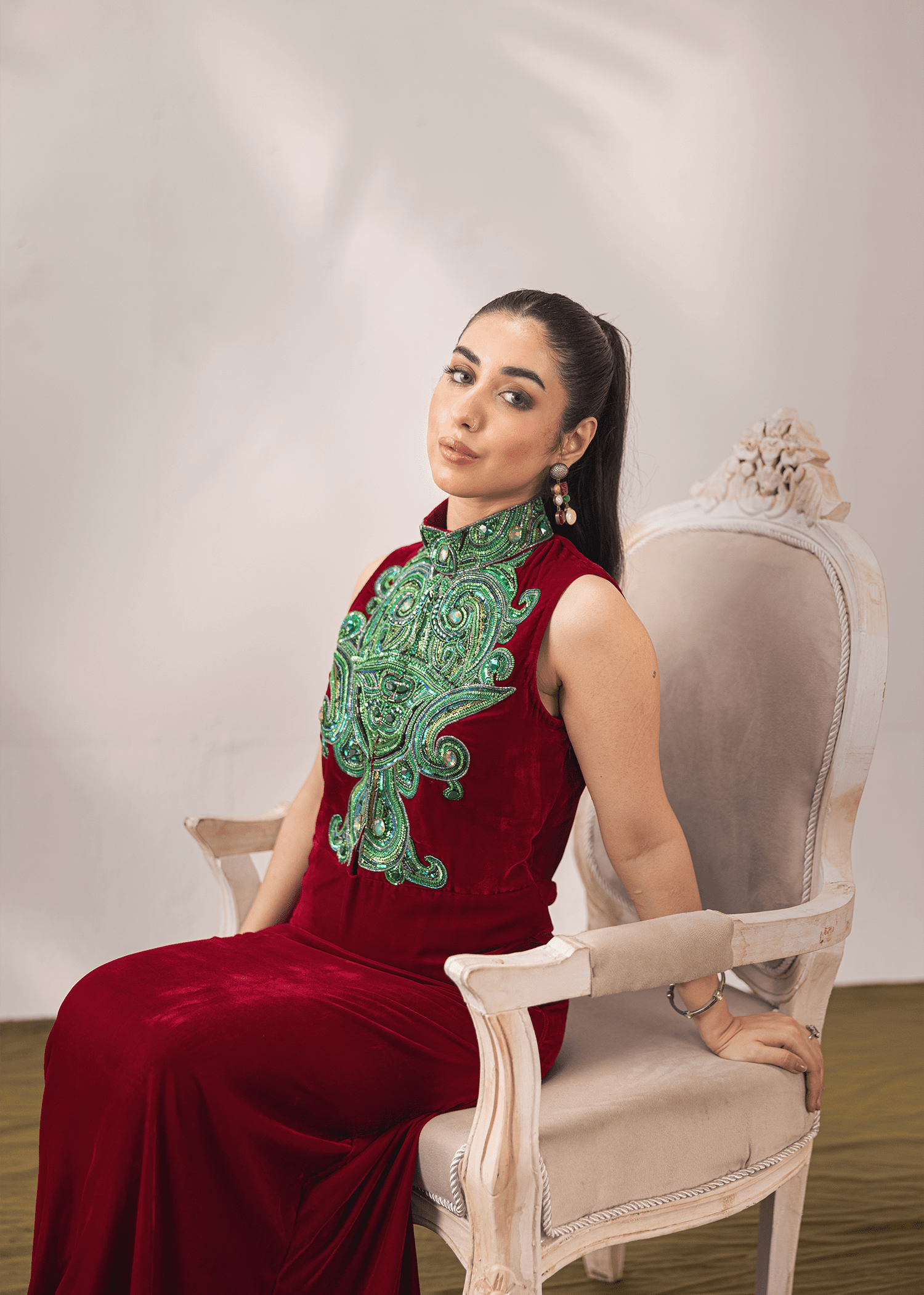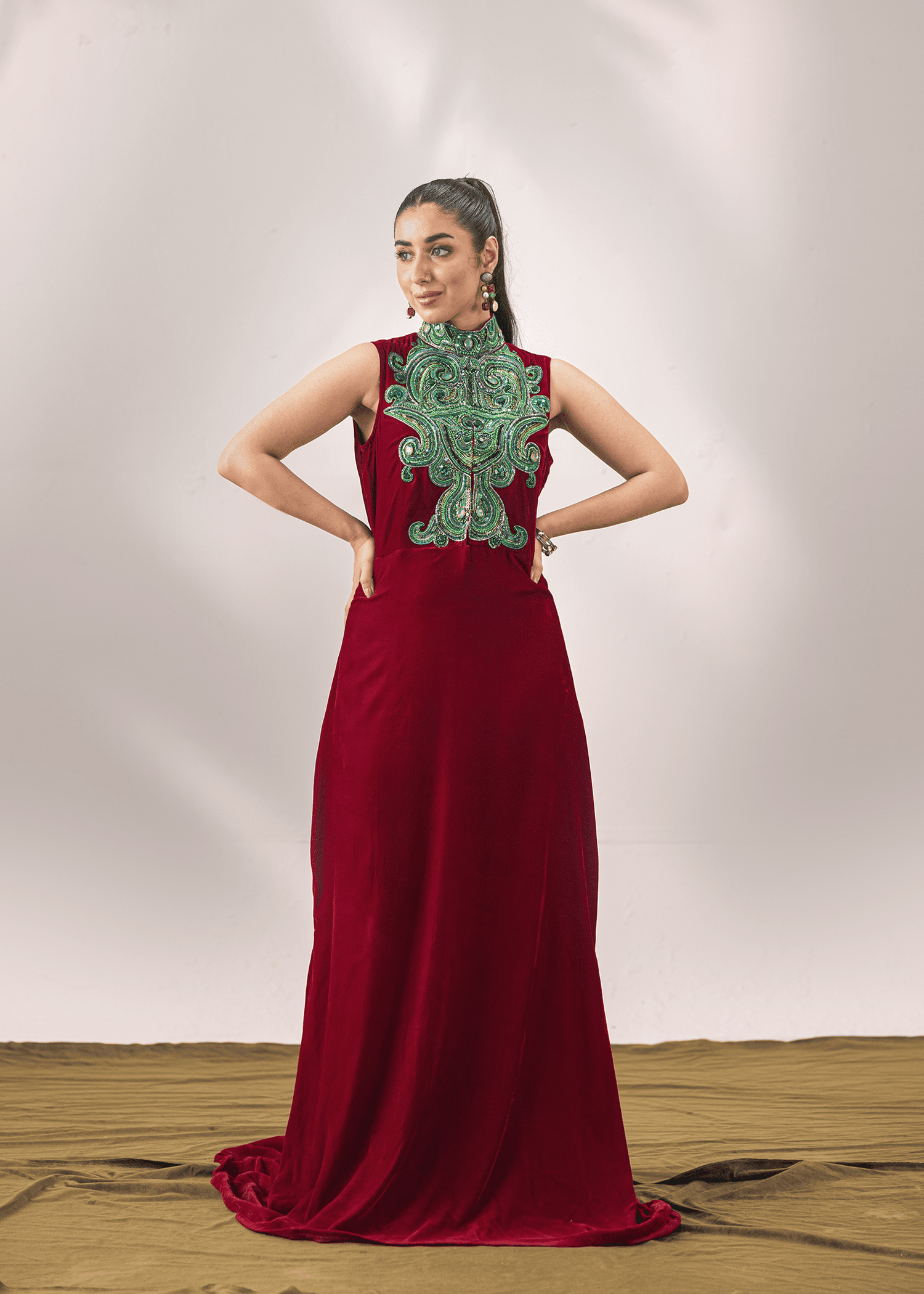 A one-piece gown in cherry red velvet, featuring a striking high-neck design with green. Embellished with stones, sequins, beads, katdana, and diamantés, it radiates opulence and bold elegance.
