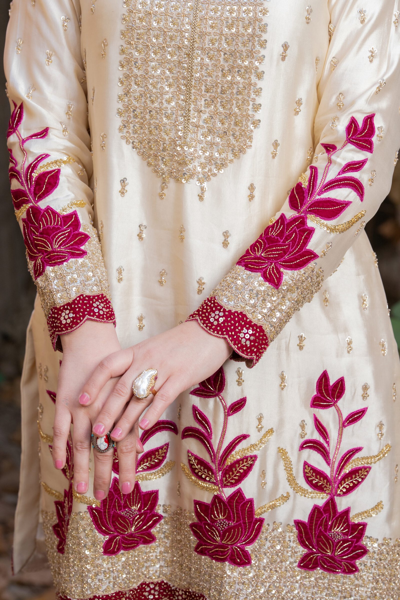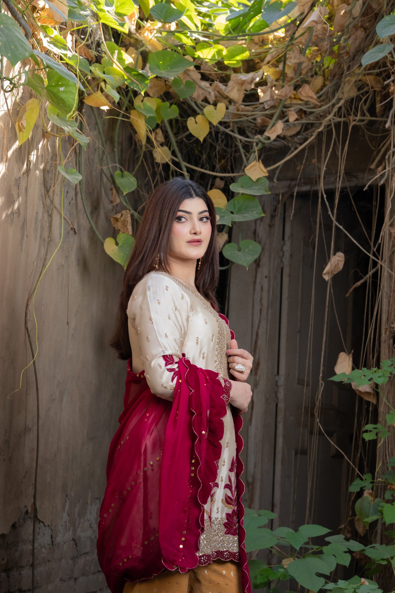 This three-piece ensemble blends sheesha silk, muqesh chiffon, and jacquard for a rich, textured look in beige, shocking pink, and mustard. The shirt features detailed velvet applique paired with fine embroidery, highlighted with dabka, sequins, stones, and katdana for added depth and sparkle. The mustard trousers carry matching embroidered motifs, while the shocking pink dupatta completes the outfit with a striking contrast.