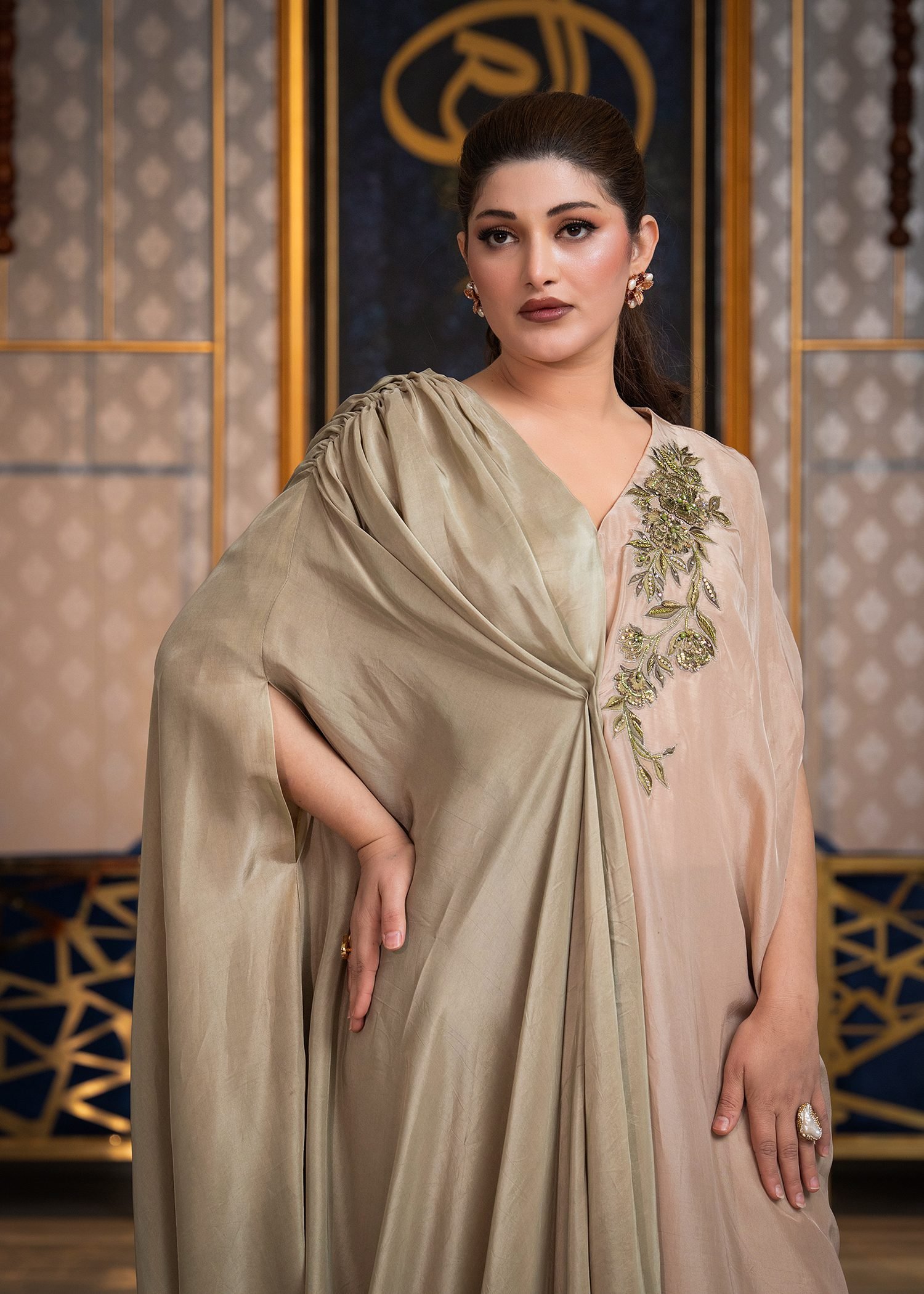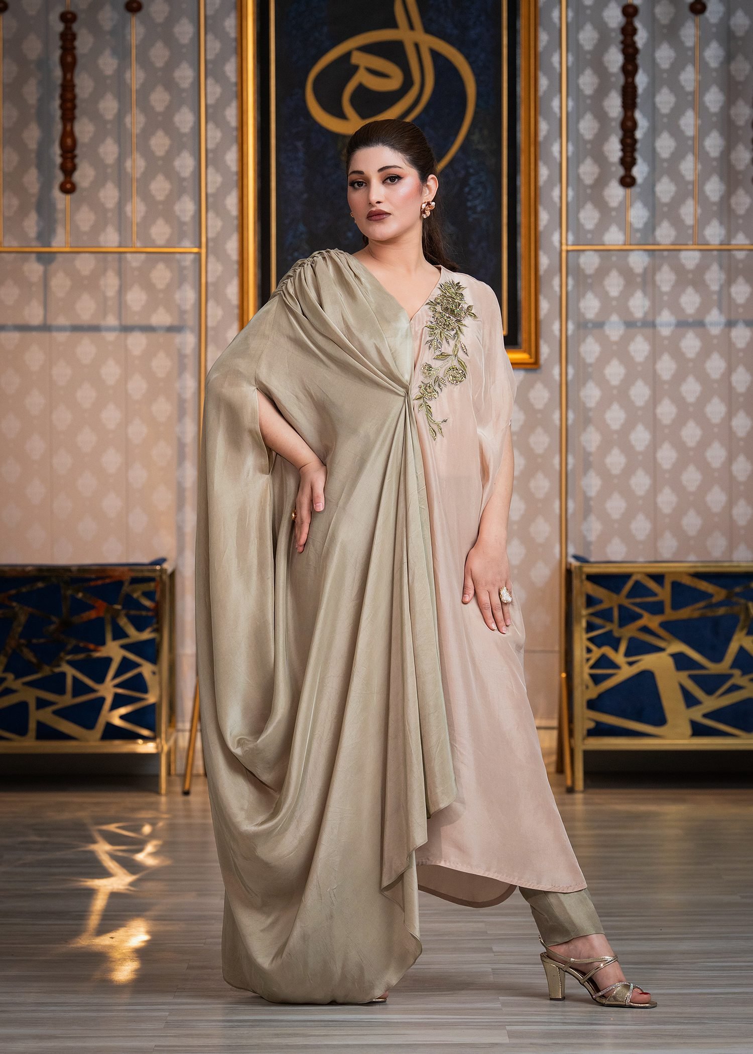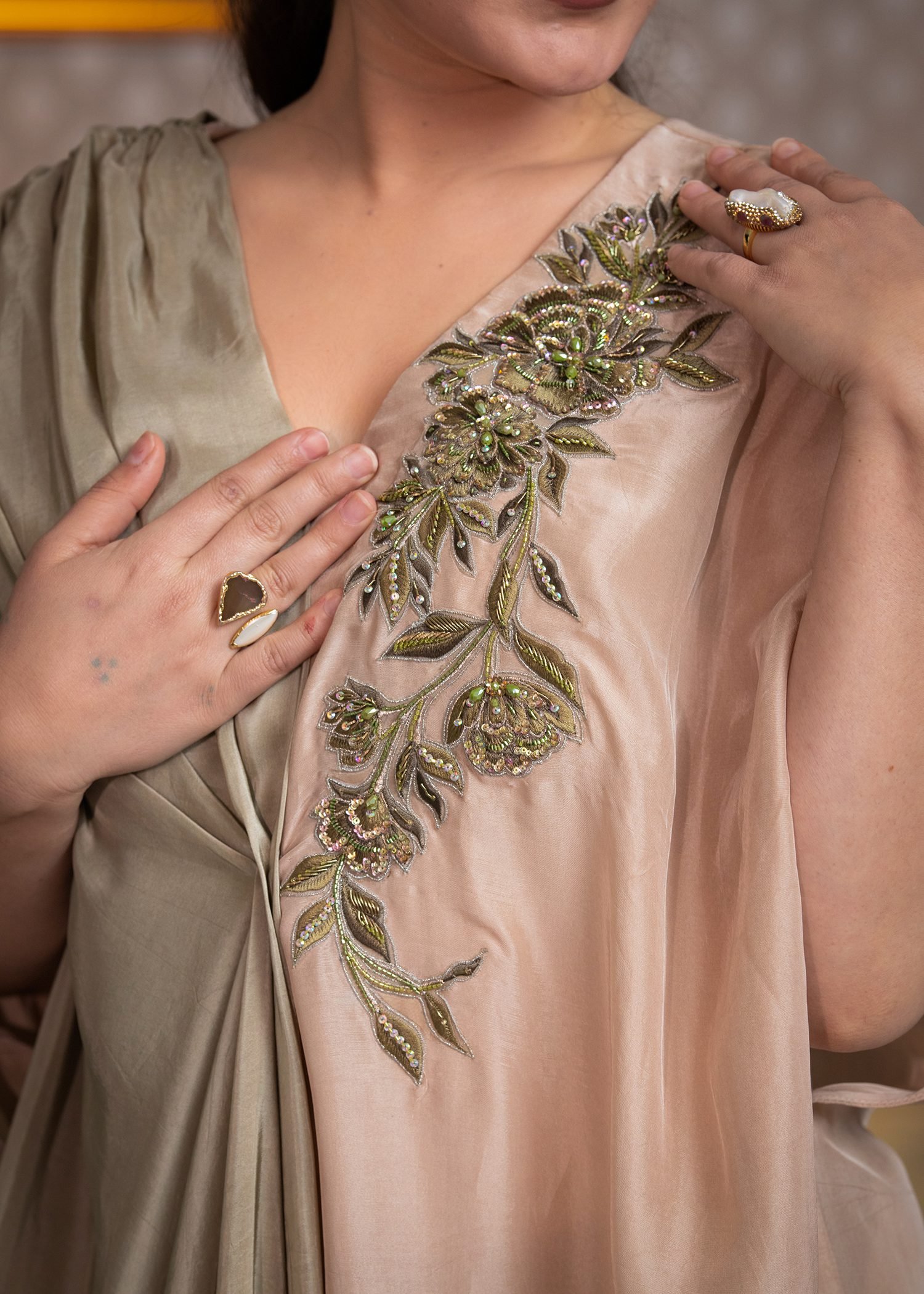 Rendered in a balanced pairing of Khaki Green and Golden Brown, this ensemble is crafted from smooth Tassels silk with a fluid, sculpted drape. Precision machine embroidery enhances the neckline and borders, while hand embellishment with cutdana, sequins, and Swarovski crystals introduces controlled luminosity.