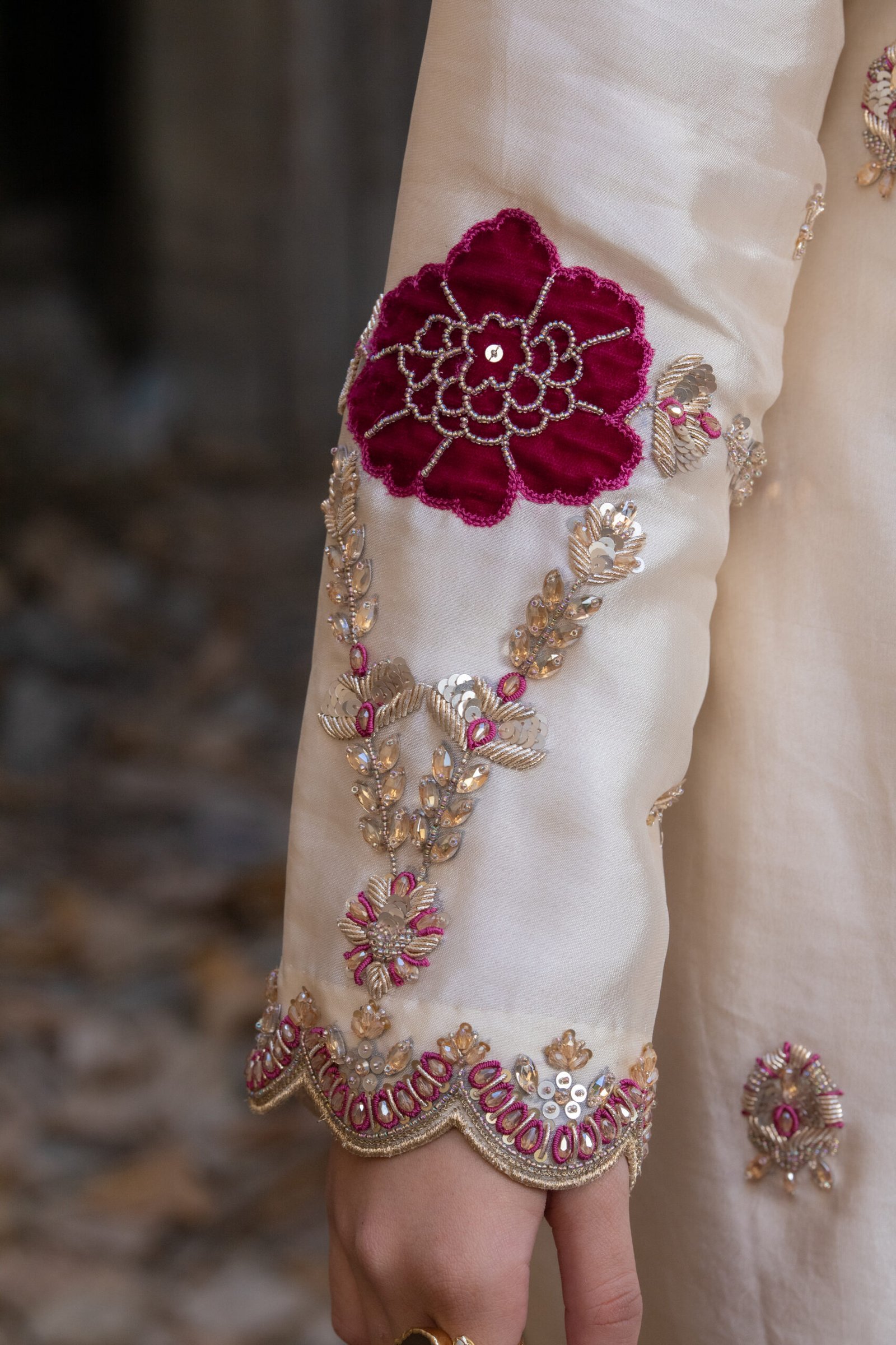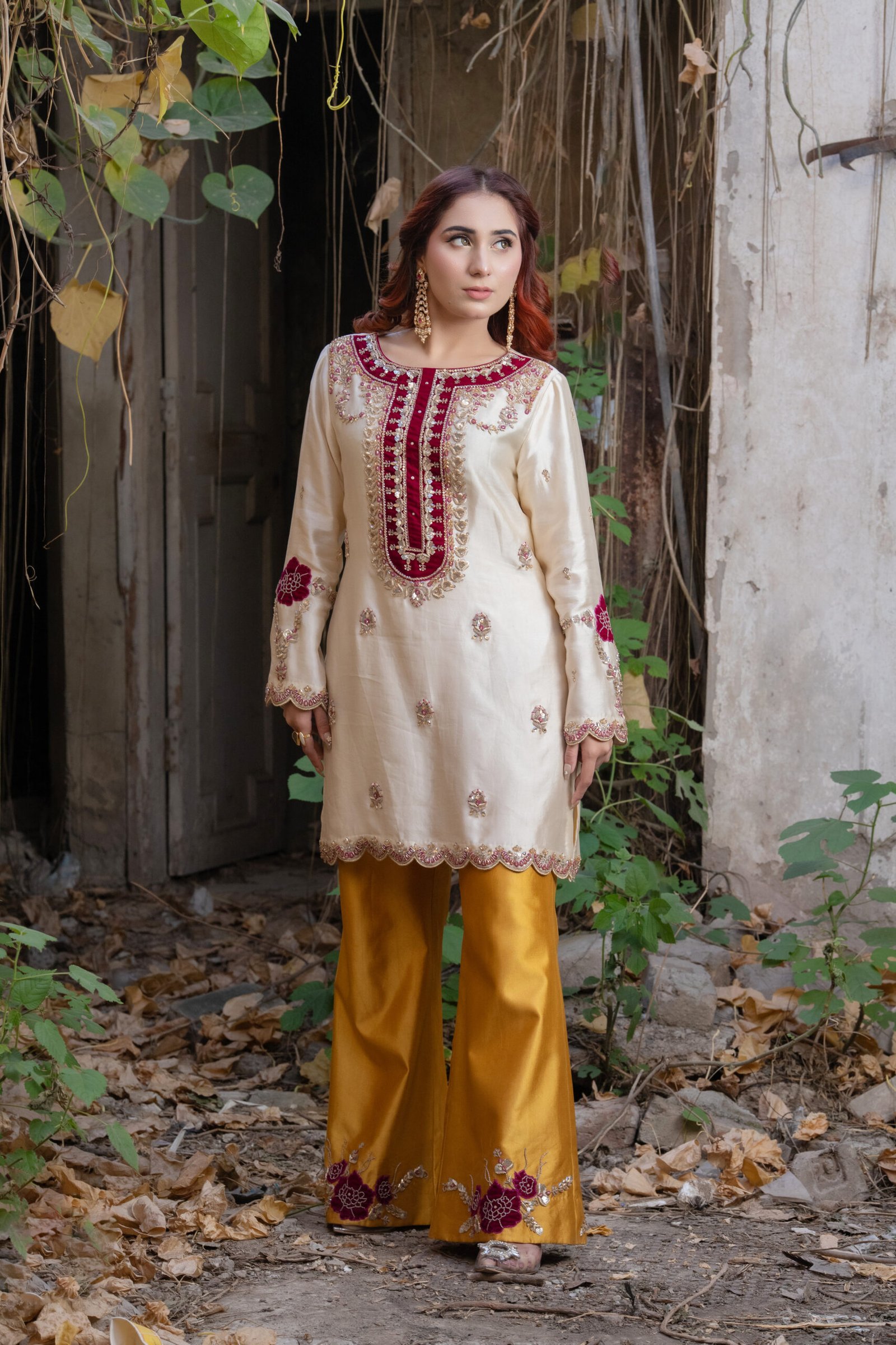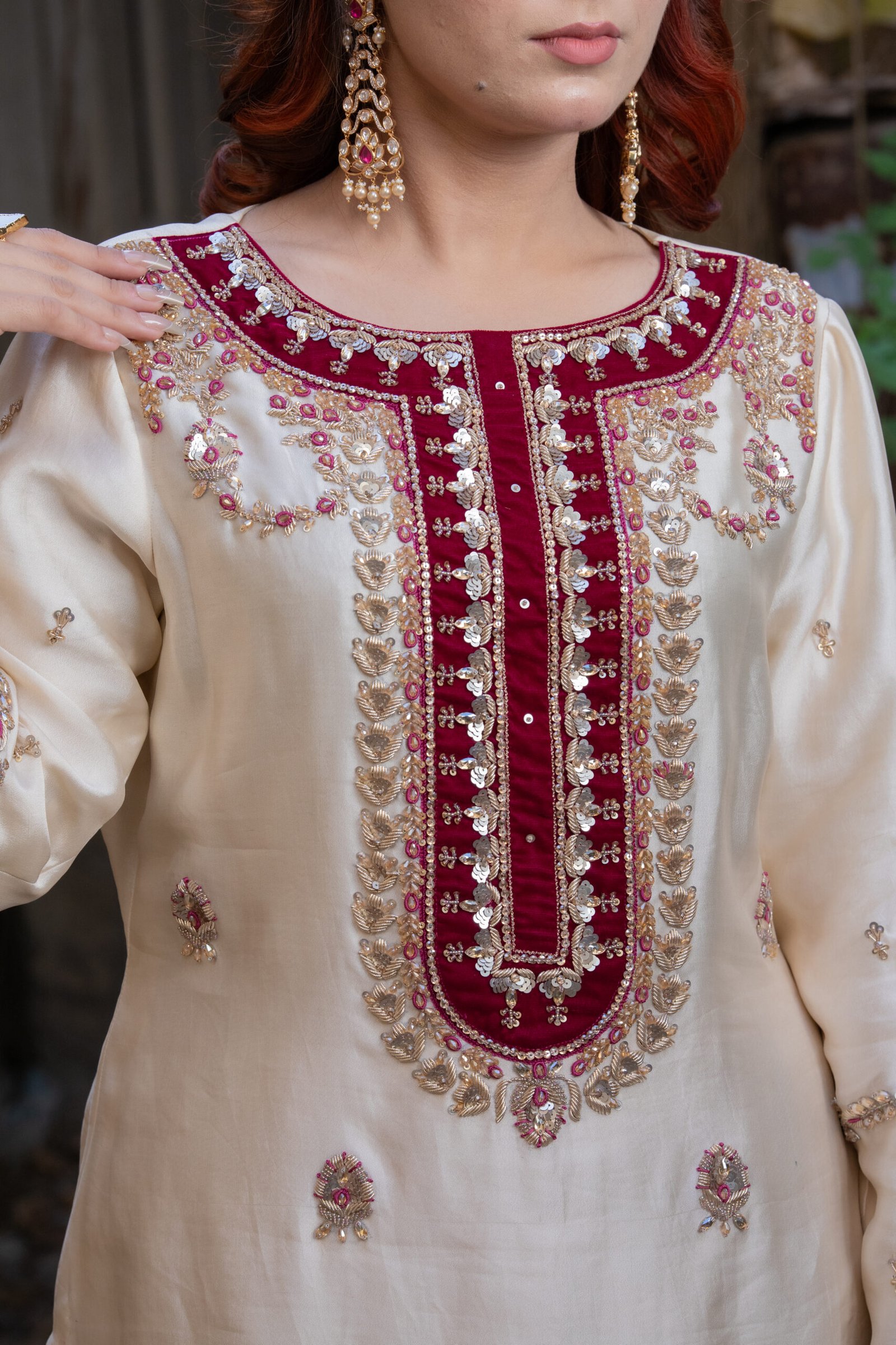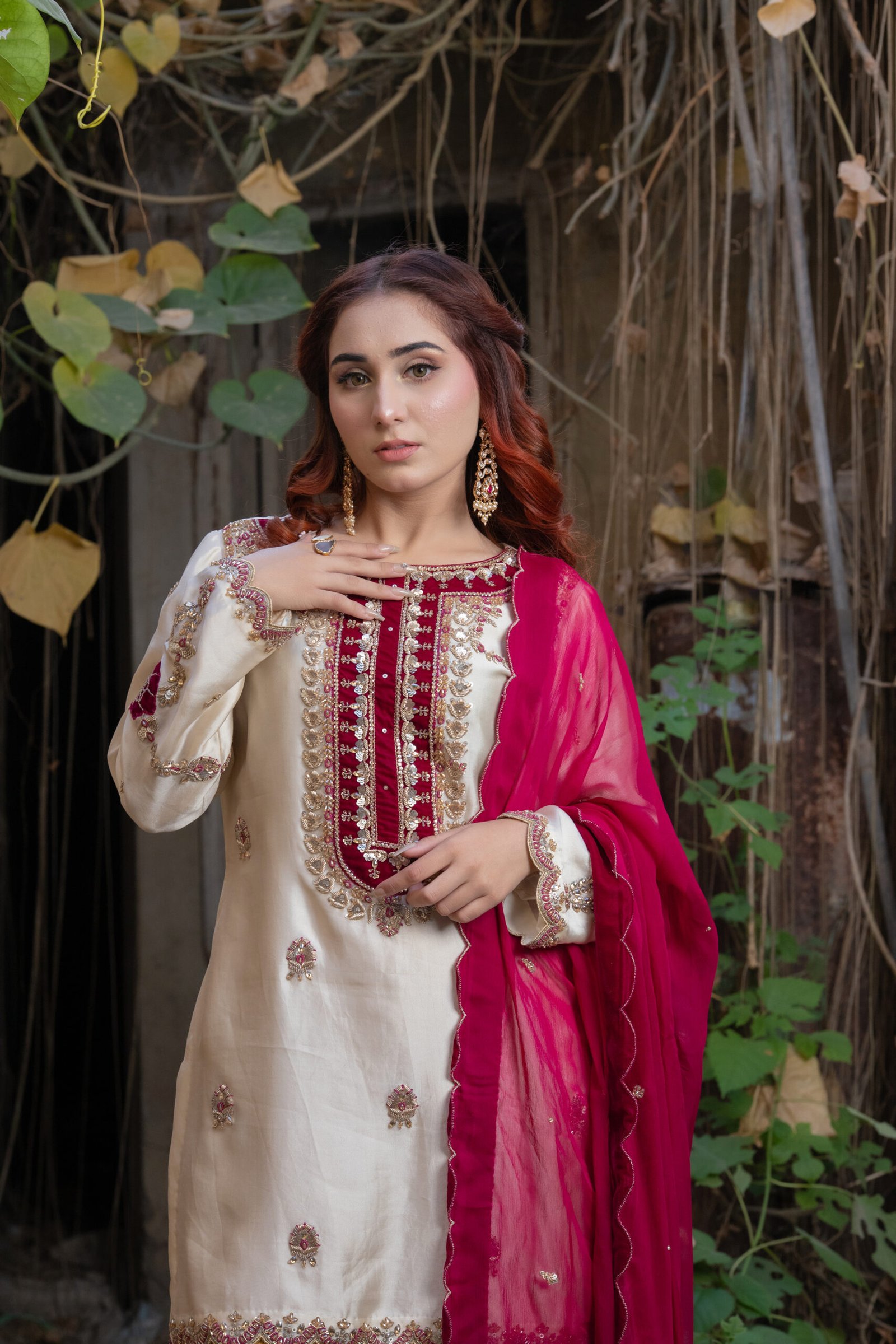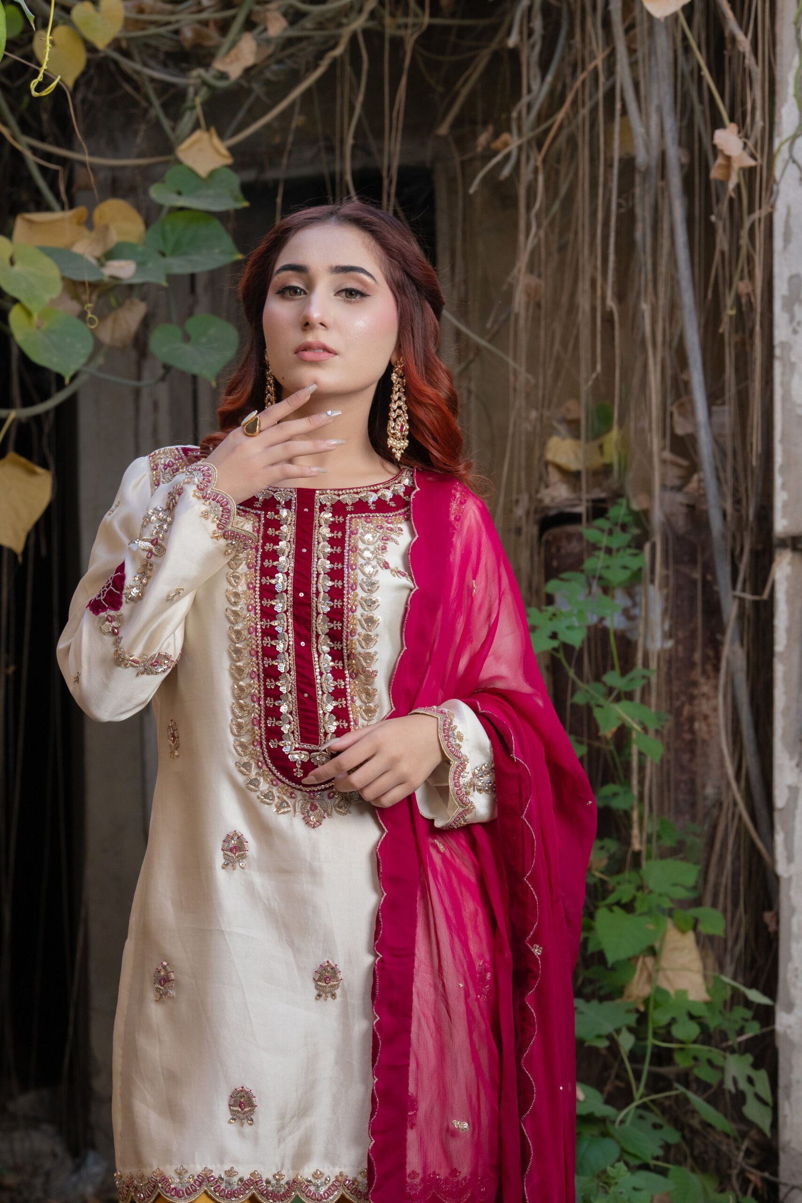 This three-piece ensemble comes in a refined blend of beige, shocking pink, and mustard, giving it a vibrant yet elegant appeal. The shirt features detailed sequin, dabka, resham thread, moti, and crystal work, finished with touches of zardozi for added richness and texture. The contrasting mustard trousers carry coordinated embellishments, while the shocking pink dupatta adds a bold, festive accent.