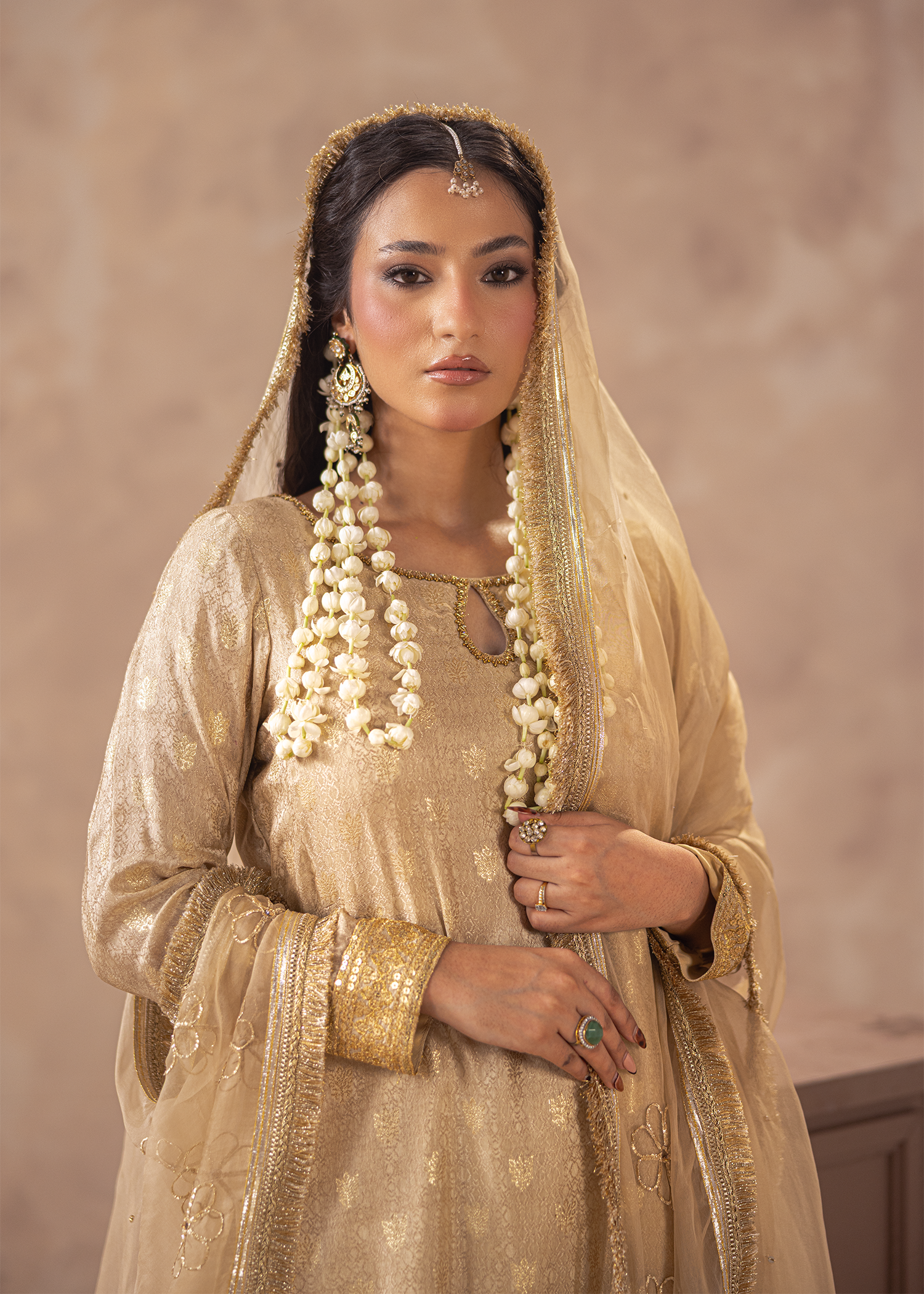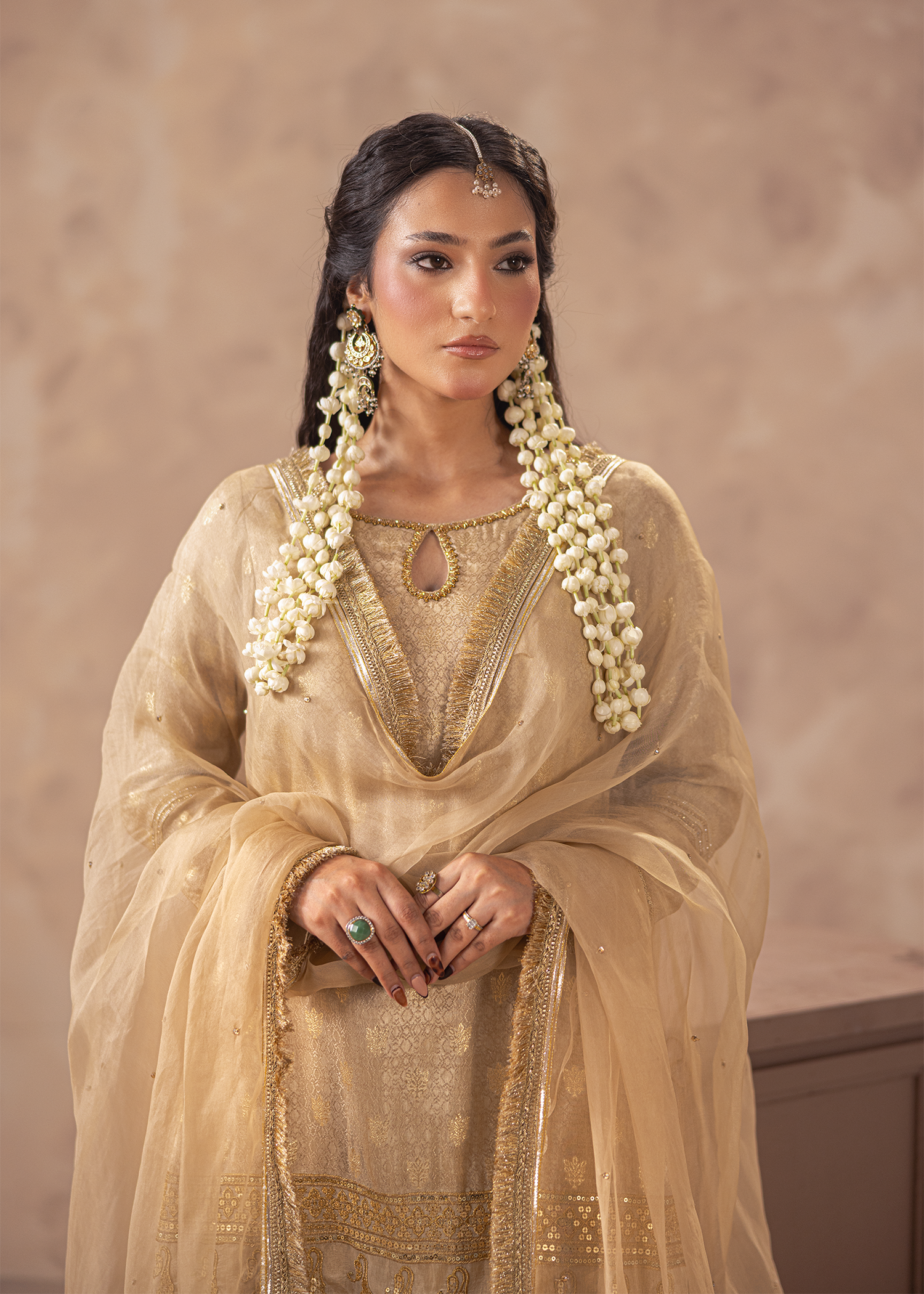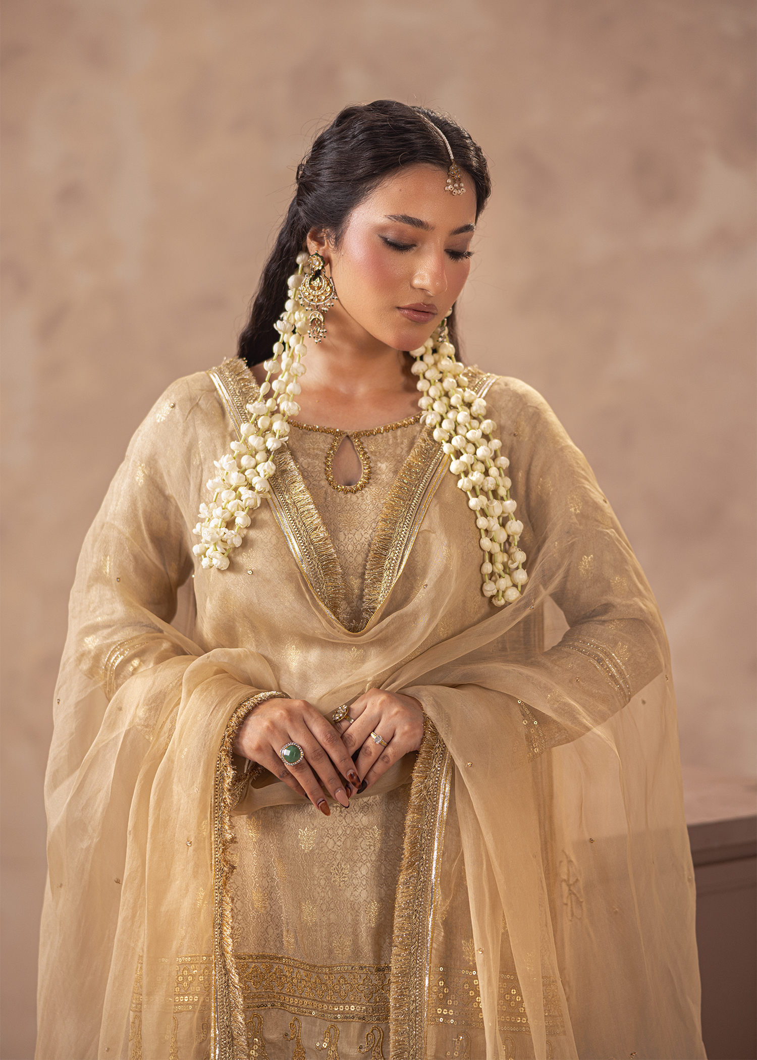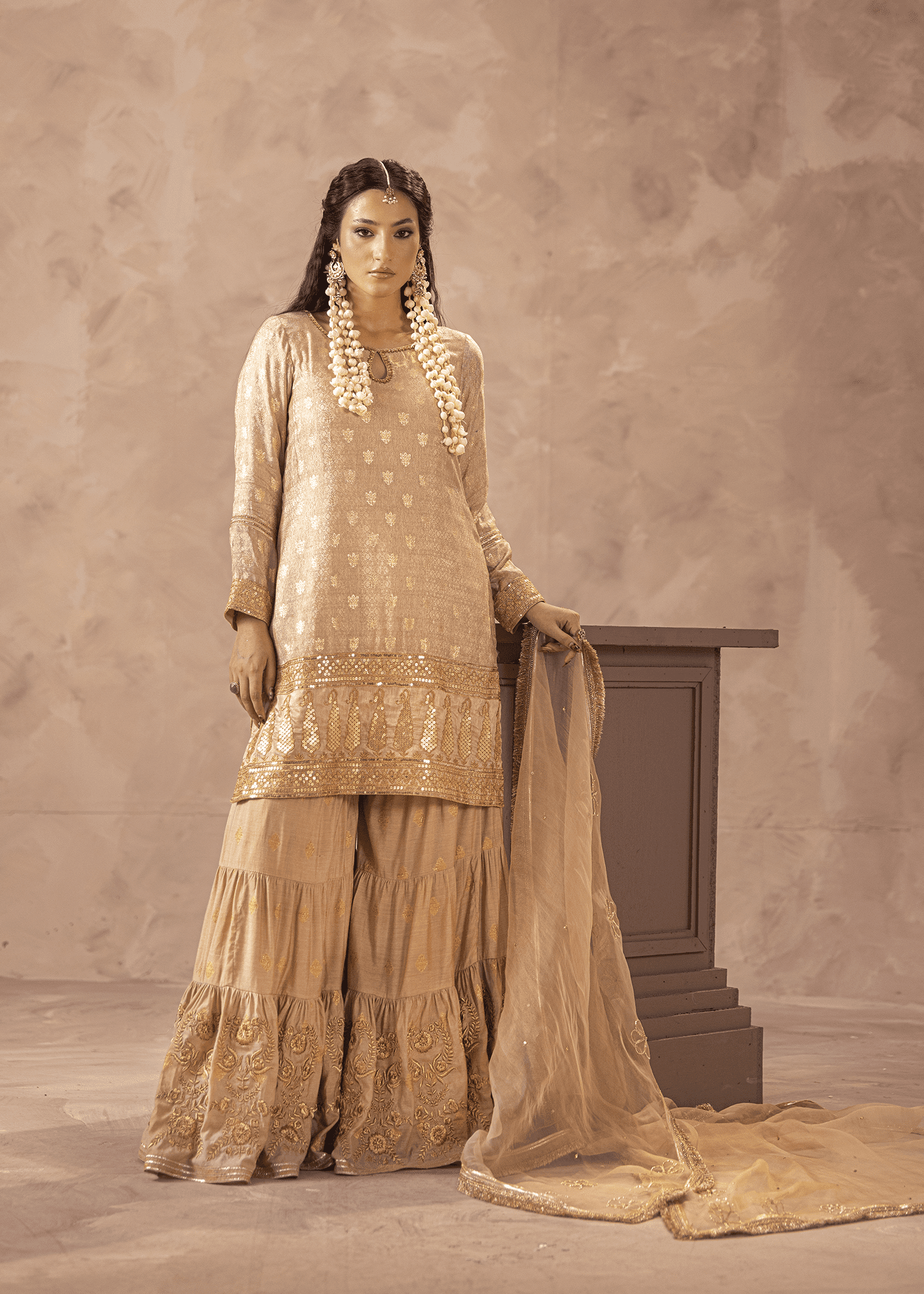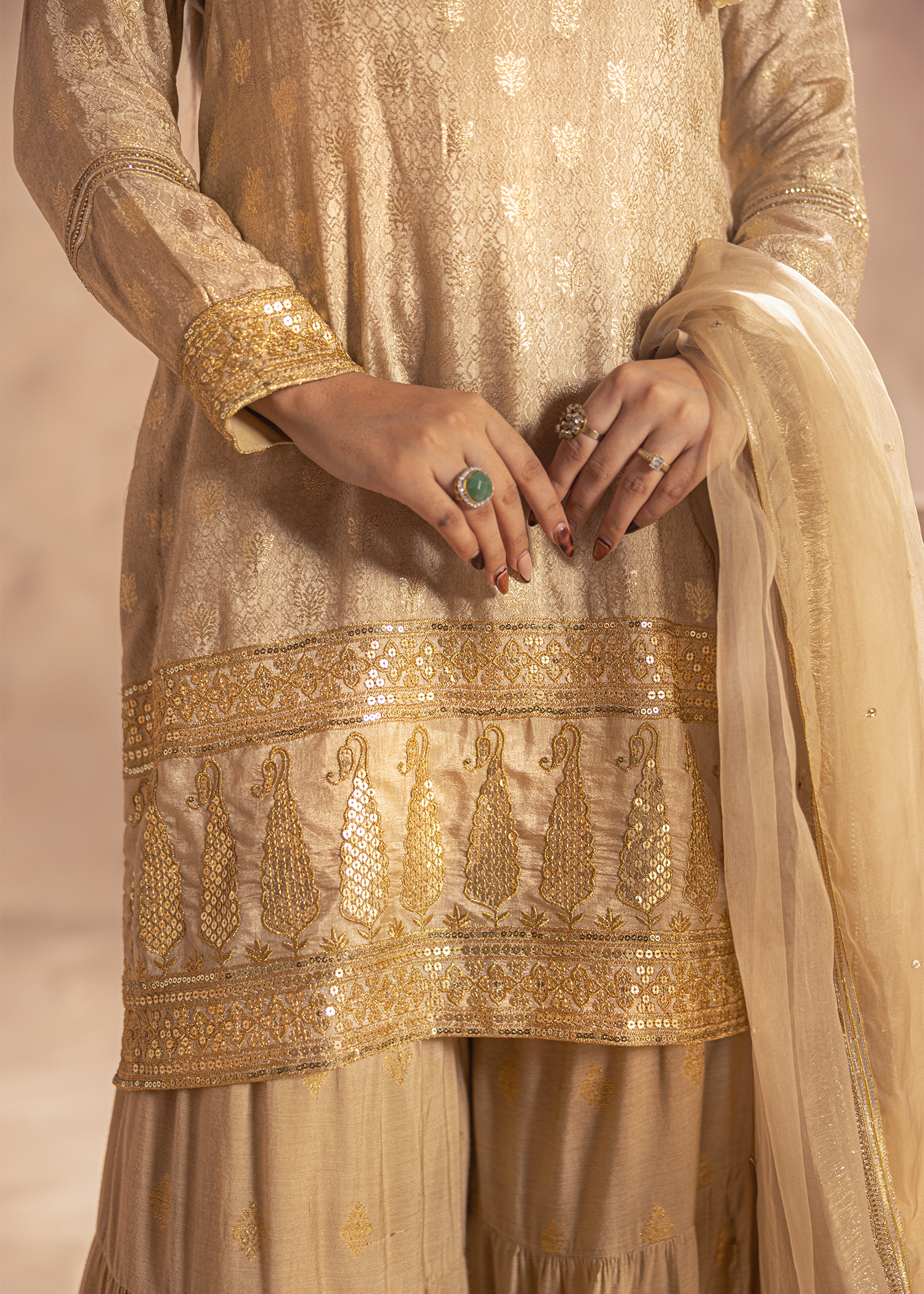 A three-piece set in beige jacquard and dobby banaras, featuring machine embroidery highlighted with sequins and Swarovski embellishments. The flowing dupatta and tiered hemline add an aura of festive sophistication.