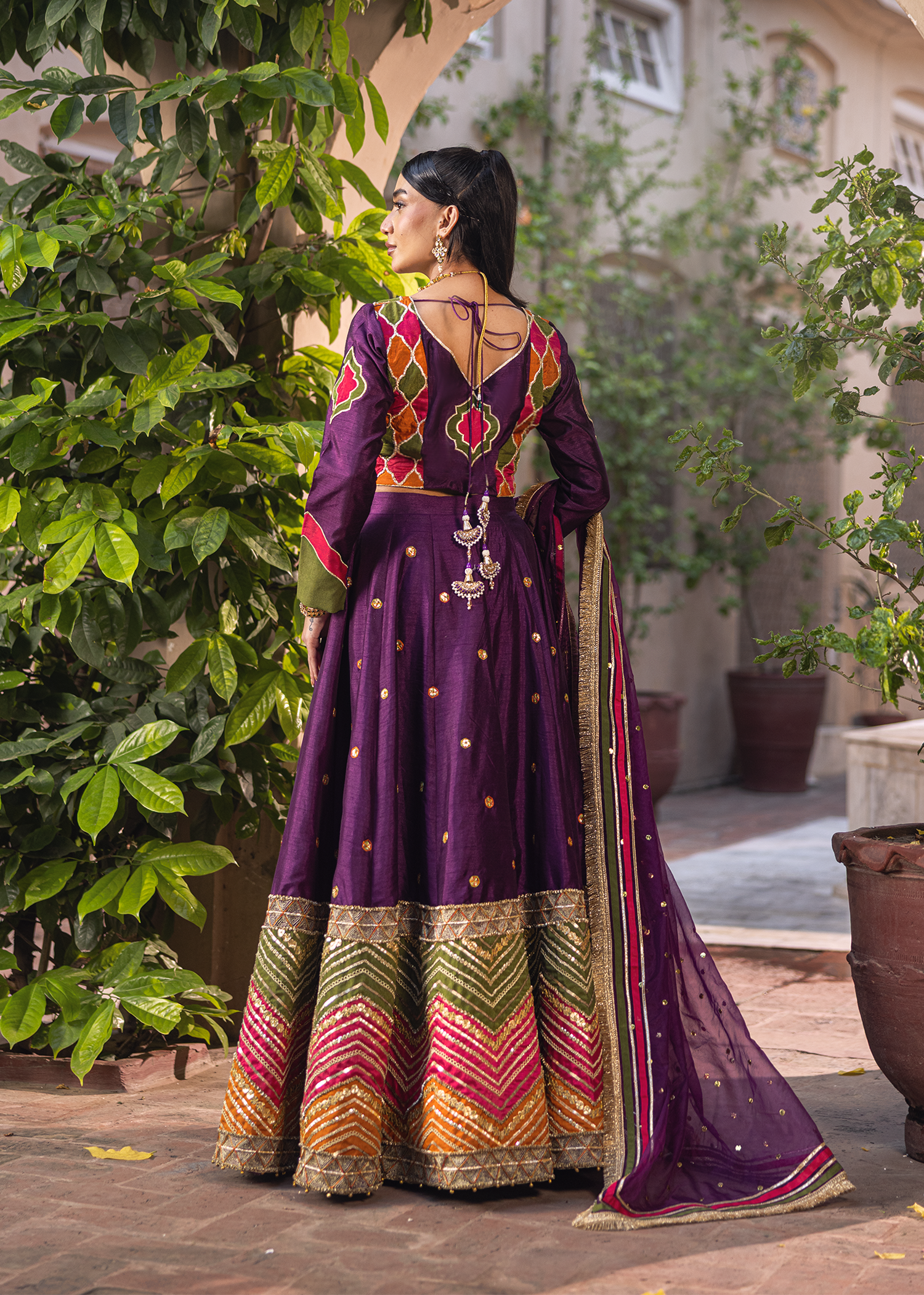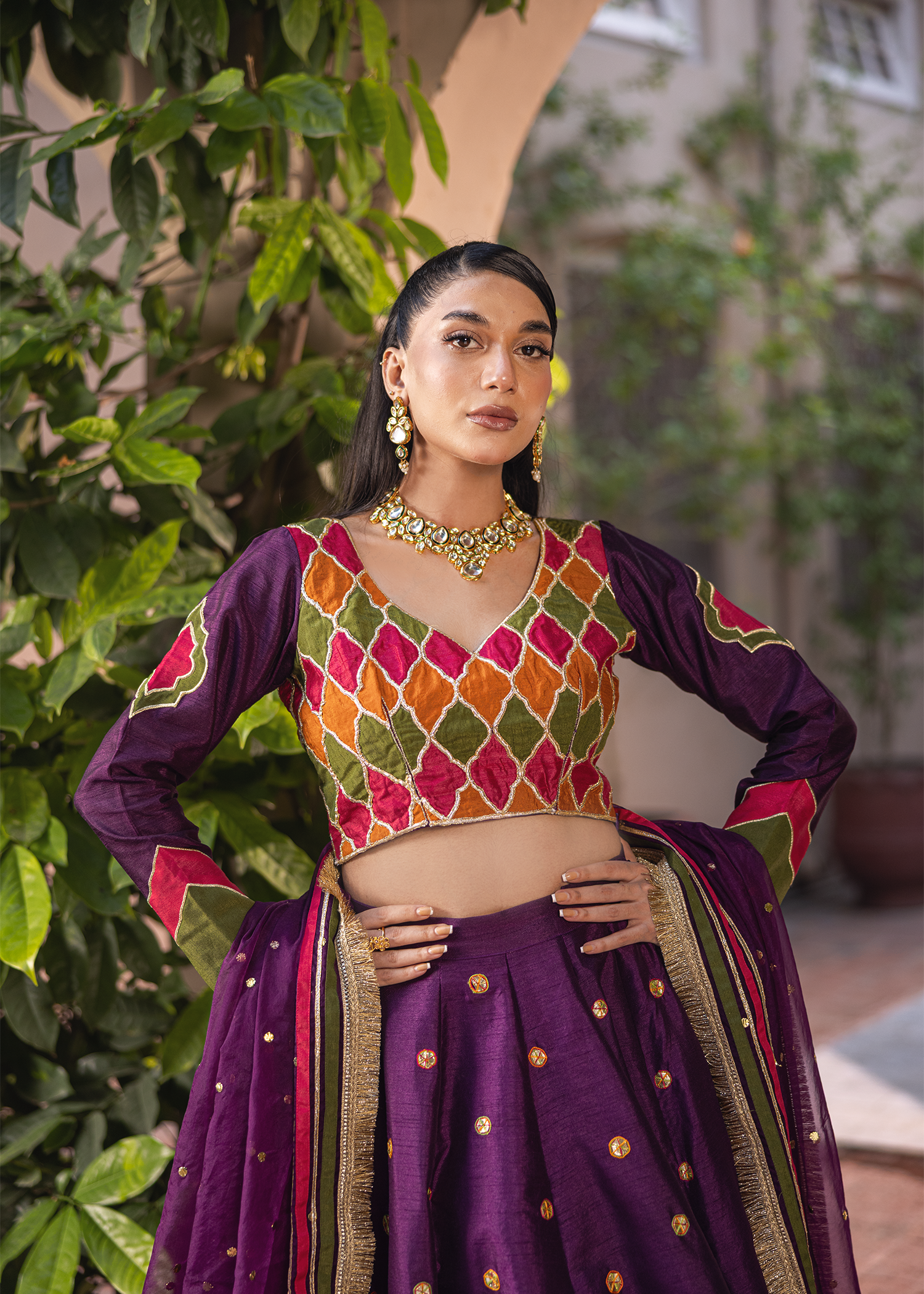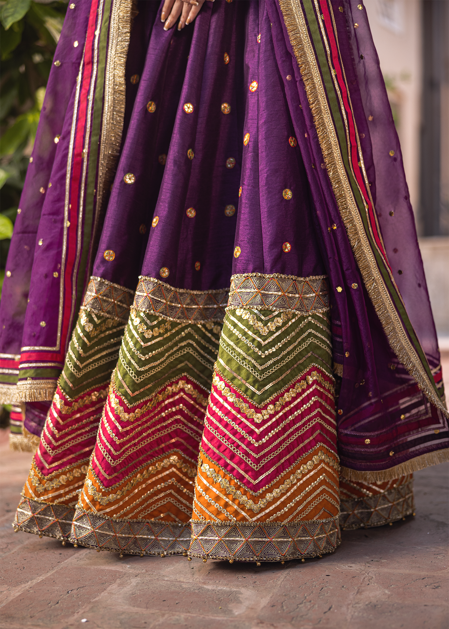 A regal three-piece ensemble in rich purple raw silk, featuring a vibrant blouse with intricate applique patchwork fused with gota, dori, and delicate bell accents. The flowing lehenga is paired with a dupatta adorned in refined muqesh work, creating a perfect harmony of tradition and modern elegance.