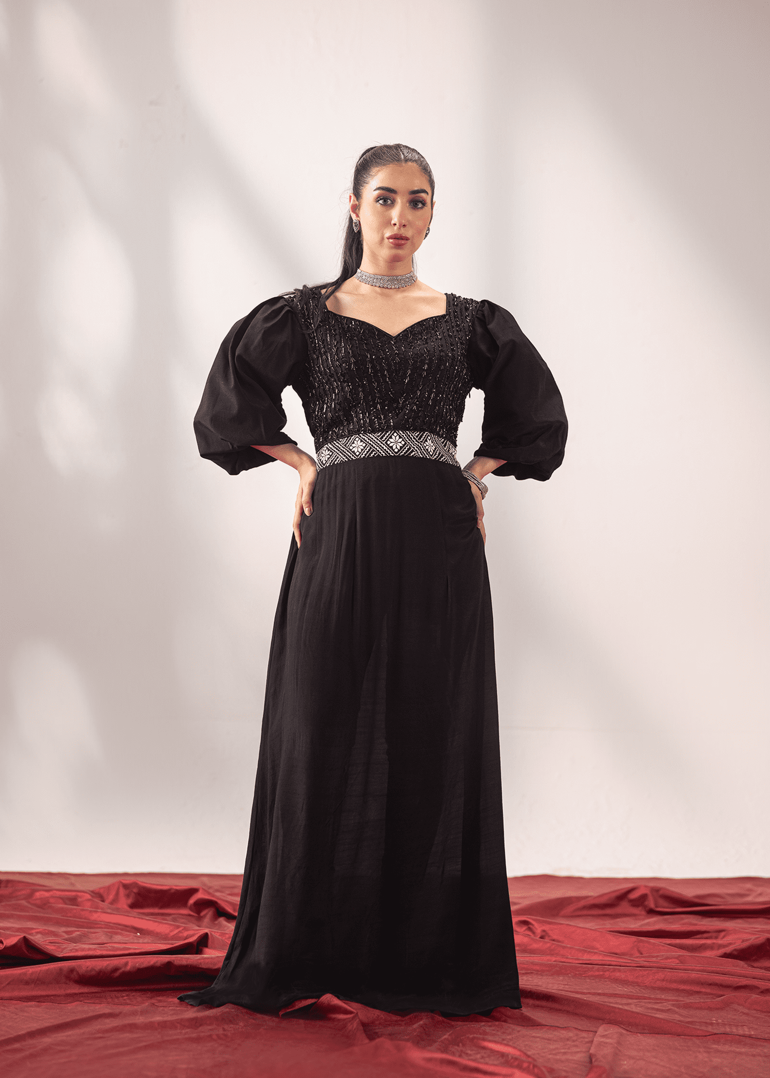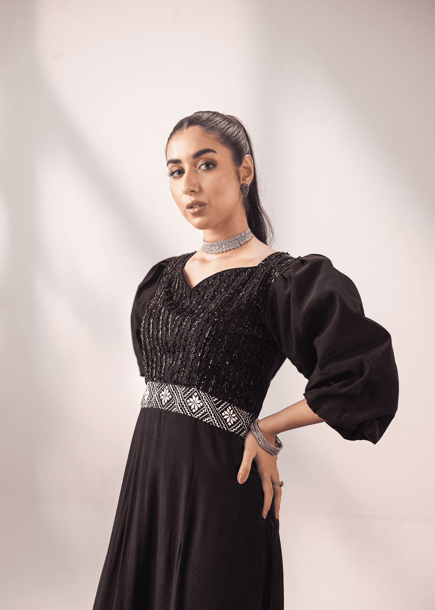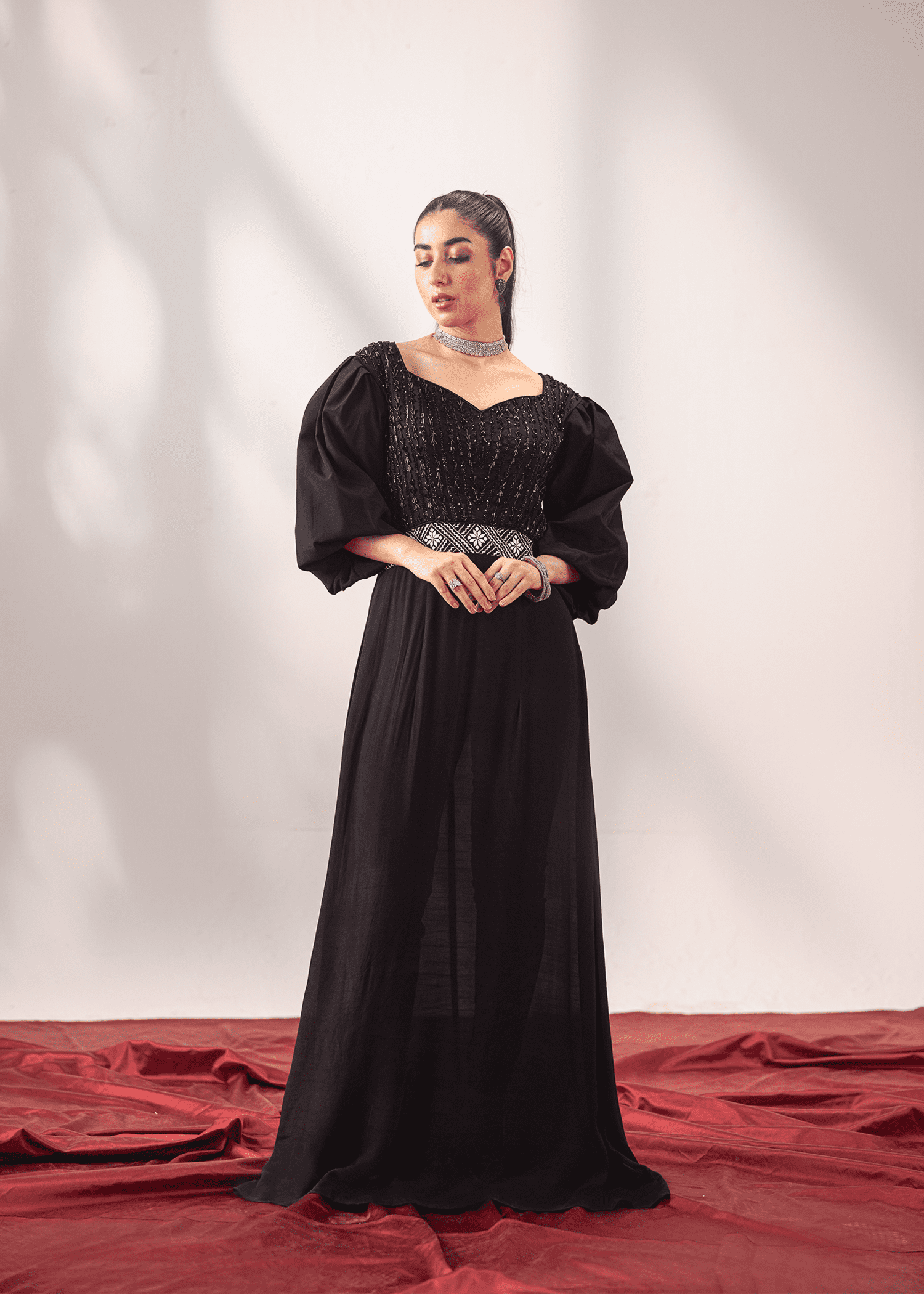 One-piece gown in classic black Korean silk, exquisitely detailed with machine embroidery and further elevated by hand embellishments of beads, crystals, and sequins. The structured bodice and voluminous sleeves lend a regal elegance, making it a timeless statement for evening sophistication.