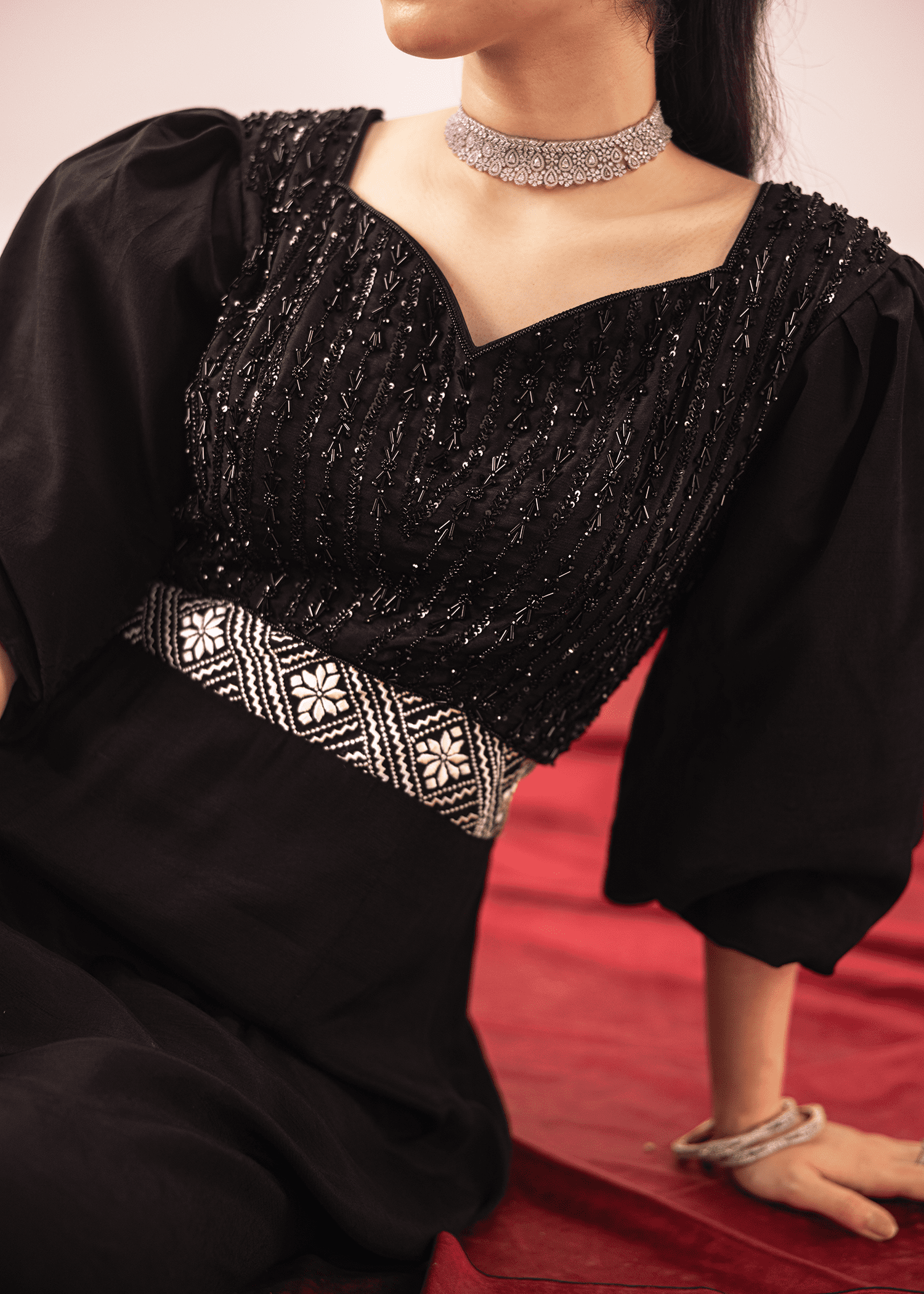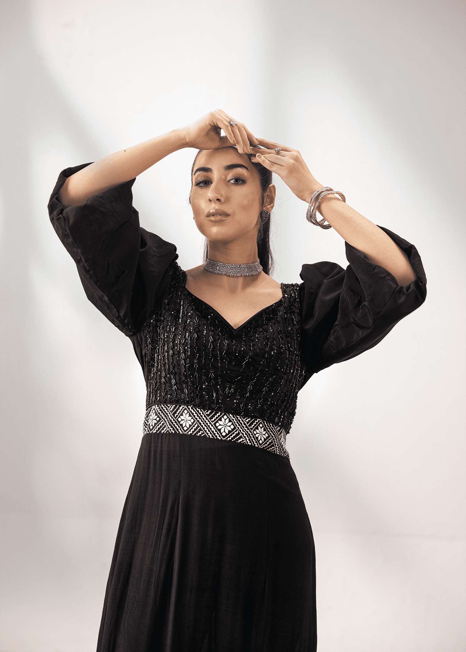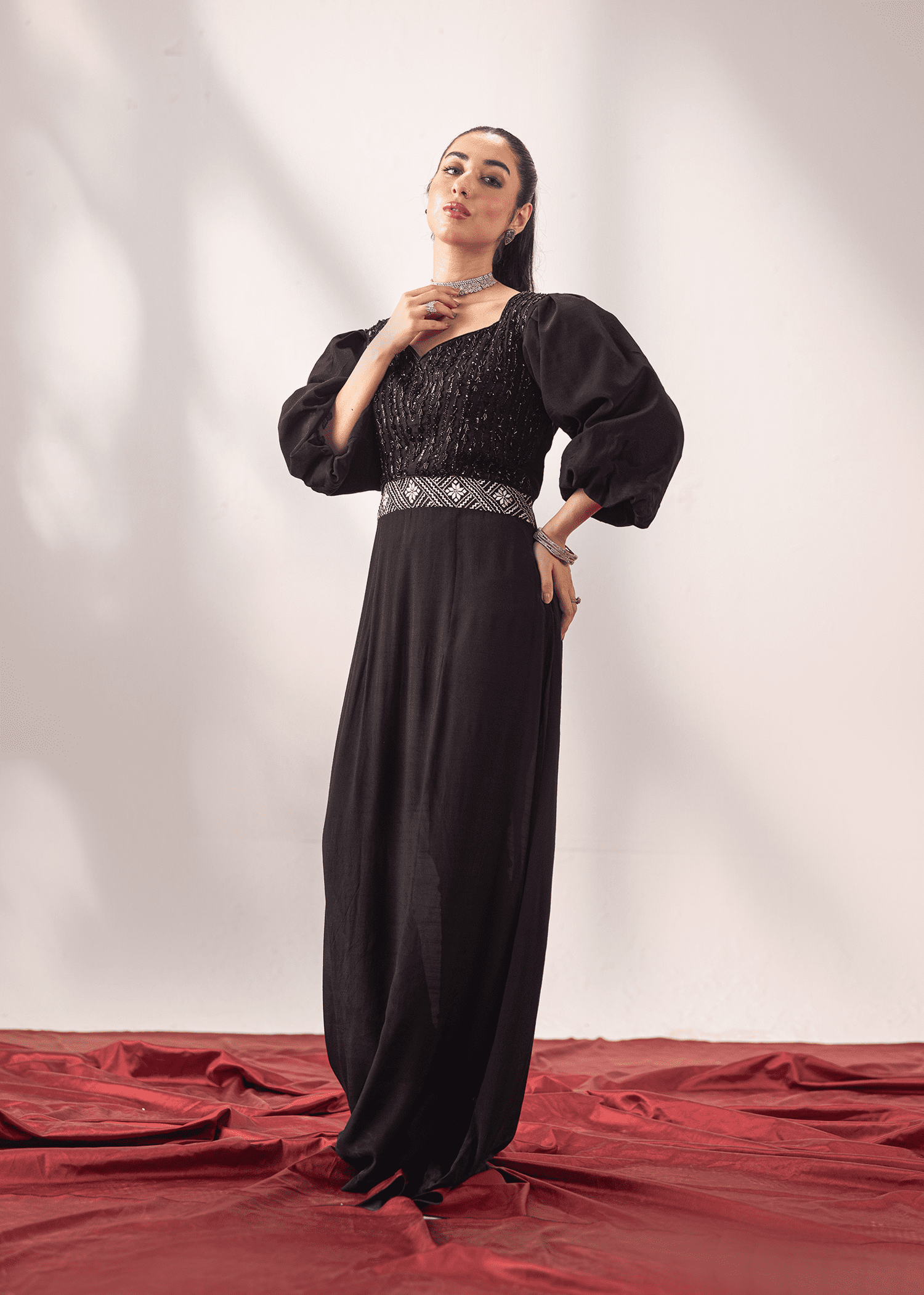 One-piece gown in classic black Korean silk, exquisitely detailed with machine embroidery and further elevated by hand embellishments of beads, crystals, and sequins. The structured bodice and voluminous sleeves lend a regal elegance, making it a timeless statement for evening sophistication.