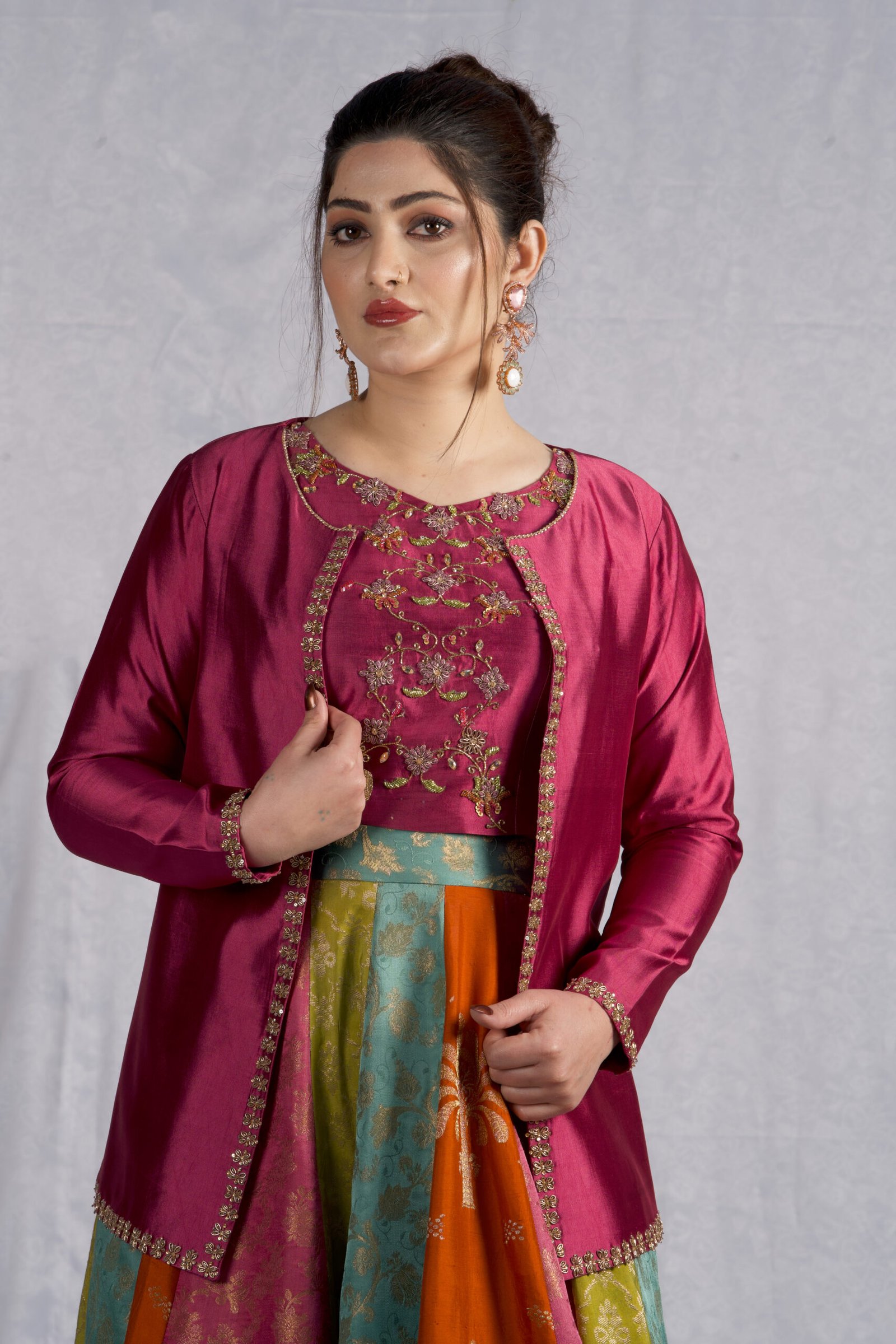 This four-piece ensemble blends sheesha silk and banaras, creating a rich, multi-textured look in shades of purple, rust, sea green, and parrot green. The jacket and bodice feature detailed applique work paired with delicate hand embellishment using dabka, stones, crystals, sequins, and katdana, giving the design a polished, festive finish.