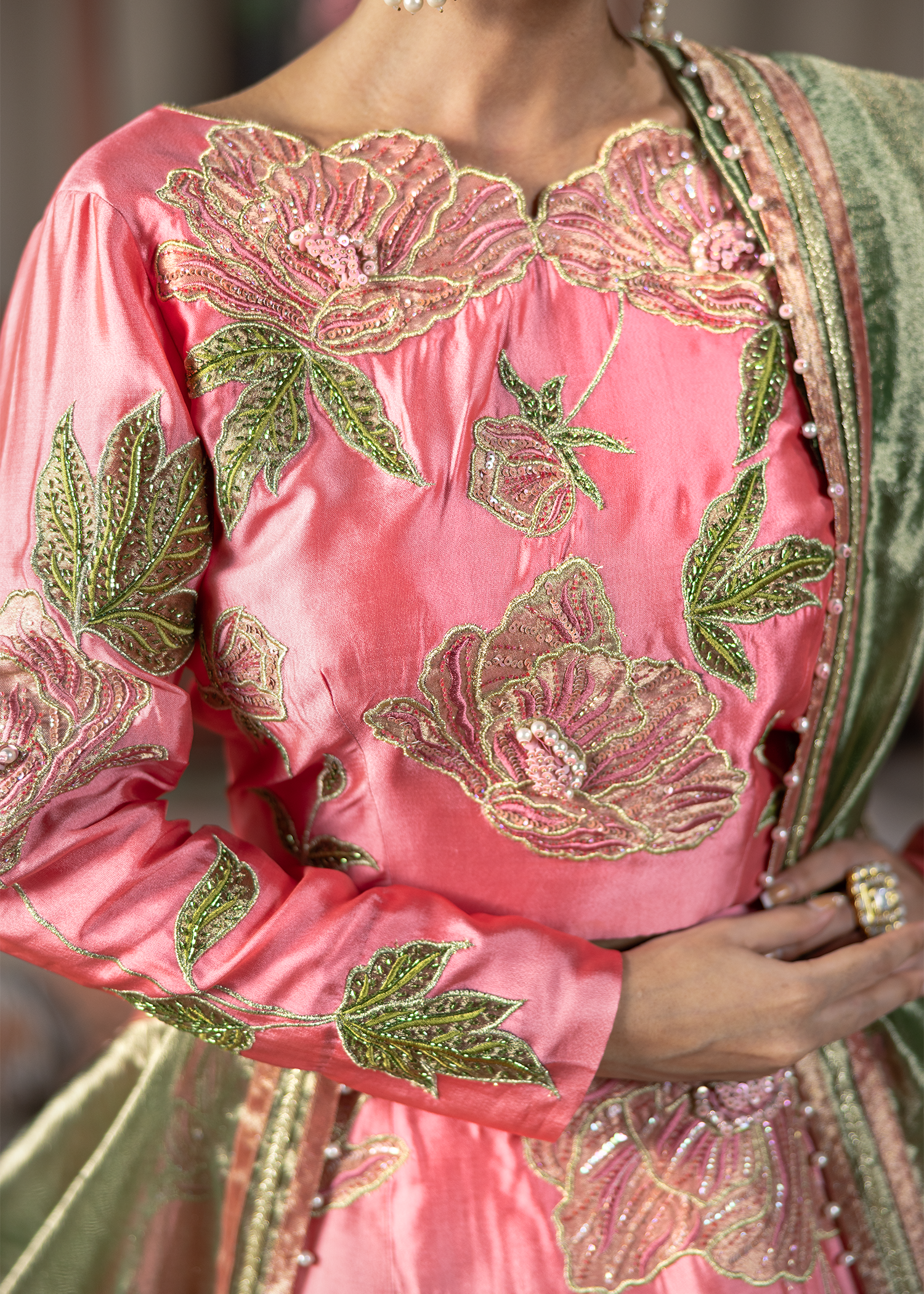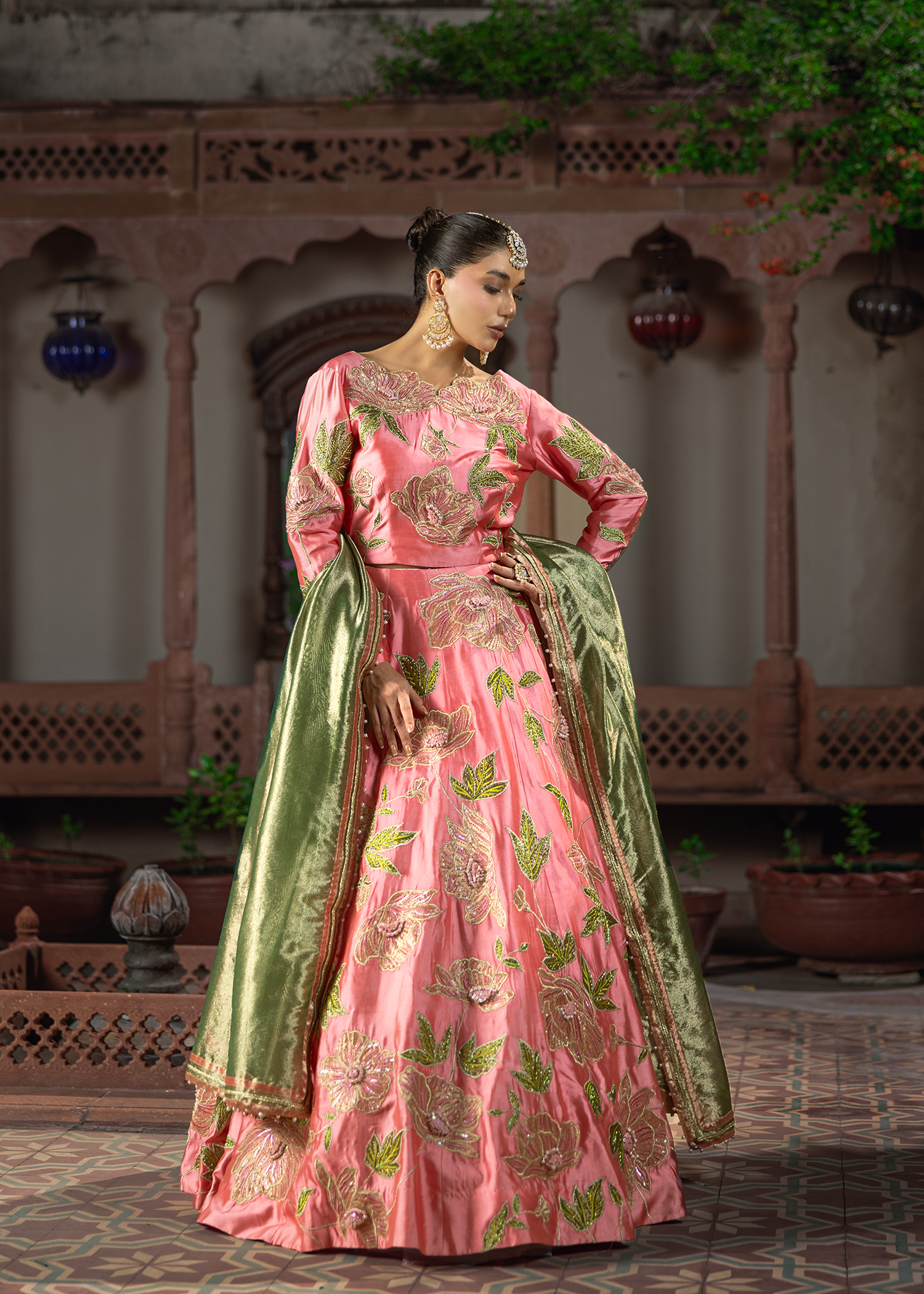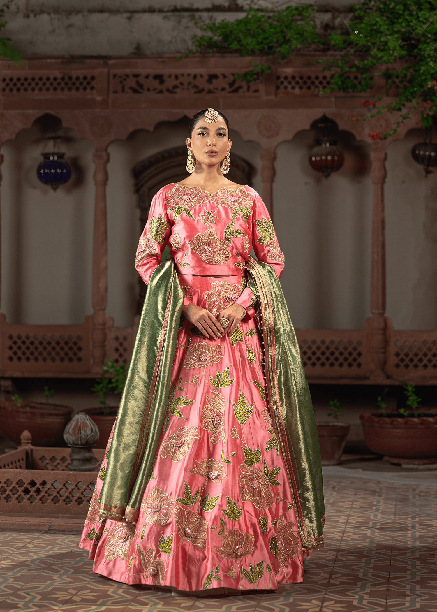 A three-piece set in punch pink and turtle green, crafted from sheesha silk and zari tissue. The lehenga and blouse are adorned with applique floral motifs, enriched with 3D embellishments of pearls, katdana, and sequins. Paired with a contrasting dupatta, the design reflects refined craftsmanship with a contemporary luxury appeal.