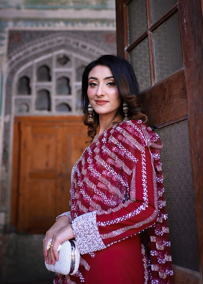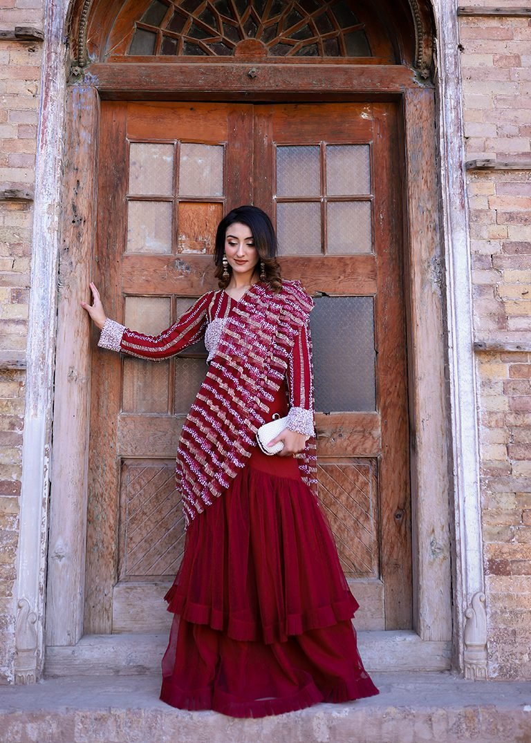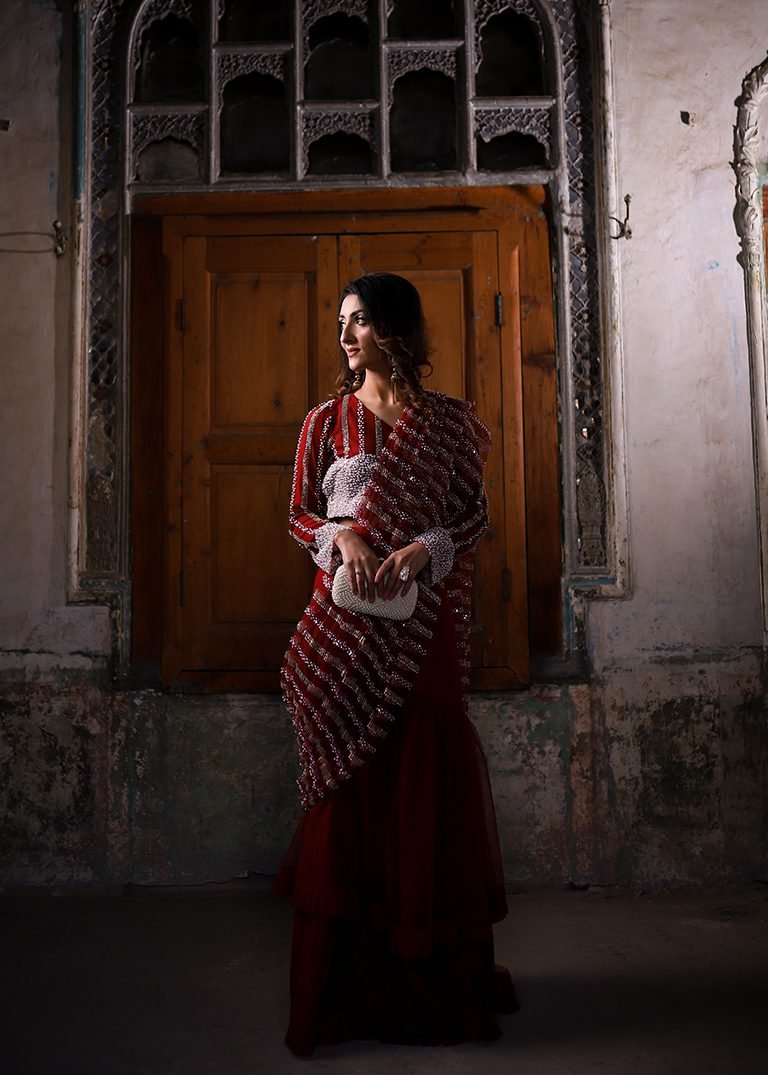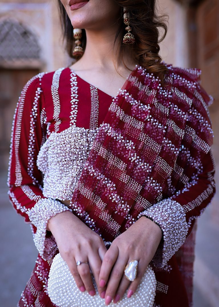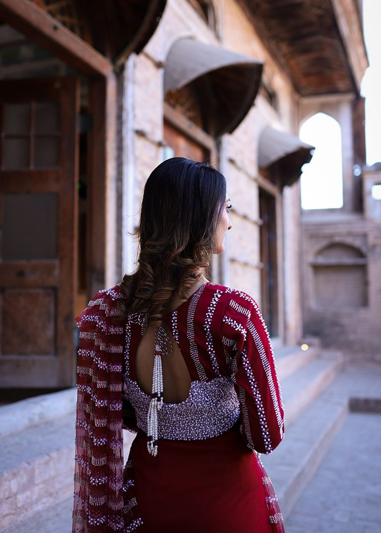 A maroon one-piece outfit made from cut dana net, plain net, and Korean silk, offering depth, movement, and refined structure. Rich in tone and timeless in appeal.