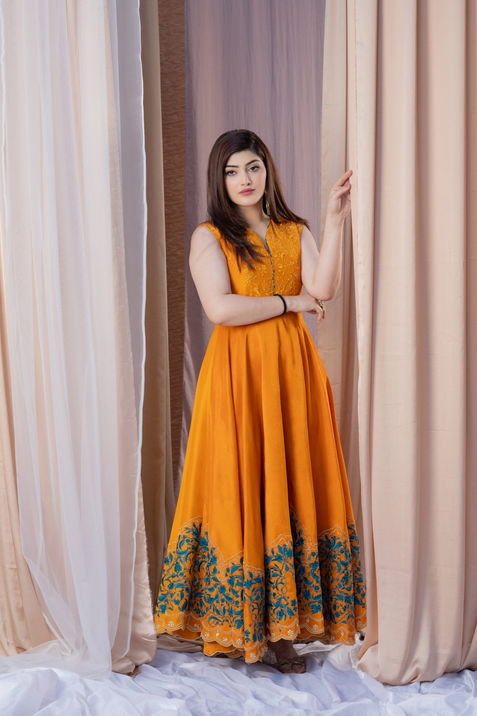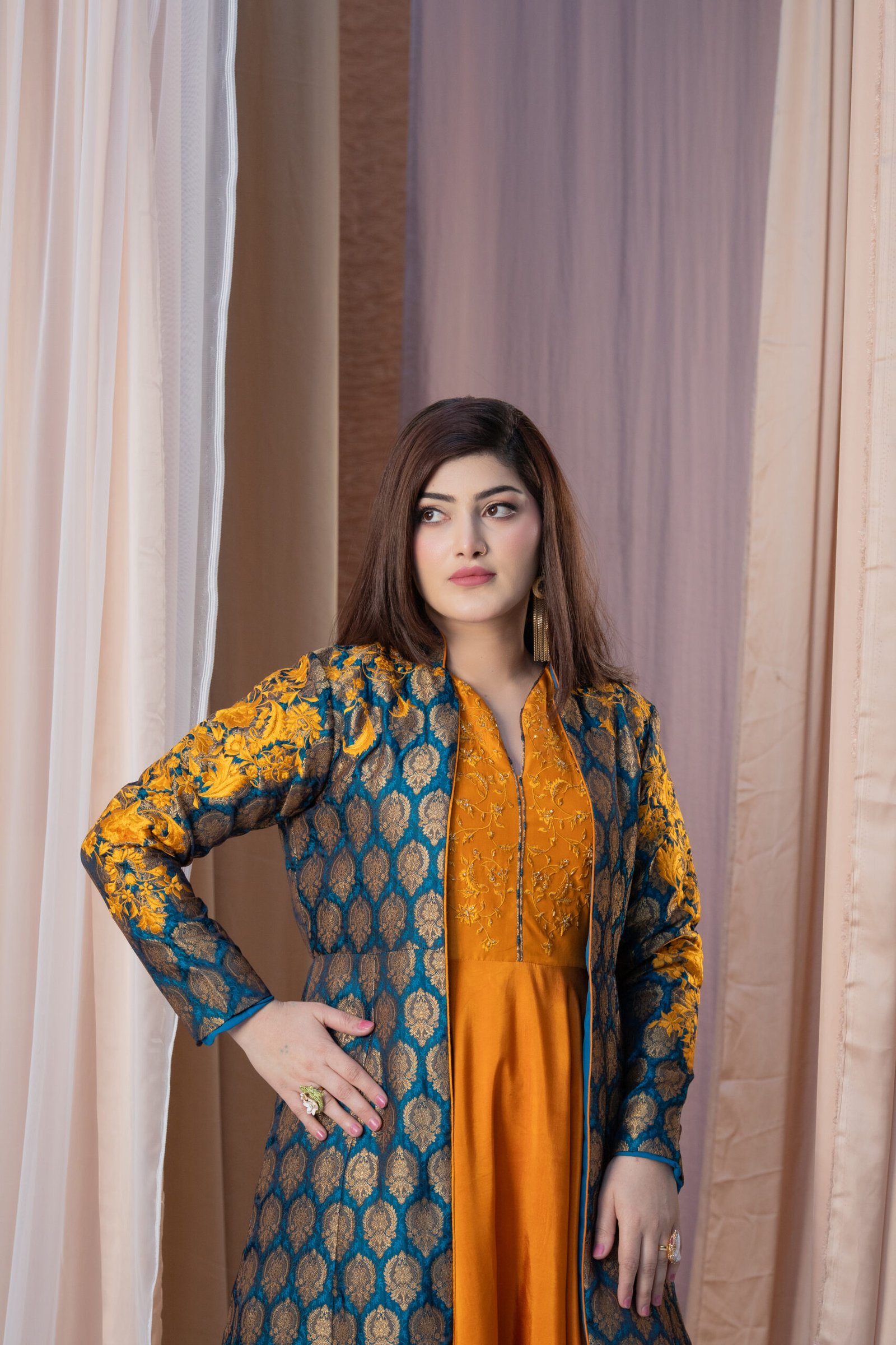 This two-piece ensemble blends tassel silk with rich banaras, creating a striking combination of mustard and zinc tones. The long jacket features intricate machine embroidery enhanced with fine hand embroidery, detailed with katdana and stonework that adds depth and subtle shine. The inner mustard layer complements the banarasi pattern, giving the outfit a regal, structured silhouette.