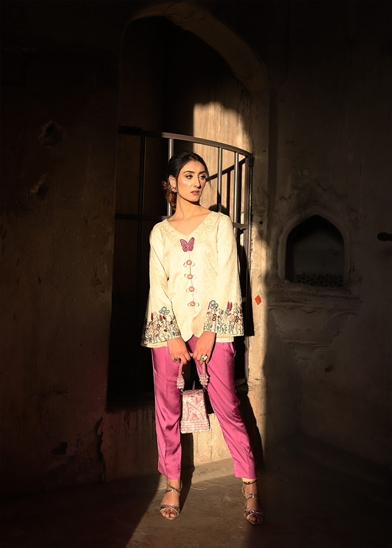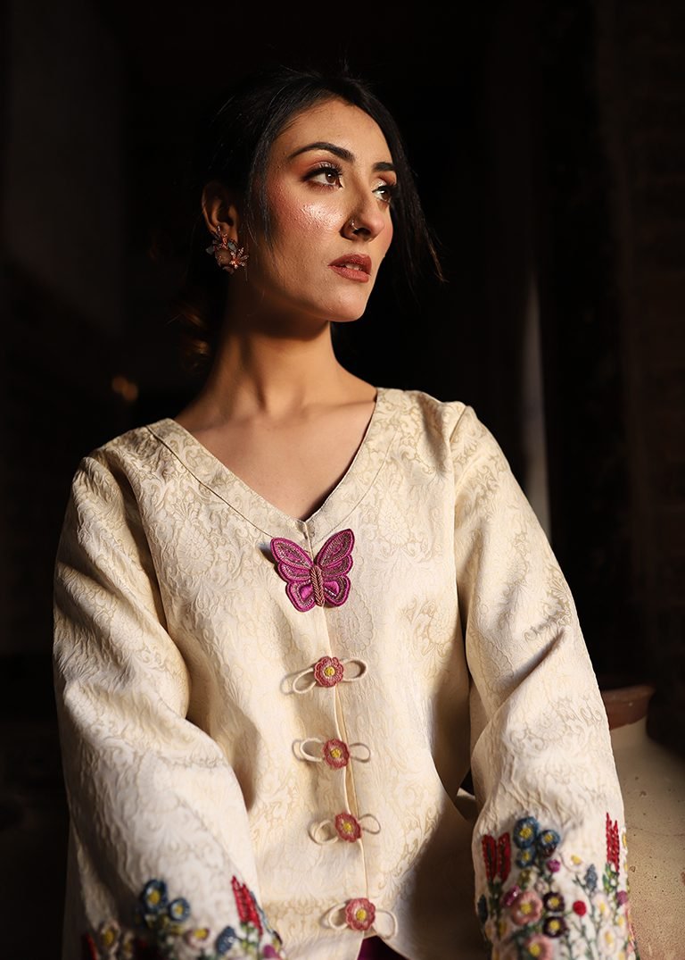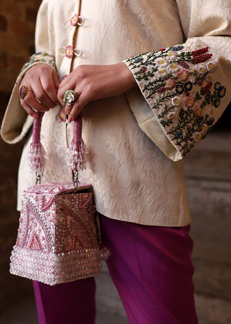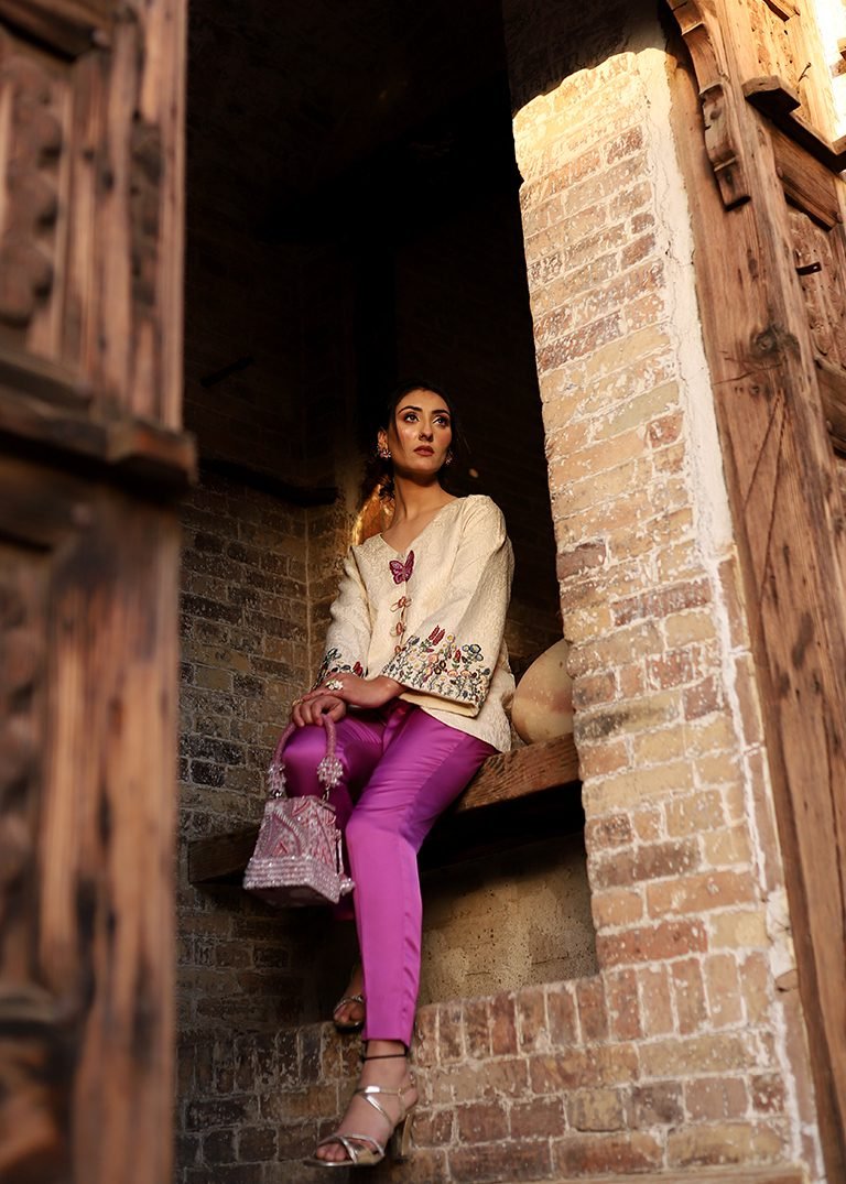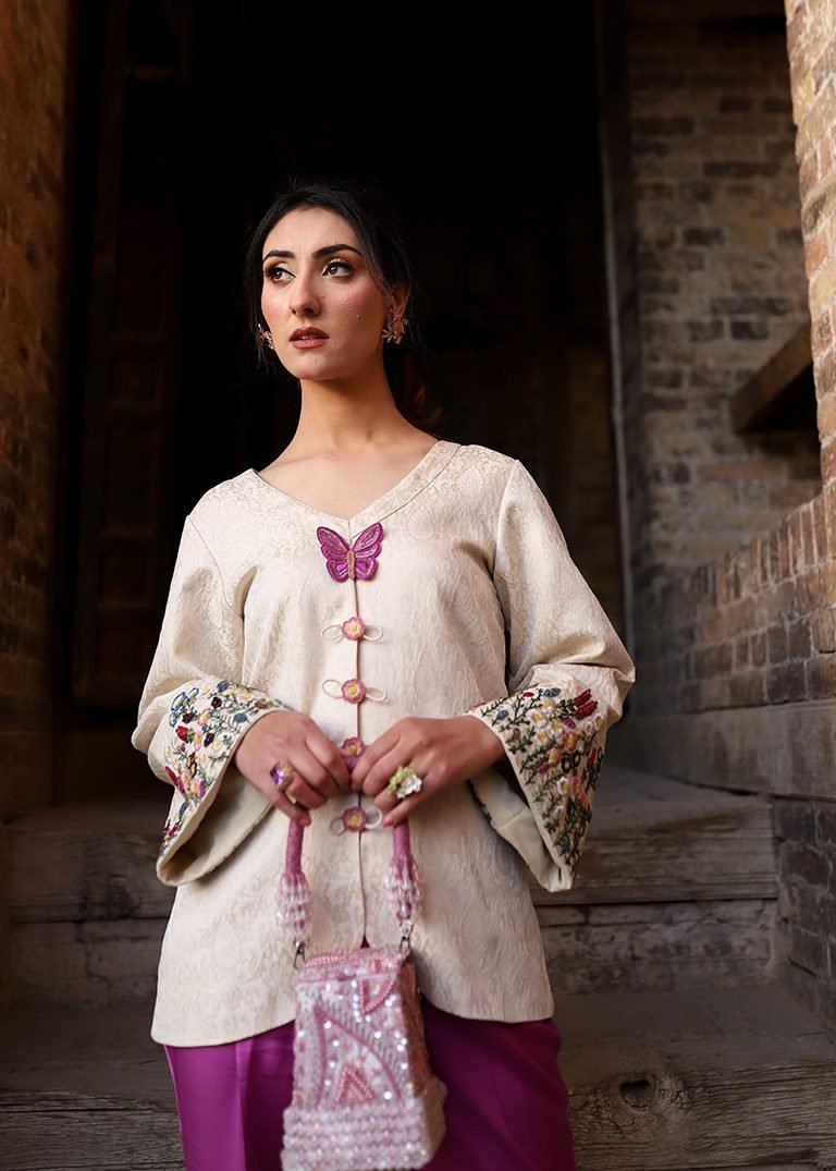 A two-piece outfit in purple and off-white, detailed with hand embroidery in resham threads and cut dana. Finished in jamawar and velvet silk for a balanced, elegant look.