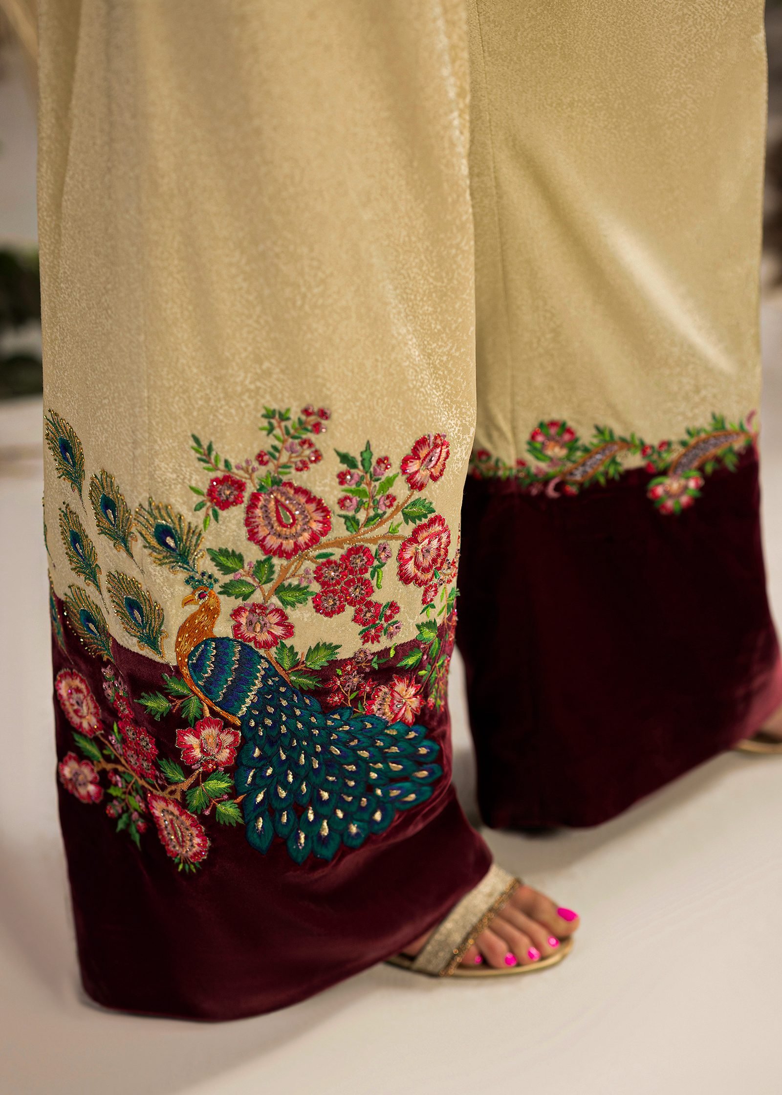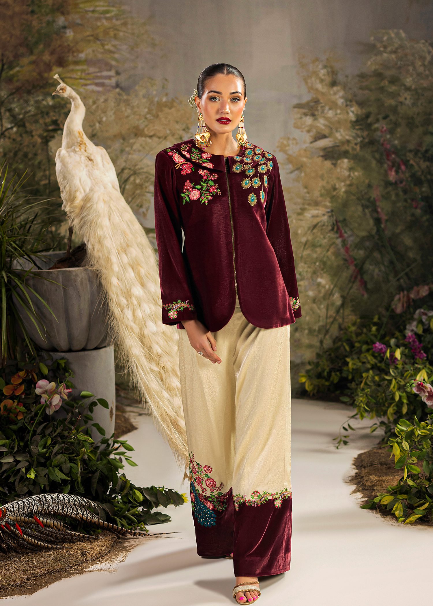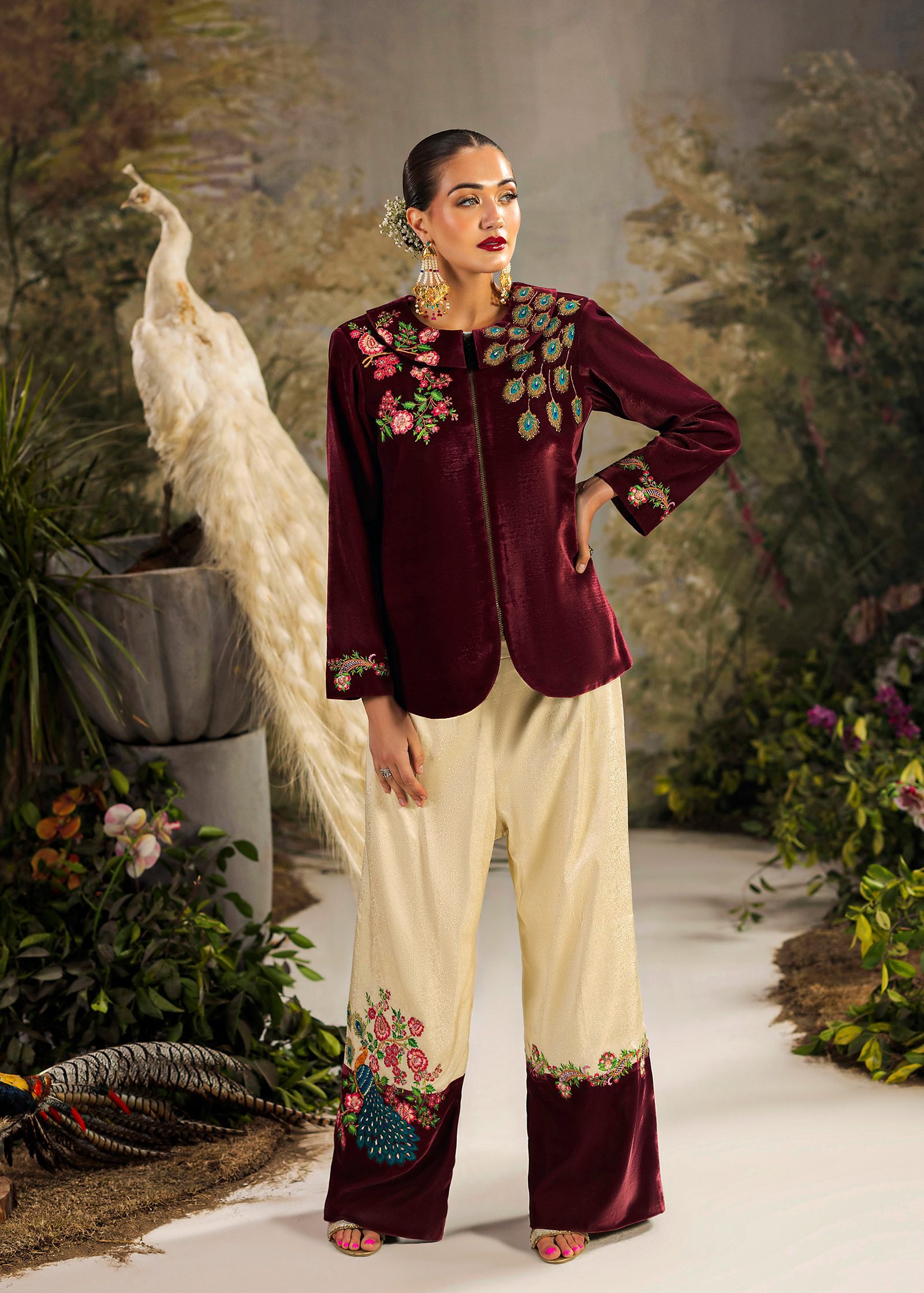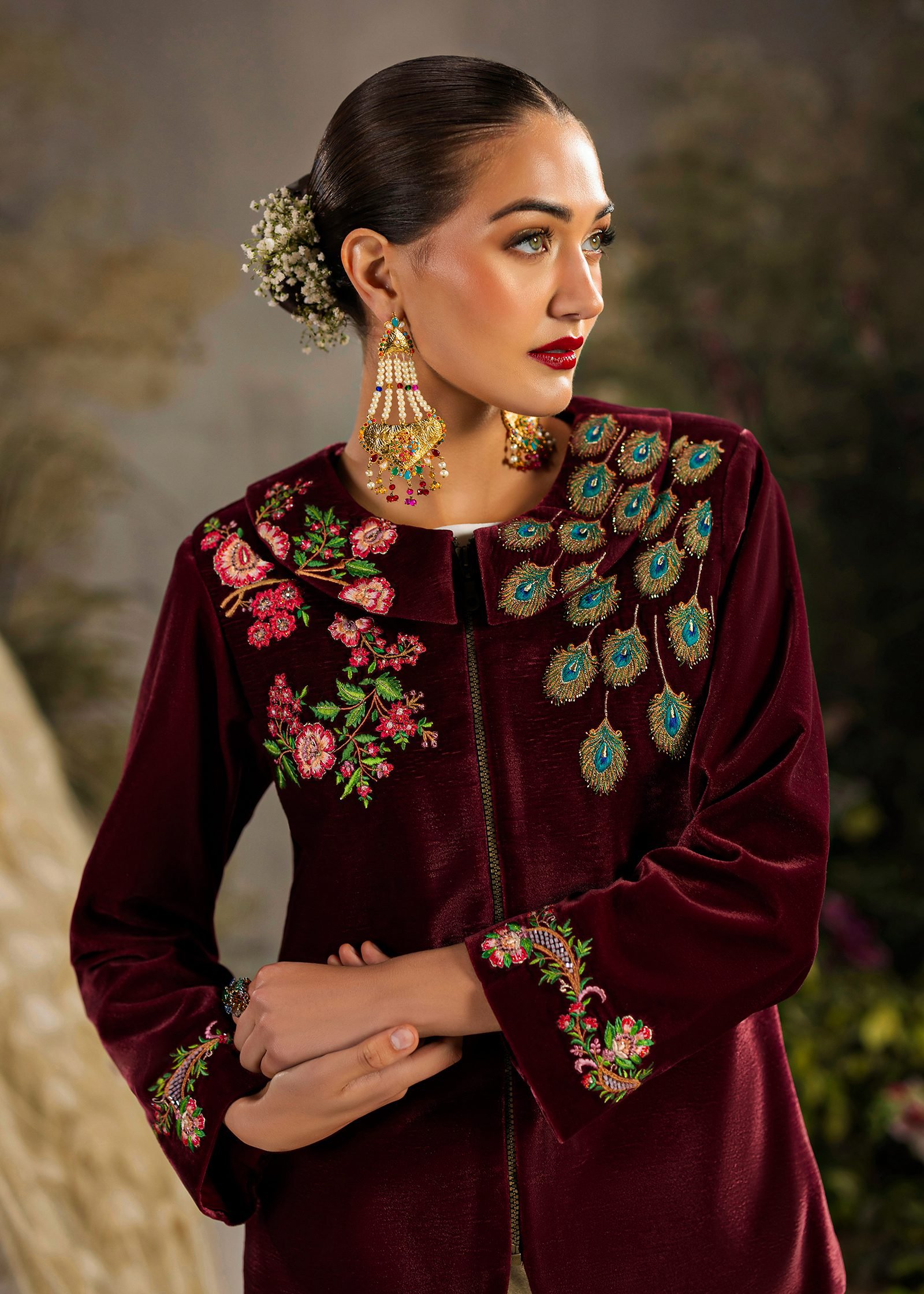 A rich maroon and butter yellow ensemble crafted in pure velvet and shamos jacquard silk. Intricate machine embroidery is enhanced with hand embellishment using cutdana, sequins, and Swarovski accents.