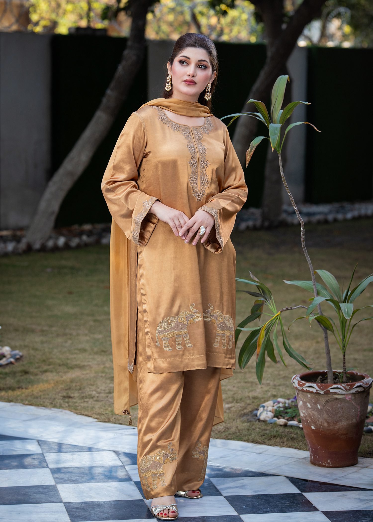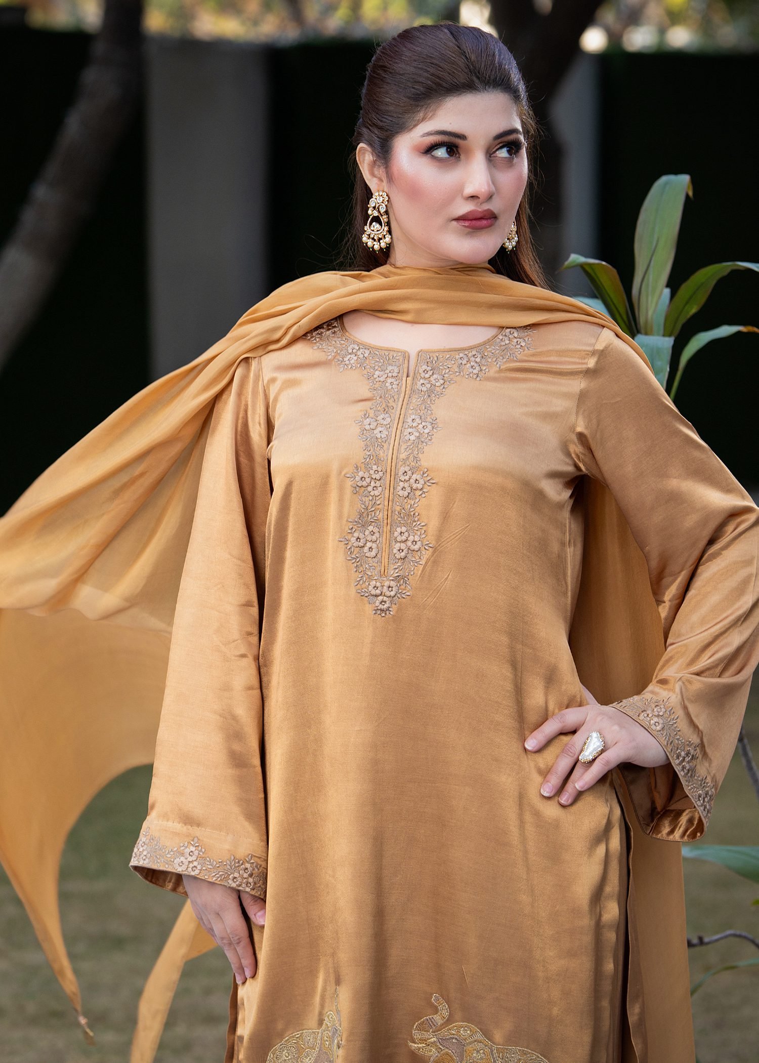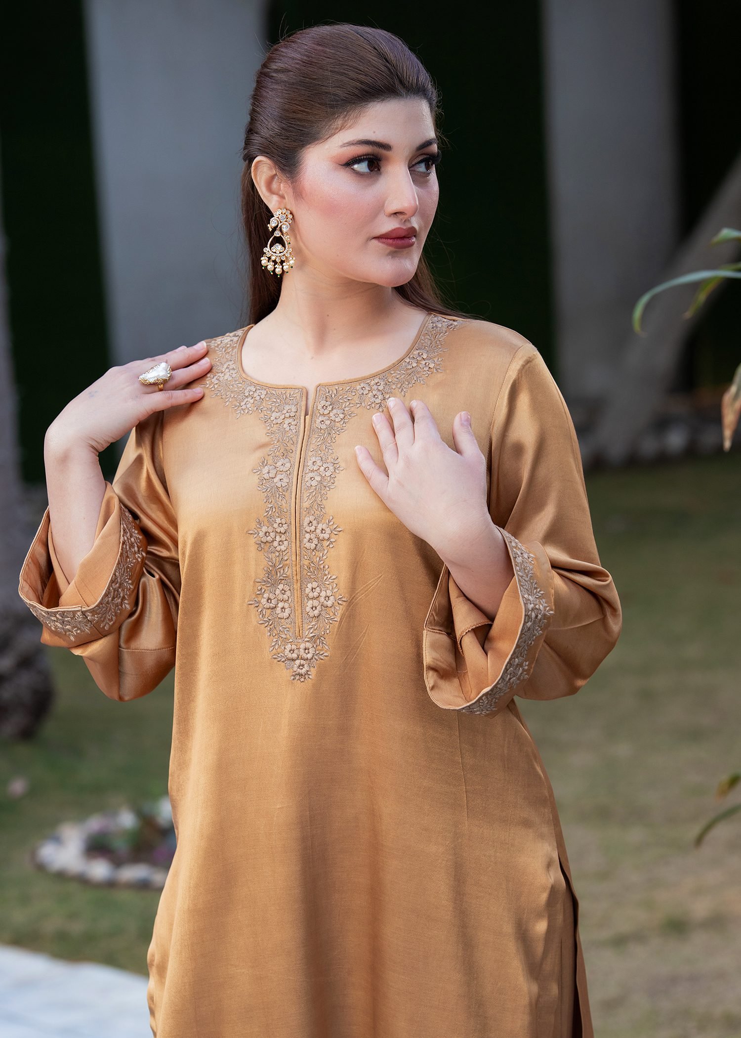 Crafted in a rich Dark Brown shade, this ensemble is tailored from smooth Shamosh silk for a structured yet comfortable fall. Fine machine embroidery executed with resham thread enhances the neckline, sleeves, and hem with defined motifs that add texture without excess.