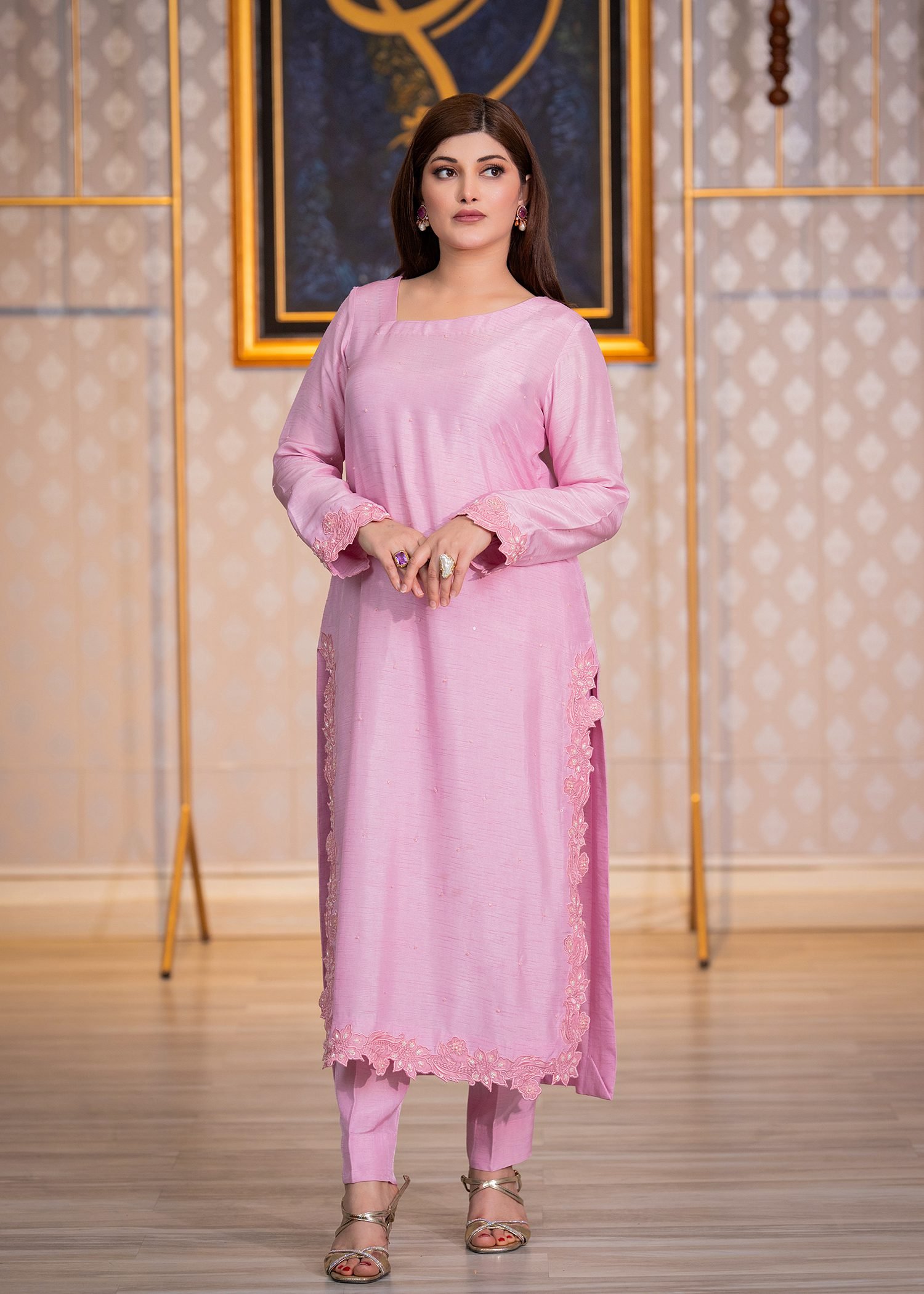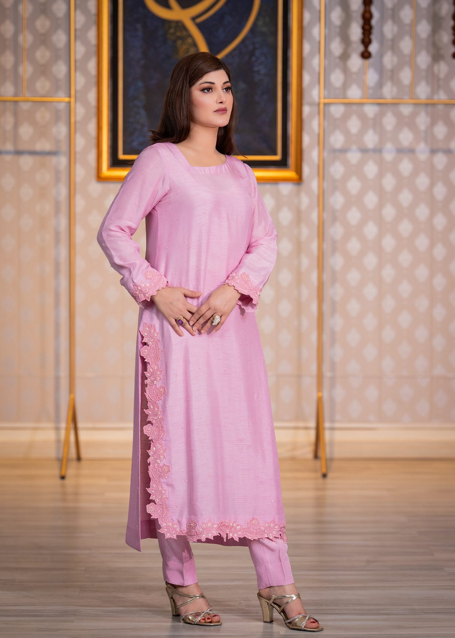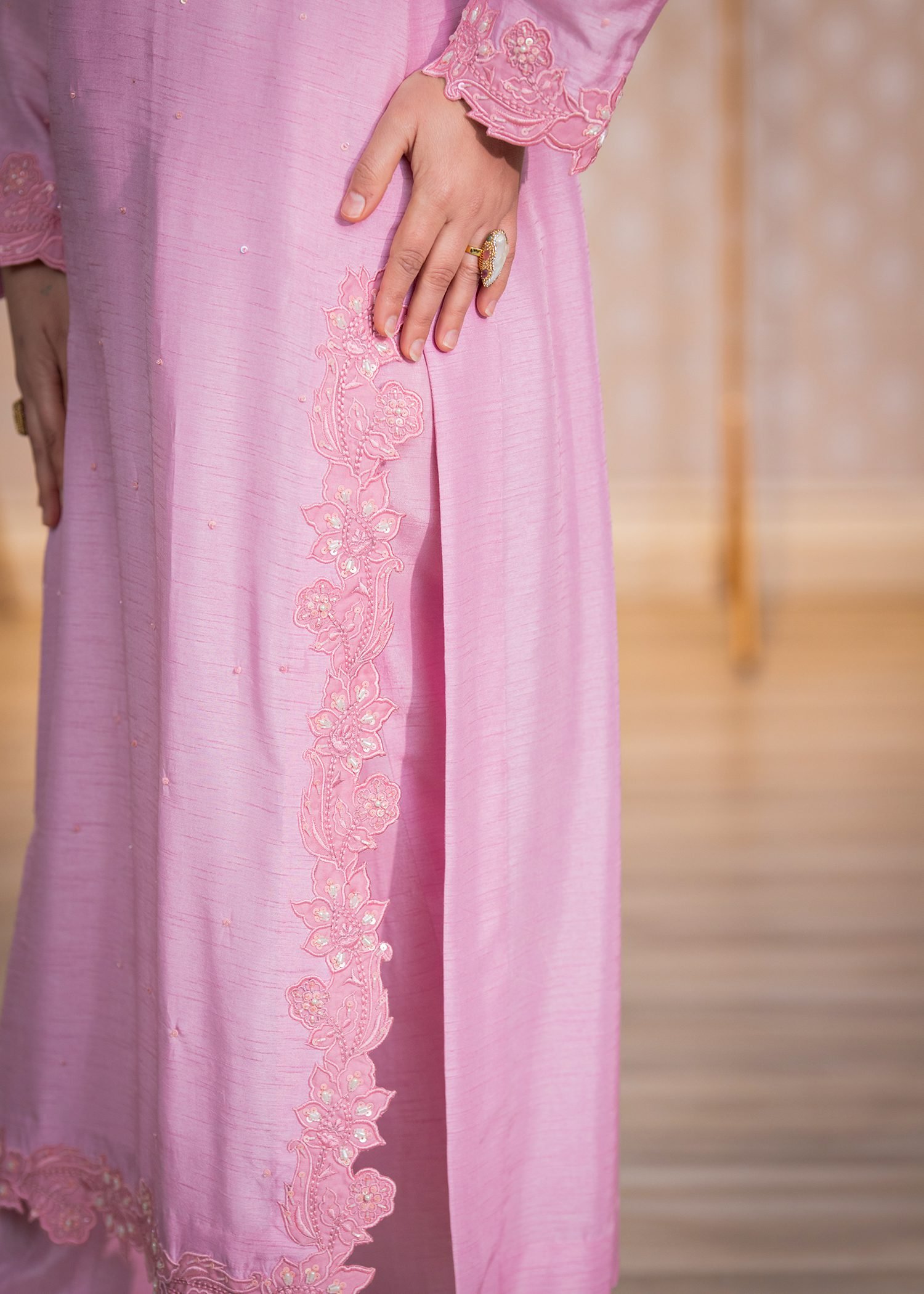 Rendered in a soft Lavender Pink, this ensemble is tailored from premium Korean silk for a smooth, structured fall. Fine machine embroidery enhances the surface with delicate texture, while hand embellishment with cutdana, sequins, and Swarovski crystals adds controlled brilliance along the borders and sleeves.